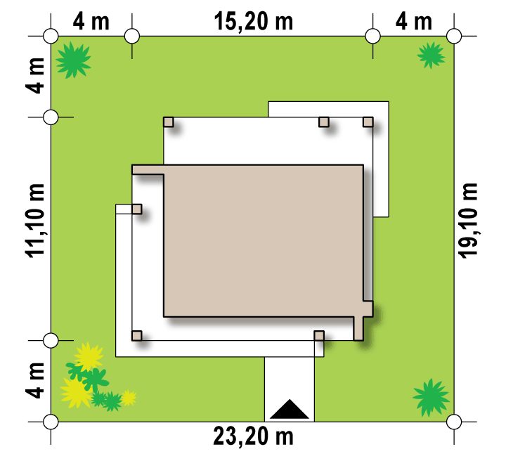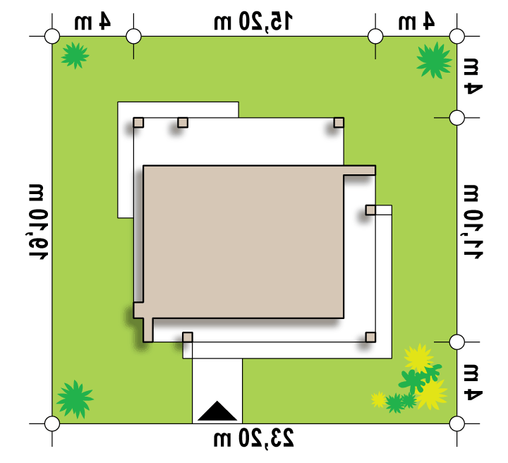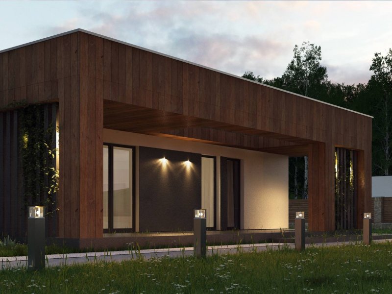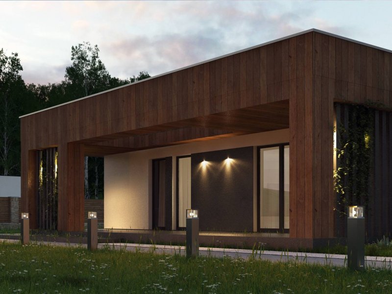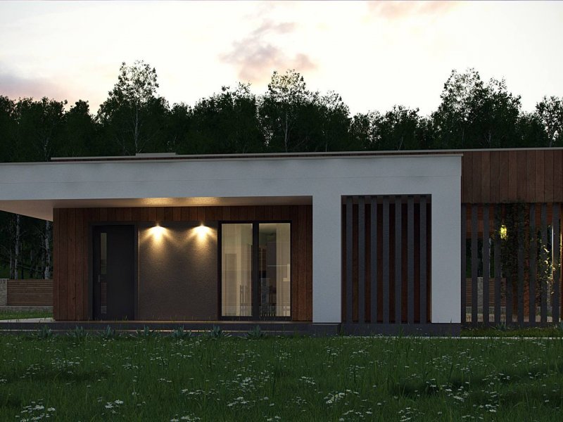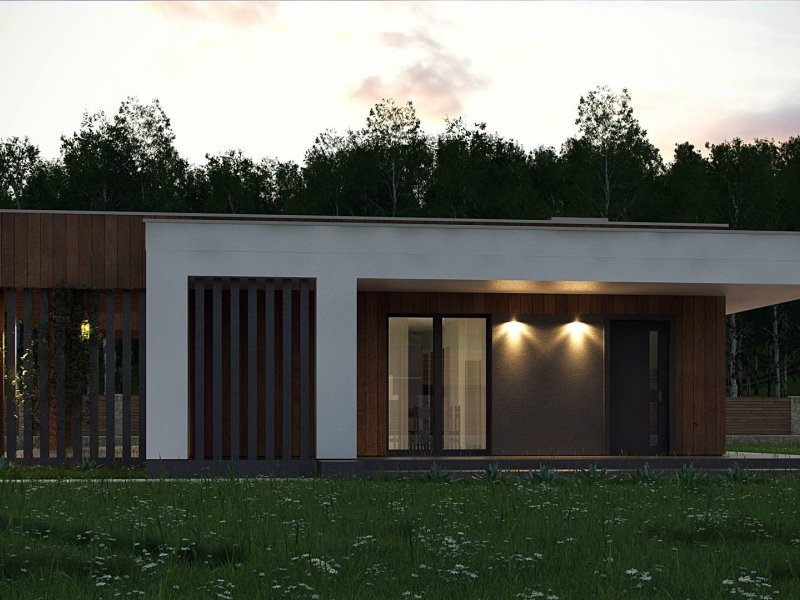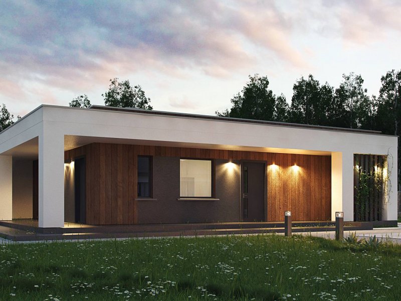 Zx76 D to parterowy budynek z płaskim dachem bez garażu. Posiada duże przeszklenia i zadaszenia nad częścią wejściową i ogrodową.