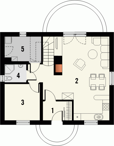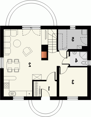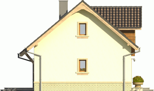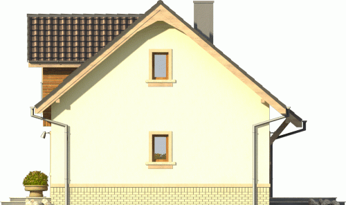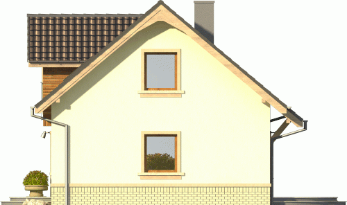 Budynek niepodpiwniczony, piętrowy bez garażu. Parter oferuje jednoprzestrzenną strefę dzienną z salonem i otwartą kuchnią oraz dodatkowy pokój z łazienką. Duże pomieszczenie gospodarcze pozwala na zastosowanie pieca na dowolny opał. Na poddaszu mieszczą się dwie następne sypialnie, łazienka, garderoba oraz strych. Dokumentacja dostępna również w odbiciu lustrzanym.
