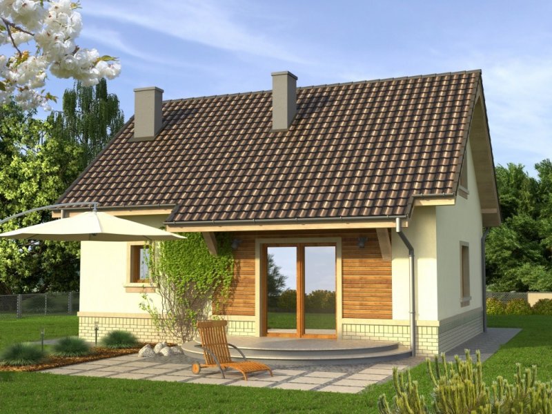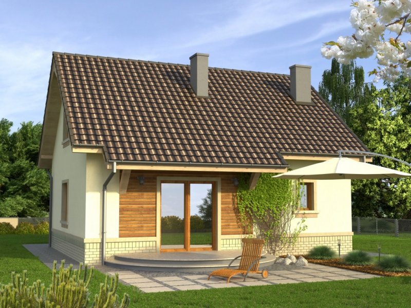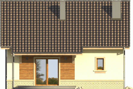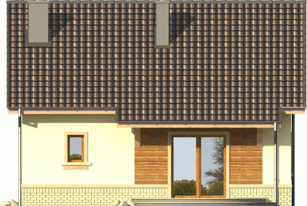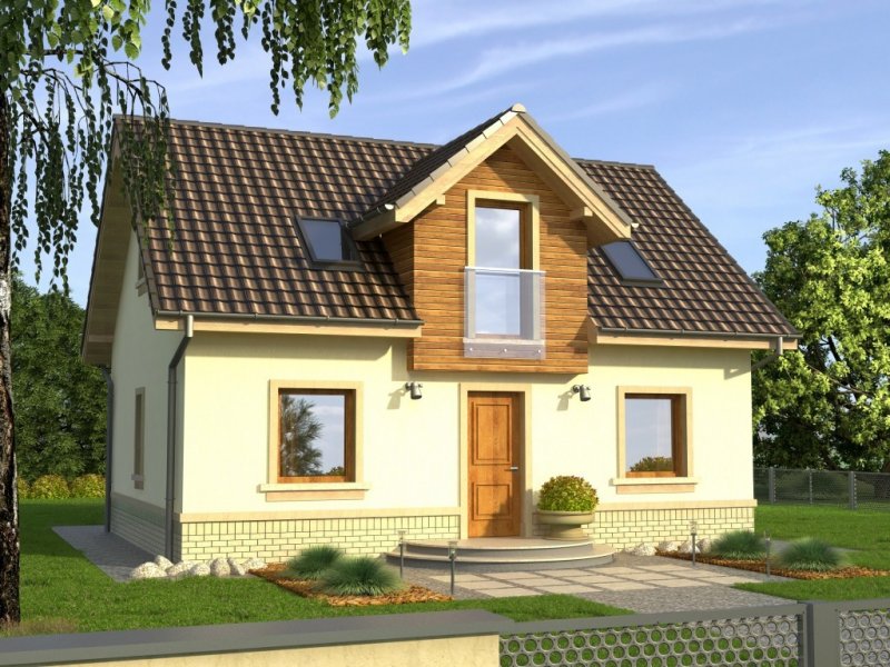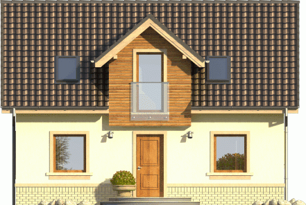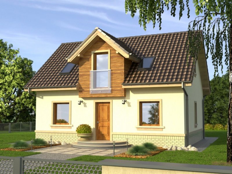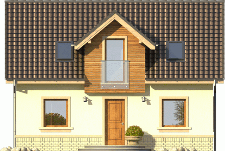 Tani w realizacji dom z dachem dwuspadowym. Ozdobą symetrycznego frontu jest wykończona deskowaniem lukarna nad wejściem. Od ogrodu uwagę zwraca ciekawie zaaranżowane wyście na taras z przedłużoną połacią dachu i dwudzielnym oknem balkonowym.