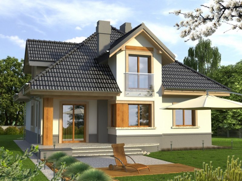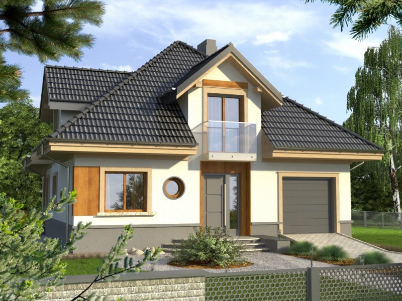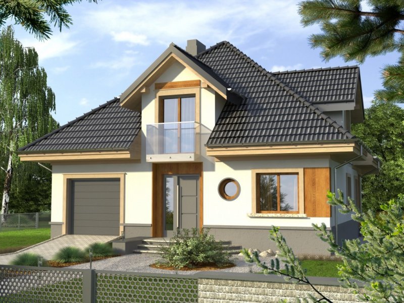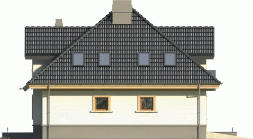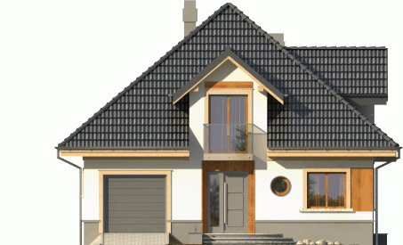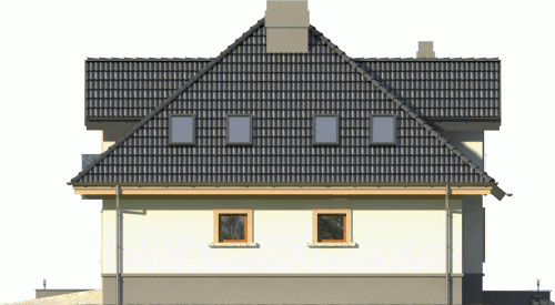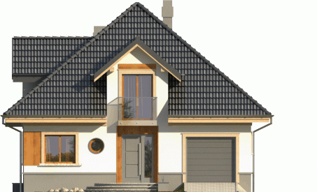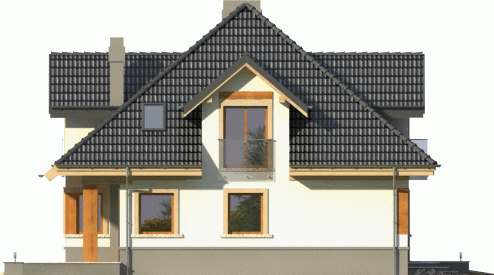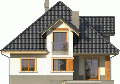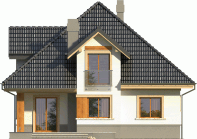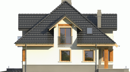 Dom jednorodzinny o bryle przykrytej kopertowym dachem. Budynek z wejściem podkreślonym przez lukarnę z balkonem ze szklaną balustradą. Atutem jest też zadaszony taras od ogrodu, na który prowadzi wyjście poprzez reprezentacyjne, dwudzielne okno balkonowe.