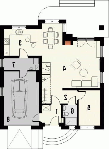 Budynek niepodpiwniczony, piętrowy z garażem wbudowanym. Na parterze obok pokoju dziennego i otwartej kuchni ze spiżarnią znajduje się dodatkowy pokój, wc z prysznicem i pomieszczenie gospodarcze oraz garaż. Na poddaszu pod dachem stromym zaprojektowano 3 sypialnie i łazienkę. Dokumentacja dostępna również w odbiciu lustrzanym.
