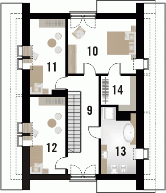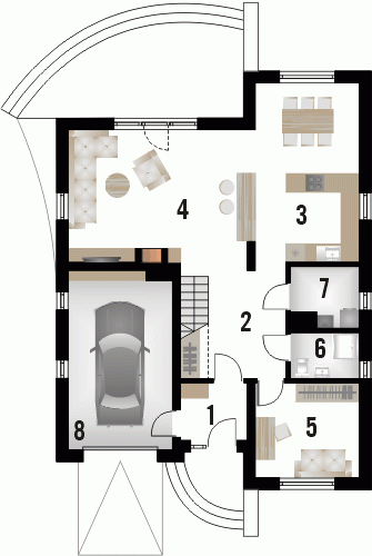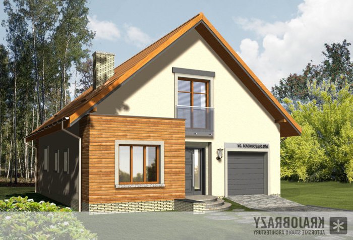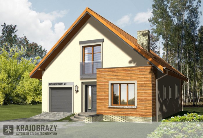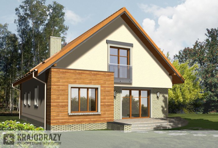 Dom jednorodzinny z grupy projektów nowoczesnych autorstwa pracowni KRAJOBRAZY. Atrakcyjny schemat funkcjonalny budynku został zamknięty w bryle o nowoczesnych detalach. Odpowiednio dobrane materiały wykończeniowe oraz kolorystyka zewnętrzna sprawiają, że dom wygląda współcześnie i będzie dobrze się prezentował w prawie każdym otoczeniu.