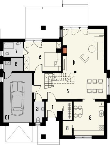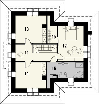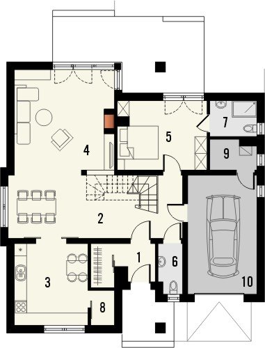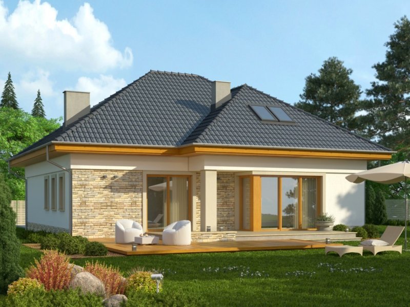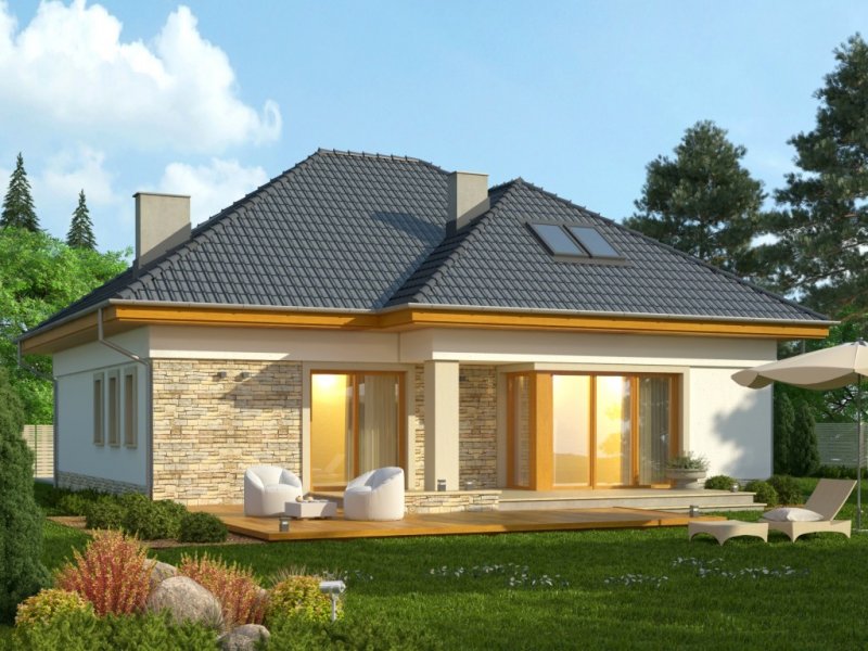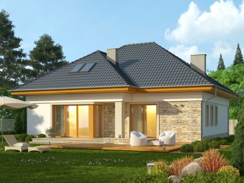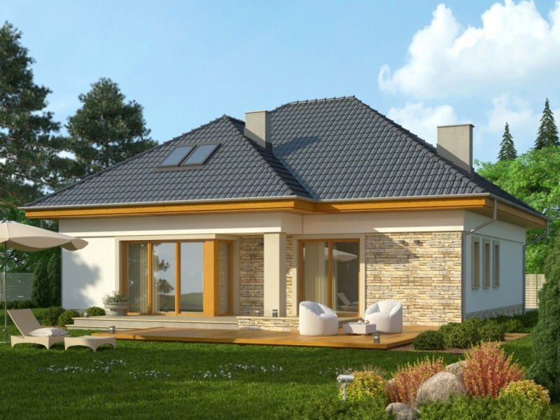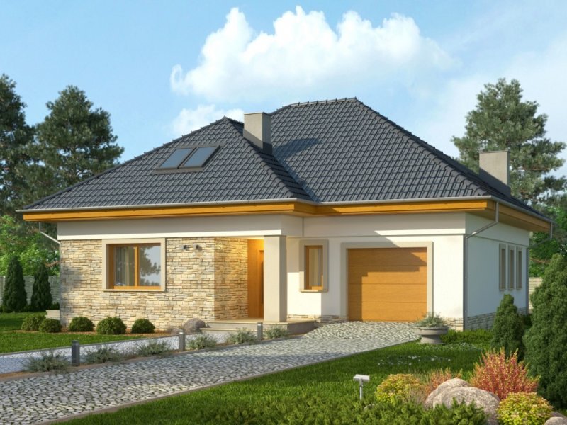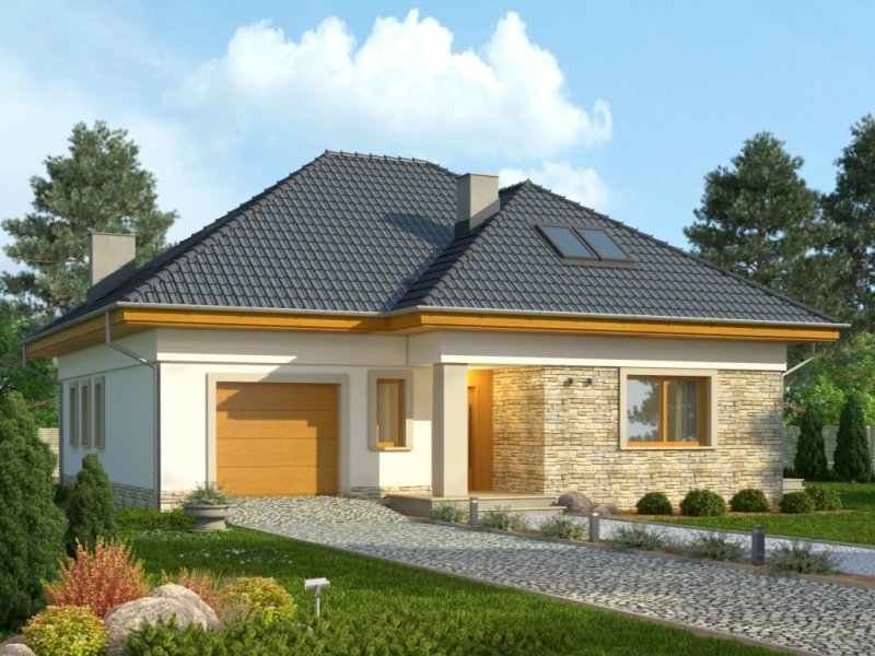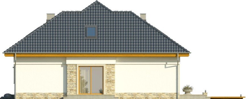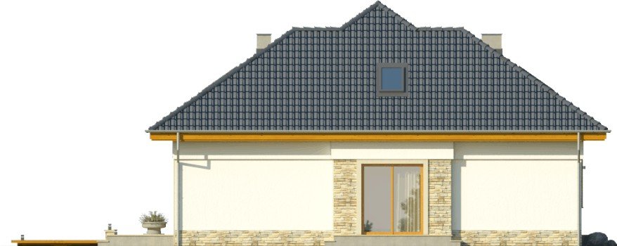 Piętrowy dom jednorodzinny przekryty czterospadowym dachem. W części parterowej budynku znajduje się przestronny salon z wydzieloną jadalnią, komfortowej wielkości kuchnia ze spiżarnią oraz dodatkowy pokój z własną łazienką. Poza tym część parteru zajmuje wbudowany garaż z pomieszczeniem gospodarczym. W poziomie piętra znajdują się trzy pokoje sypialne oraz wygodnych rozmiarów łazienka.