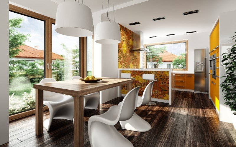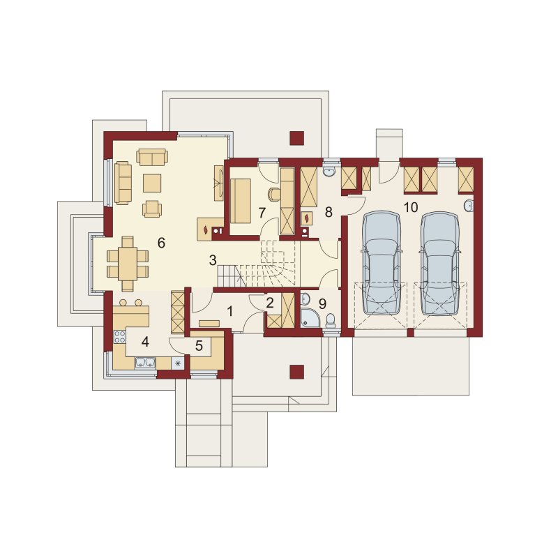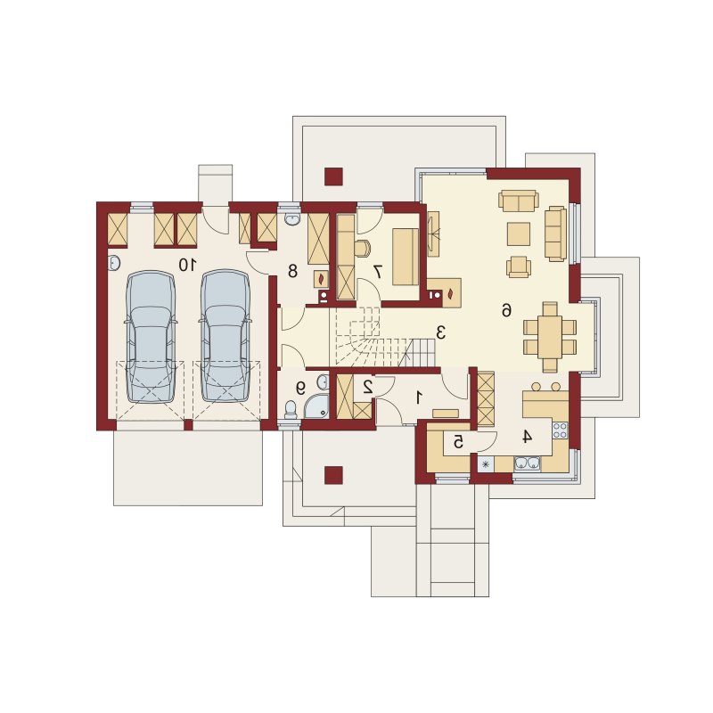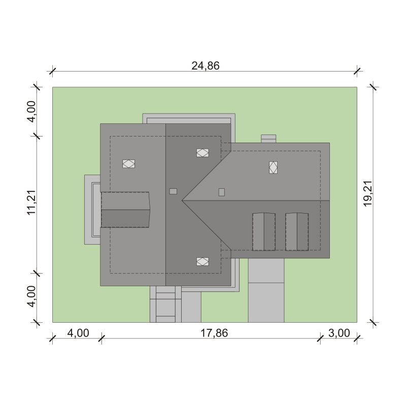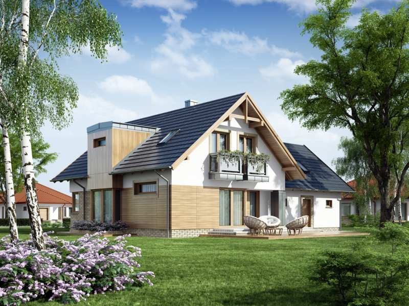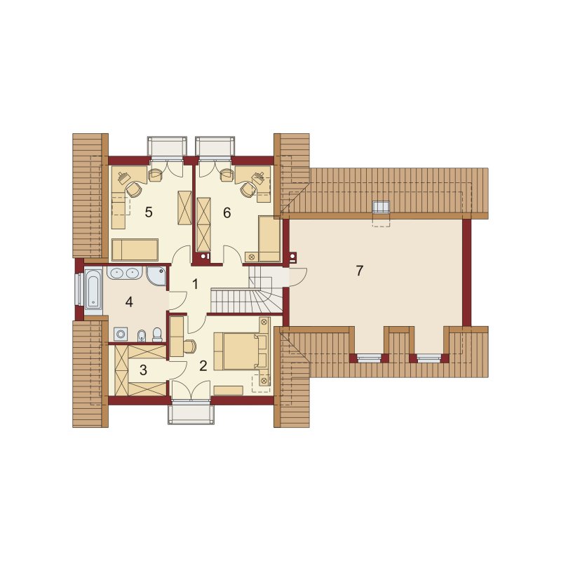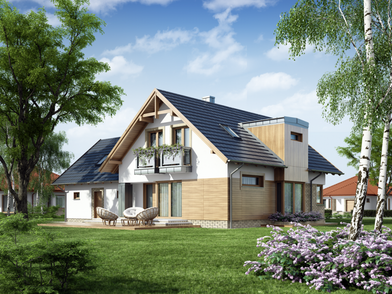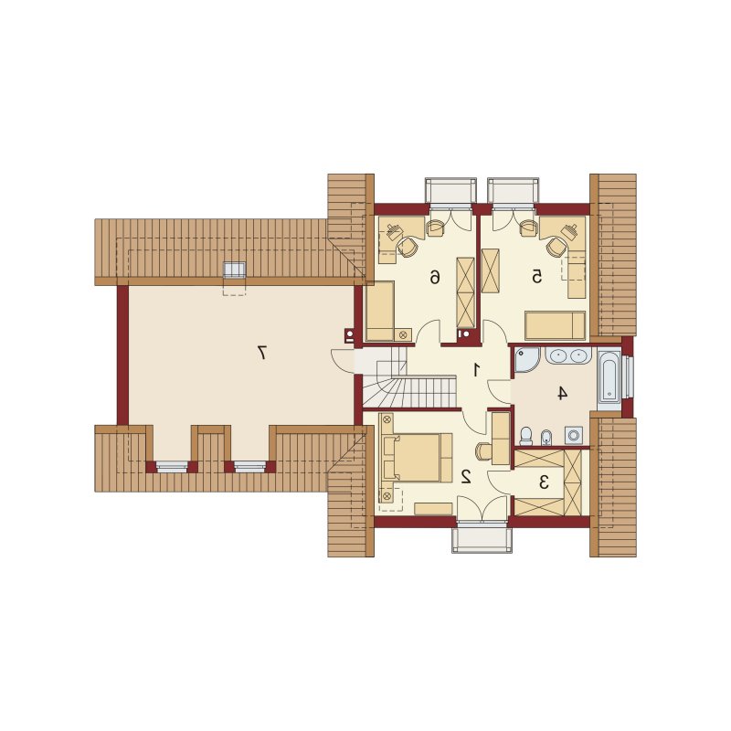 Archimedes to dom parterowy z poddaszem użytkowym, zaprojektowany dla 4-5-osobowej rodziny. Posiada prosty, klarowny rzut, jednocześnie zapewniający pełną funkcjonalność budynku. Wyróżnić można trzy strefy użytkowe: dzienną i gospodarczą na parterze oraz nocną na poddaszu. Wchodząc do domu przez wyposażony w praktyczną garderobę wiatrołap, ukazuje się obszerny salon z kominkiem. Posiada on wyodrębnioną częścią jadalnianą usytuowaną przy słonecznym wykuszu. Otwartą na salon kuchnię można przekształcić w zamkniętą stawiając lekką ściankę działową. Dopełnieniem dla kuchni jest użyteczna spiżarnia oświetlona światłem dziennym. Bezpośrednio przy wejściu znajduje się także pokój, który dzięki swej lokalizacji może pełnić rolę gabinetu, pokoju gościnnego lub kolejnej sypialni. Na parterze oprócz strefy dziennej, na którą składają się m.in. wyżej wymienione pomieszczenia, znajduje się część gospodarcza. W jej skład wchodzi pomieszczenie gospodarcze/kotłownia oraz jednostanowiskowy garaż ze specjalnie wydzieloną, dostępną od strony ogrodu częścią np. na składowanie narzędzi ogrodniczych. Poddasze stanowi w całości strefa nocna. Każda z trzech sypialni posiada indywidualny balkon, a jedna z nich dodatkowo własną garderobę. Znajduje się tam również doświetlony naturalnym światłem obszerny salon łazienkowy. Istnieje także możliwość adaptacji strychu na cele mieszkalne i uzyskania tym samym dodatkowej sypialni czy pokoju hobby.