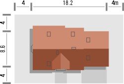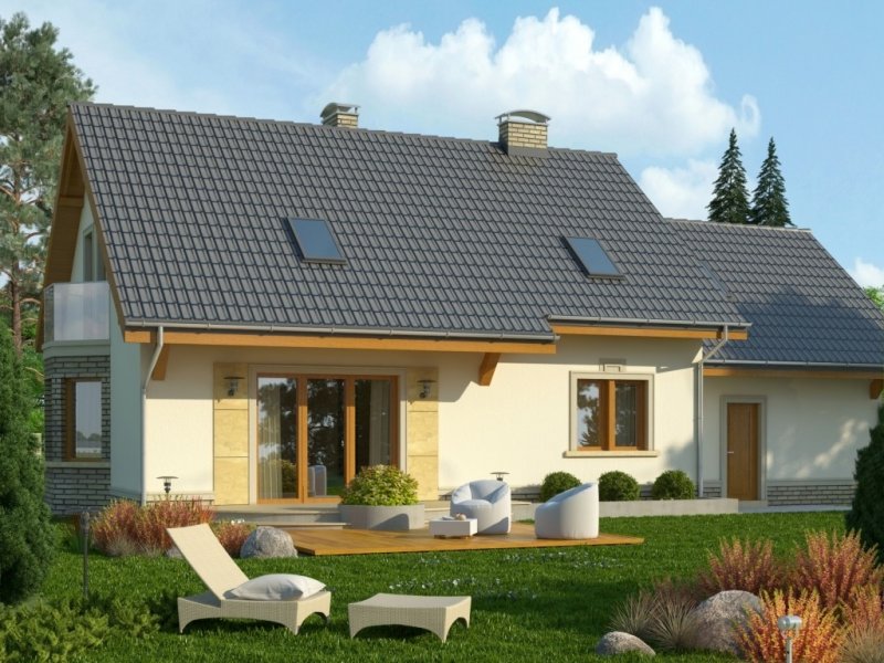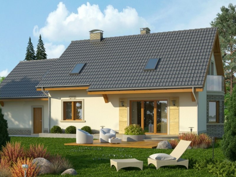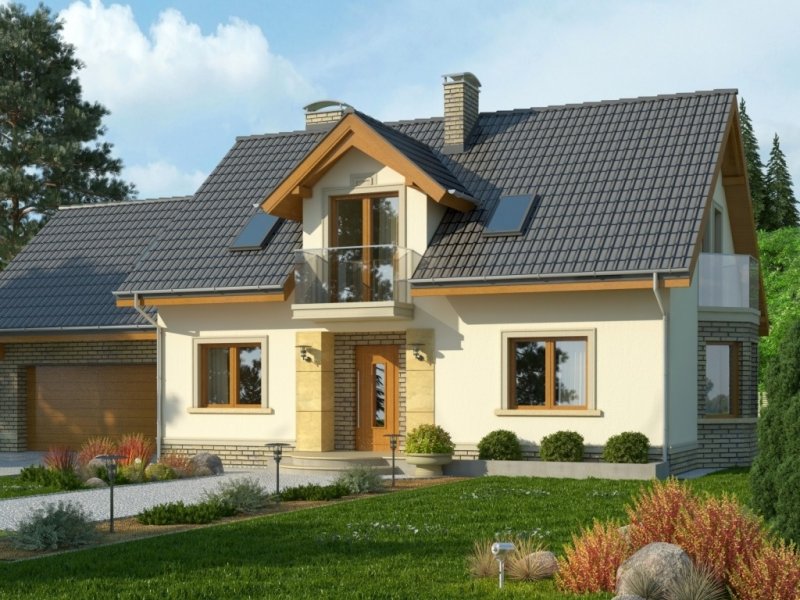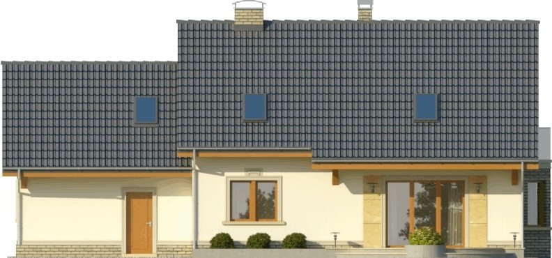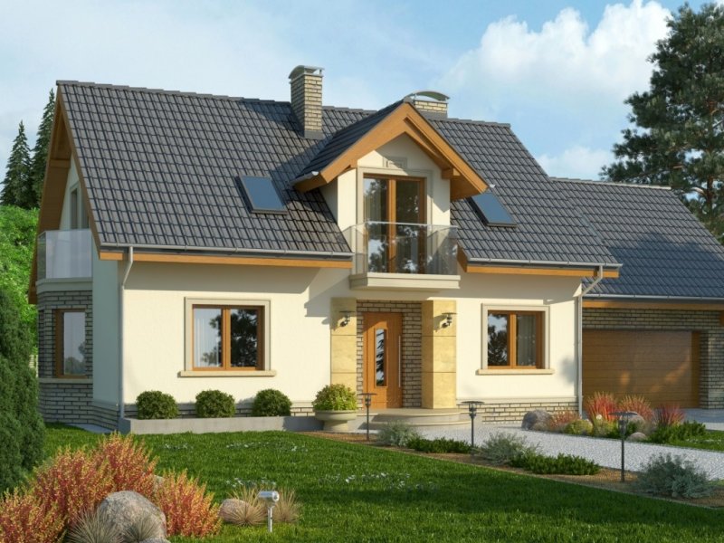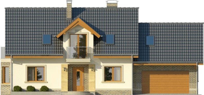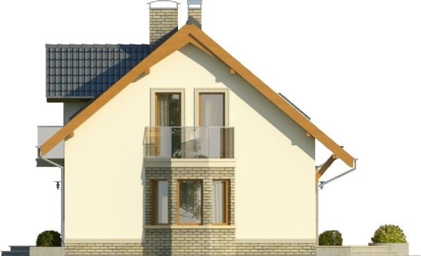 Atrakcyjny dom przykryty dachem dwuspadowym. Wejście podkreślono lukarną oraz balkonem ze szklaną balustradą. Ciekawym elementem jest wykusz jadalni obłożony płytką klinkierową.