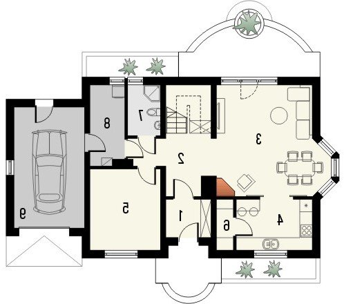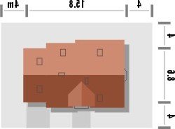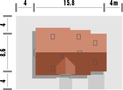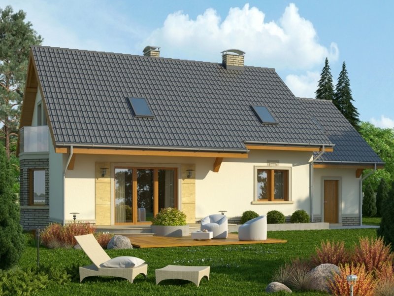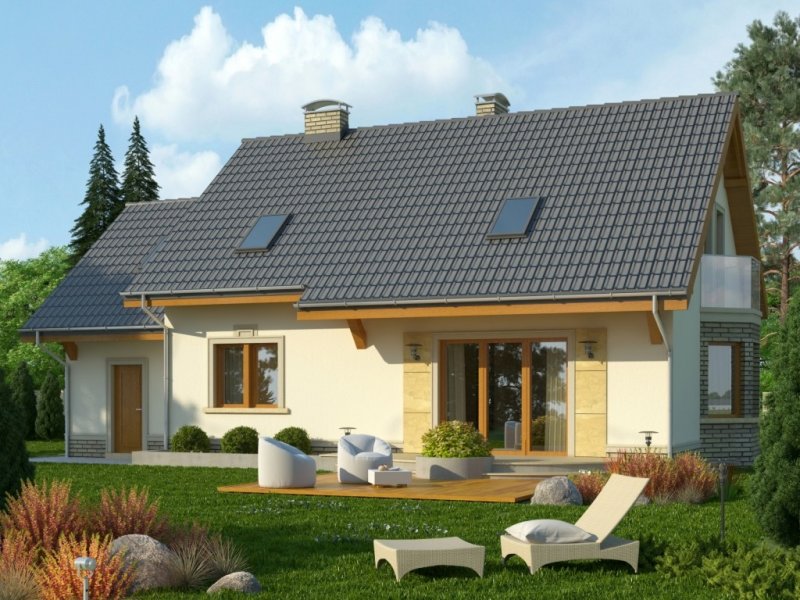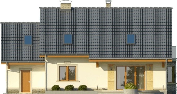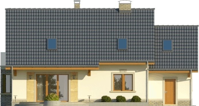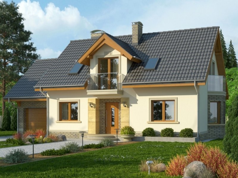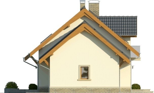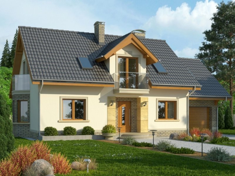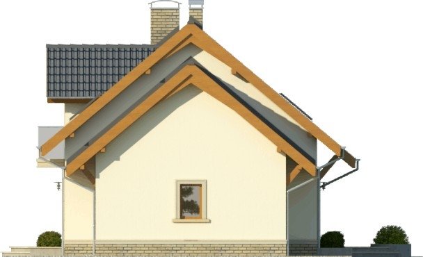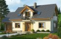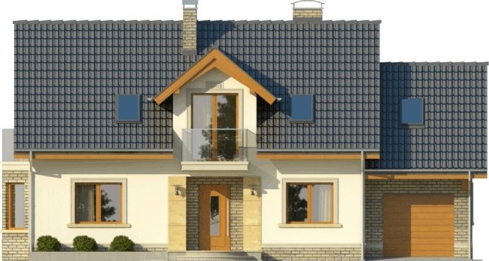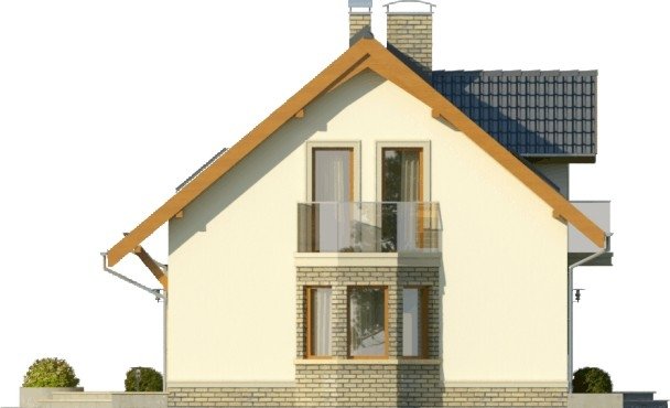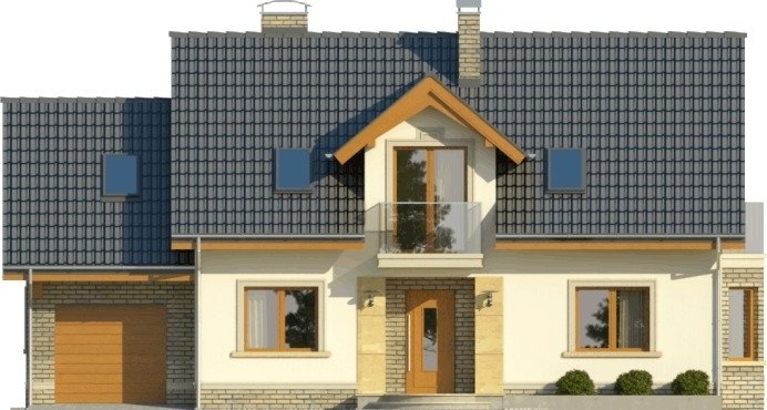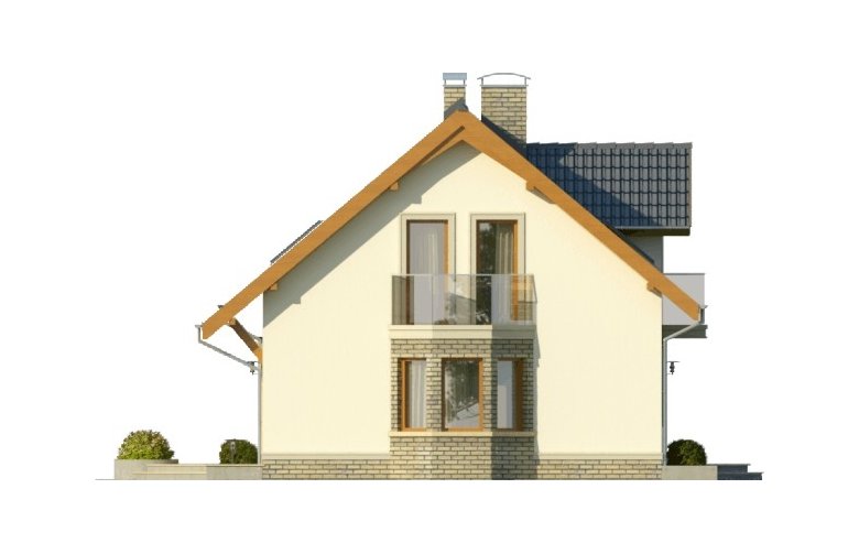 Atrakcyjny dom o prostej bryle przykrytej dachem dwuspadowym z garażem dostawionym z boku. Centralne, reprezentacyjne wejście podkreślone zostało poprzez lukarnę i balkon powyżej. Ozdobą ściany szczytowej jest wykusz jadalni.