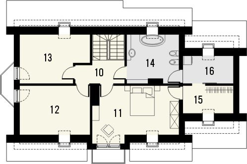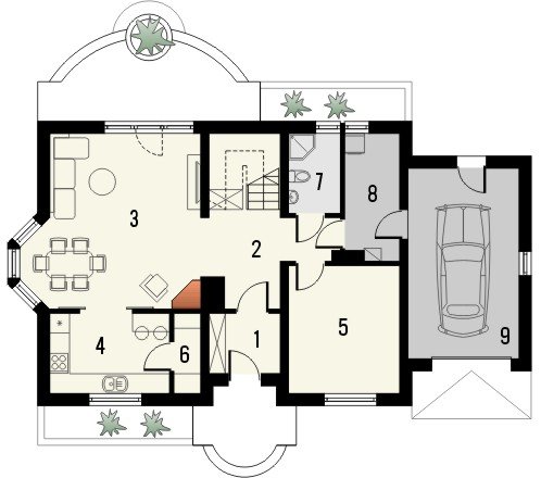 Budynek niepodpiwniczony, piętrowy z garażem jednostanowiskowym. Na parterze znajduje się pokój dzienny z jadalnią, otwarta kuchnia z przylegającą spiżarnią, dodatkowy pokój, łazienka i pomieszczenie gospodarcze. Na poddaszu pod dachem stromym zaprojektowano 3 sypialnie (jedna z nich z garderobą), łazienkę oraz pralnię. Dokumentacja dostępna również w odbiciu lustrzanym.