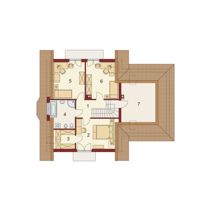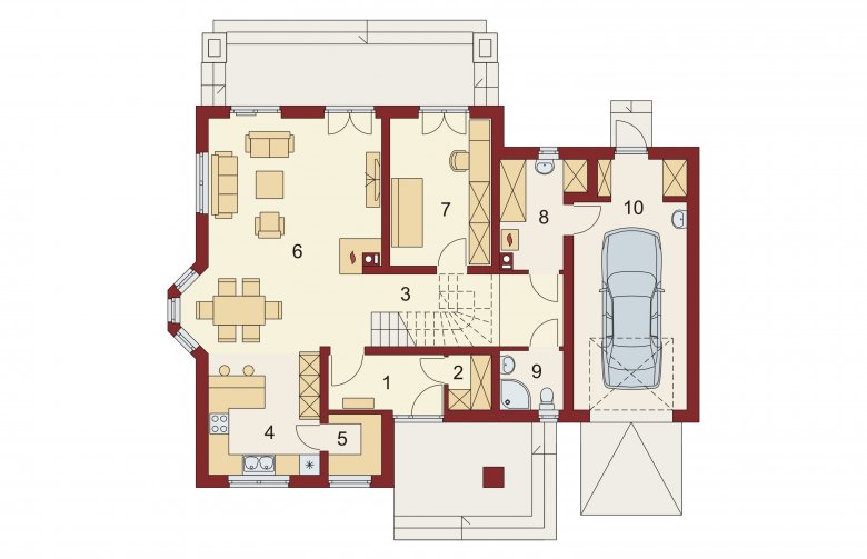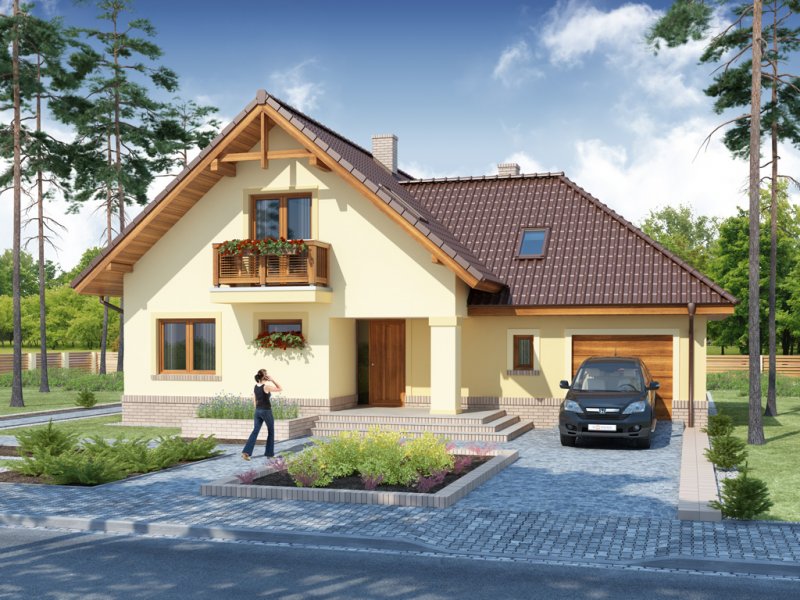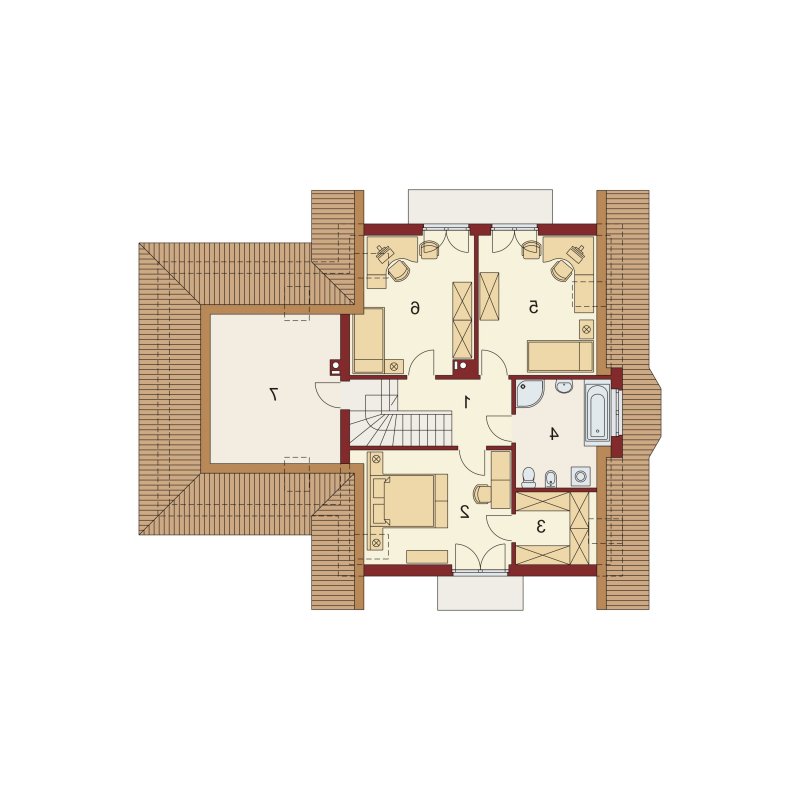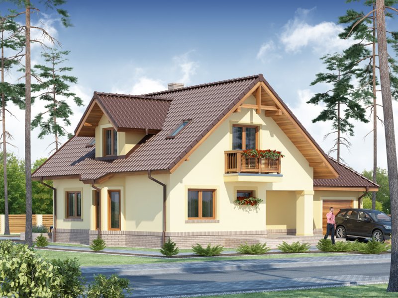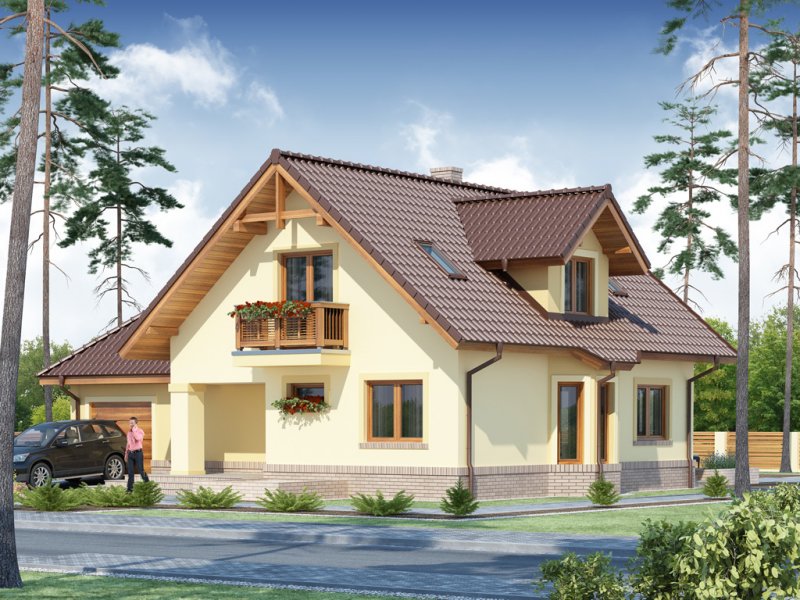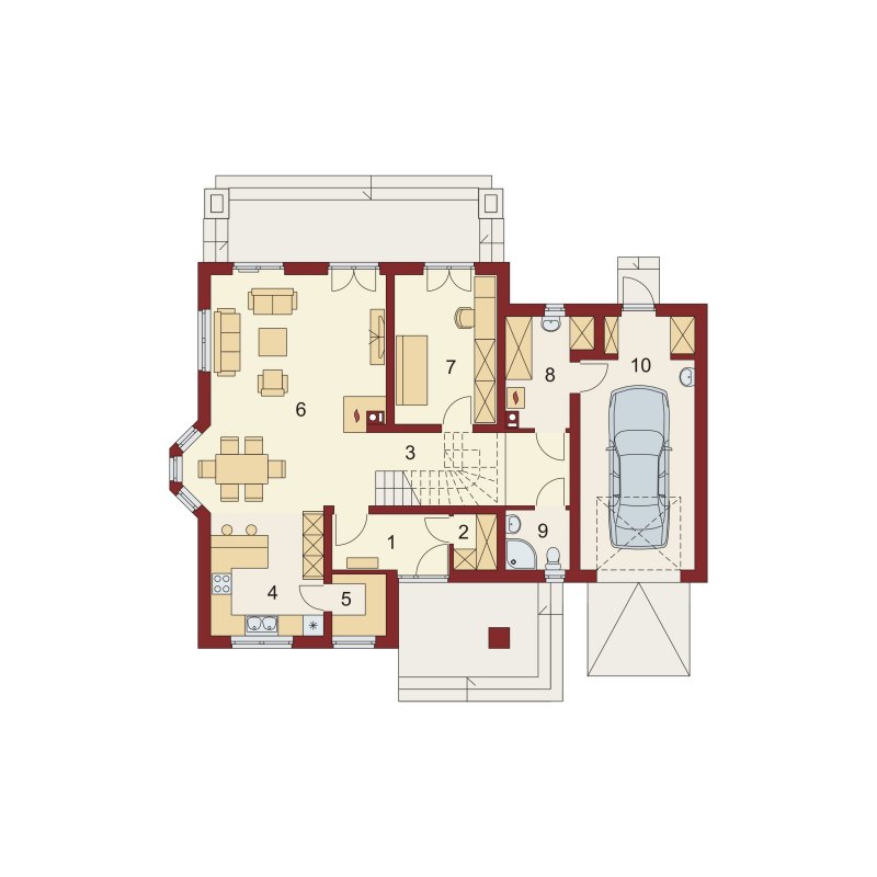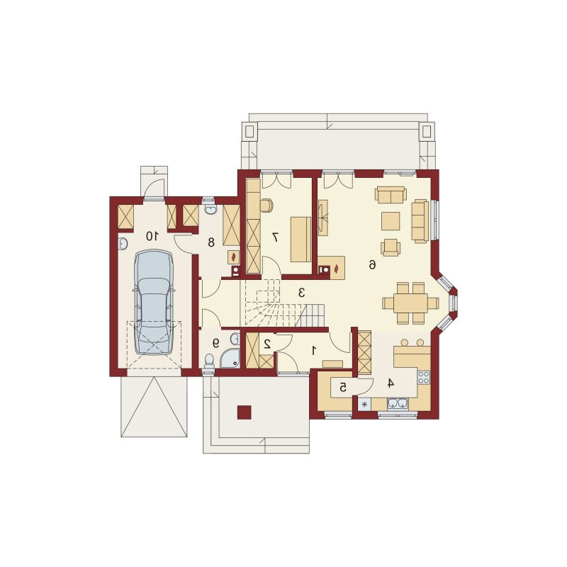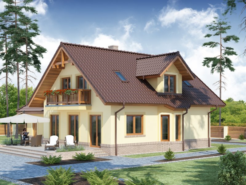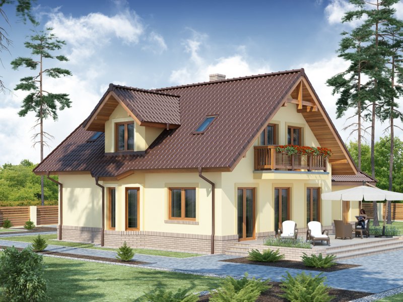 Arystokles to dom parterowy z poddaszem użytkowym, zaprojektowany dla 4-5-osobowej rodziny. Posiada prosty, klarowny rzut, jednocześnie zapewniający pełną funkcjonalność budynku. Wyróżnić można trzy strefy użytkowe: dzienną i gospodarczą na parterze oraz nocną na poddaszu. Wchodząc do domu przez wyposażony w praktyczną garderobę wiatrołap, ukazuje się obszerny salon z kominkiem. Posiada on wyodrębnioną częścią jadalnianą usytuowaną przy słonecznym wykuszu. Otwartą na salon kuchnię można przekształcić w zamkniętą stawiając lekką ściankę działową. Dopełnieniem dla kuchni jest użyteczna spiżarnia oświetlona światłem dziennym. Bezpośrednio przy wejściu znajduje się także pokój, który dzięki swej lokalizacji może pełnić rolę gabinetu, pokoju gościnnego lub kolejnej sypialni. Na parterze oprócz strefy dziennej, na którą składają się m.in. wyżej wymienione pomieszczenia, znajduje się część gospodarcza. W jej skład wchodzi pomieszczenie gospodarcze/kotłownia oraz jednostanowiskowy garaż ze specjalnie wydzieloną, dostępną od strony ogrodu częścią np. na składowanie narzędzi ogrodniczych. Poddasze stanowi w całości strefa nocna. Każda z trzech sypialni posiada indywidualny balkon, a jedna z nich dodatkowo własną garderobę. Znajduje się tam również doświetlony naturalnym światłem obszerny salon łazienkowy. Istnieje także możliwość adaptacji strychu na cele mieszkalne i uzyskania tym samym dodatkowej sypialni czy pokoju hobby.