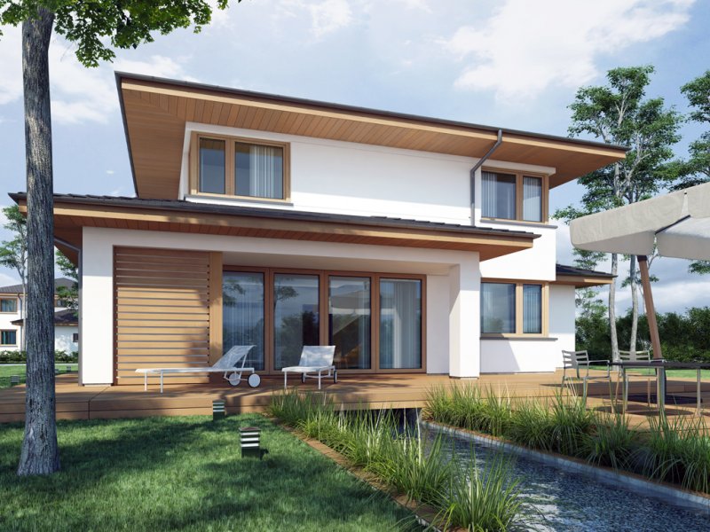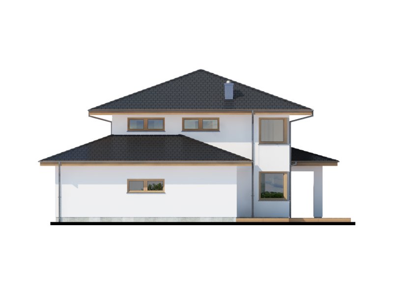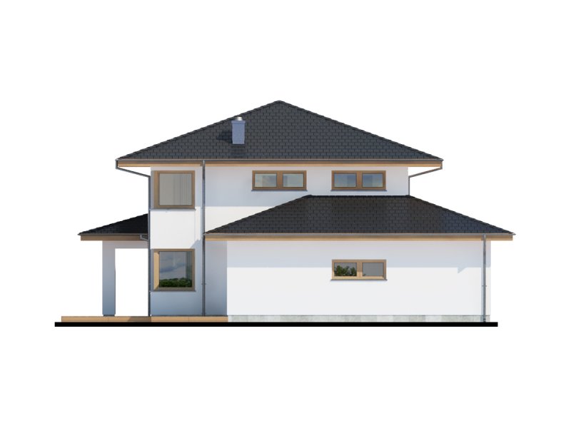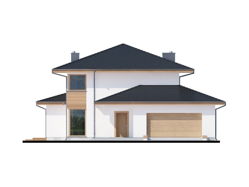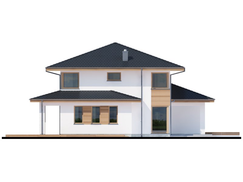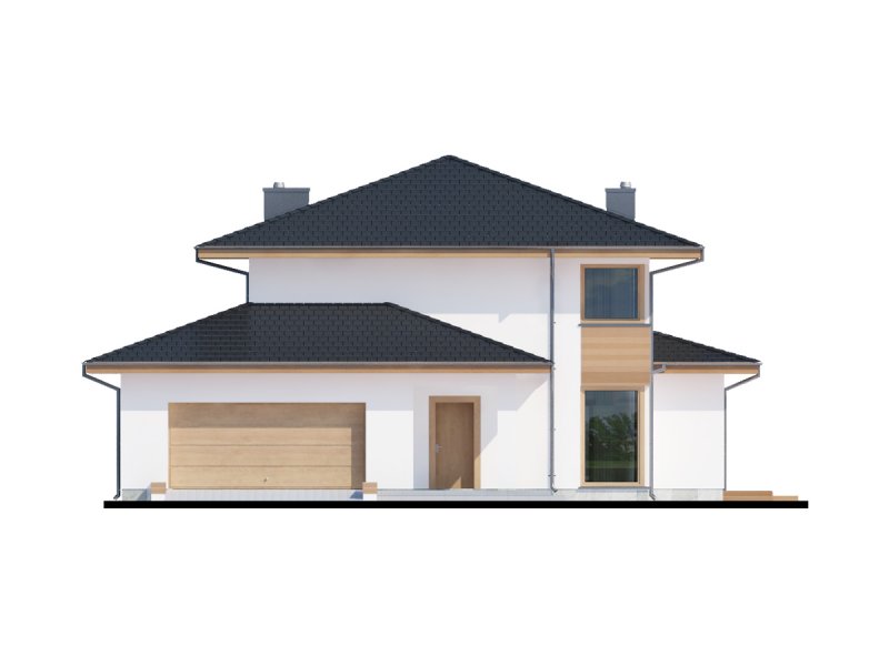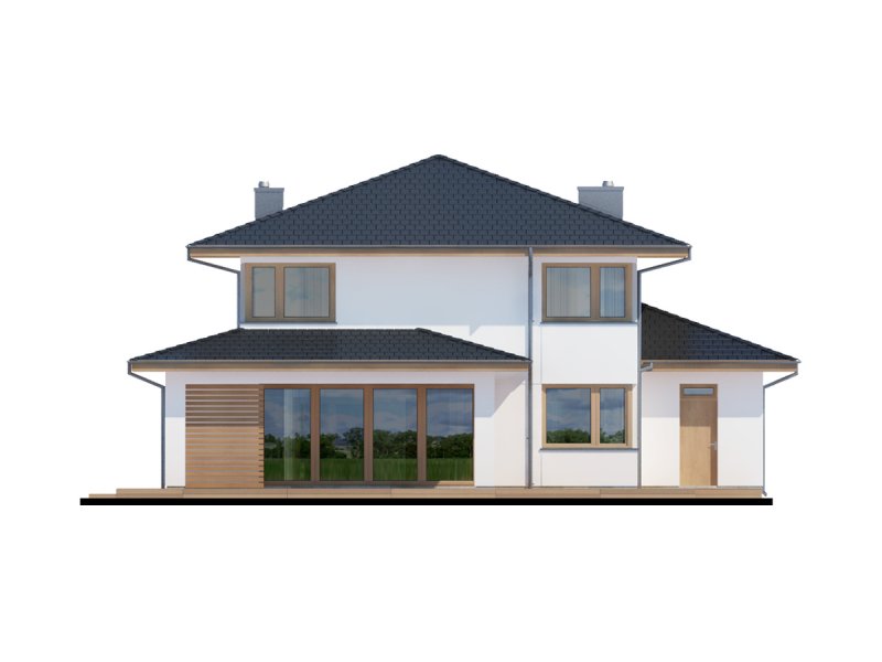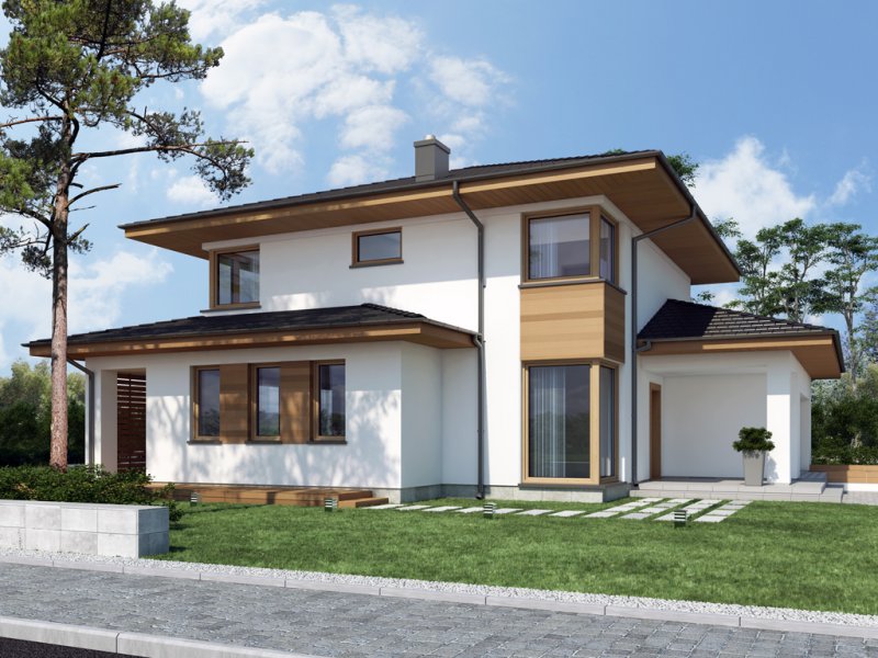Dom piętrowy, przestronny, wygodny, idealny dla 4 do 5-osobowej rodziny. Aslan 2 to także przykuwające uwagę duże przeszklenia, nowoczesna bryła, „złagodzona” użytym na elewacji i tarasach drewnem, czytelne rzuty. Bezpośrednio po wkroczeniu do domu wzrok przyciąga okazałe przeszklenie salonu, za którym maluje się okoliczny pejzaż. Zadaszenie nad dużym tarasem skutecznie chroni przed upalnym letnim słońcem, wpuszcza natomiast zimowe, padające pod niskim kątem promienie słoneczne, a także zabezpiecza przed deszczem. Na parterze oprócz wspomnianego obszernego salonu oraz przylegającej do niego kuchni, tuż przy strefie wejściowej znajduje się także dodatkowy pokój. Dzięki swojej lokalizacji może pełnić rolę pokoju do pracy, gościnnego lub TV. Praktycznym rozwiązaniem jest także wejście do pomieszczenia gospodarczego od zewnątrz, co ułatwia np. prace wokół domu. Pierwsze piętro to typowa część nocna. Zajmują je trzy sypialnie oraz garderoby i łazienki. Jedna z sypialni jest wyposażona w indywidualną garderobę i łazienkę, które po połączeniu w całość mogą się przekształcić w wygodny, dostępny z hallu salon kąpielowy.
