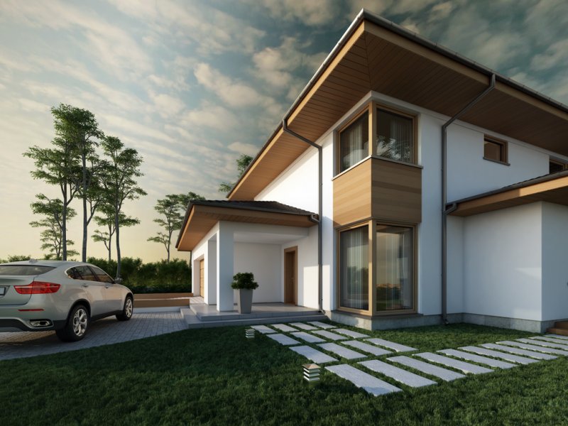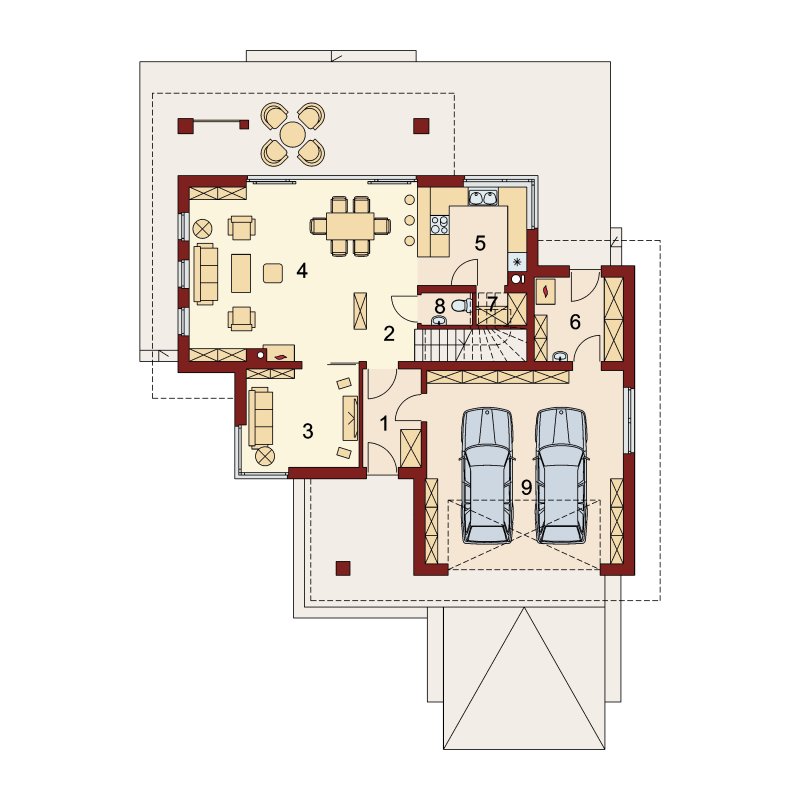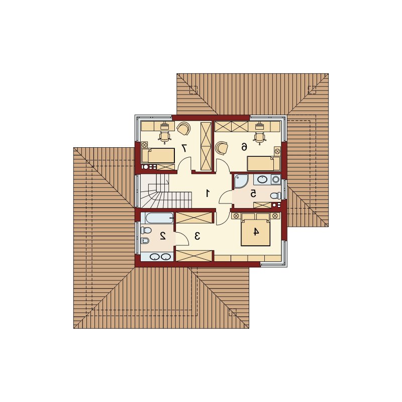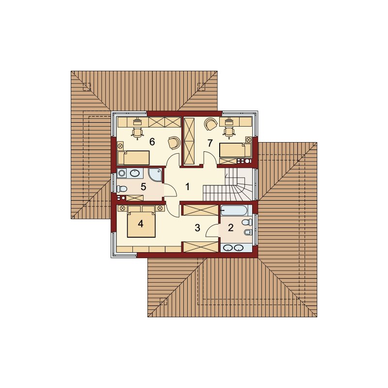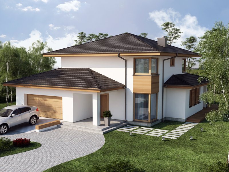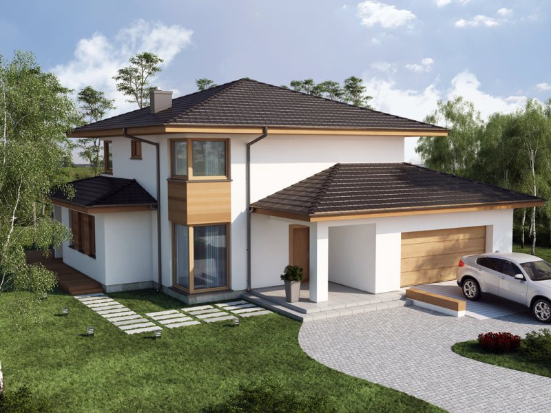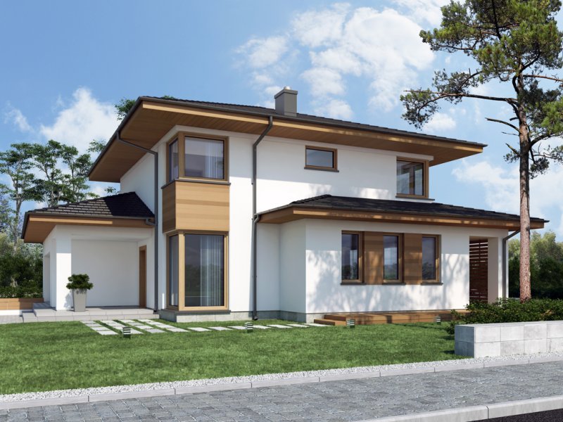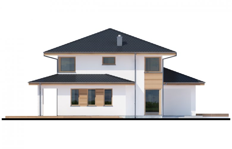 Dom piętrowy, przestronny, wygodny, idealny dla 4 do 5-osobowej rodziny. Aslan 2 to także przykuwające uwagę duże przeszklenia, nowoczesna bryła, „złagodzona” użytym na elewacji i tarasach drewnem, czytelne rzuty. Bezpośrednio po wkroczeniu do domu wzrok przyciąga okazałe przeszklenie salonu, za którym maluje się okoliczny pejzaż. Zadaszenie nad dużym tarasem skutecznie chroni przed upalnym letnim słońcem, wpuszcza natomiast zimowe, padające pod niskim kątem promienie słoneczne, a także zabezpiecza przed deszczem. Na parterze oprócz wspomnianego obszernego salonu oraz przylegającej do niego kuchni, tuż przy strefie wejściowej znajduje się także dodatkowy pokój. Dzięki swojej lokalizacji może pełnić rolę pokoju do pracy, gościnnego lub TV. Praktycznym rozwiązaniem jest także wejście do pomieszczenia gospodarczego od zewnątrz, co ułatwia np. prace wokół domu. Pierwsze piętro to typowa część nocna. Zajmują je trzy sypialnie oraz garderoby i łazienki. Jedna z sypialni jest wyposażona w indywidualną garderobę i łazienkę, które po połączeniu w całość mogą się przekształcić w wygodny, dostępny z hallu salon kąpielowy.