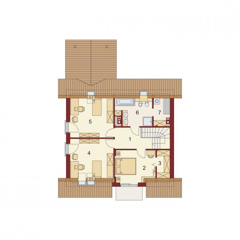 Na poddaszu odnajdziemy trzy duże pokoje - w tym jeden z własną garderobą i wyjściem na balkon oraz łazienkę z osobną pralnią.