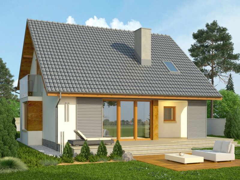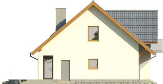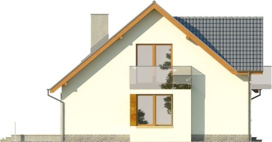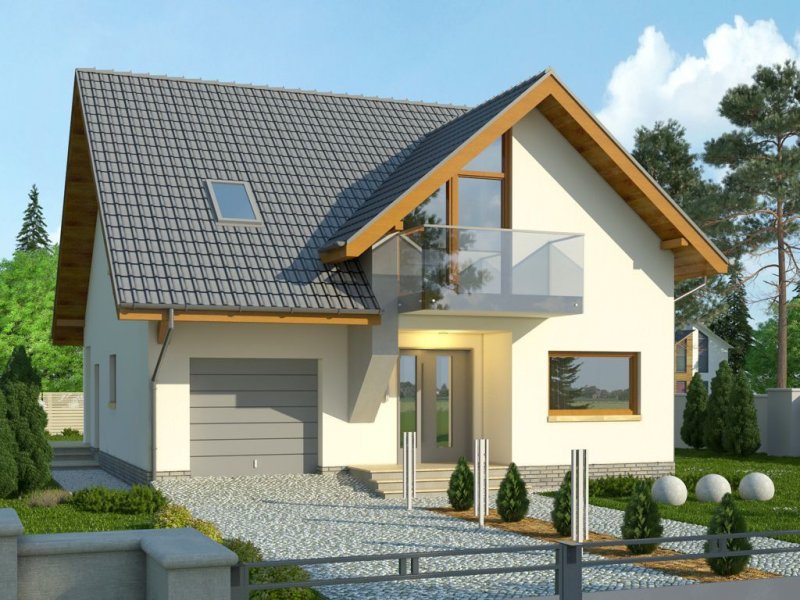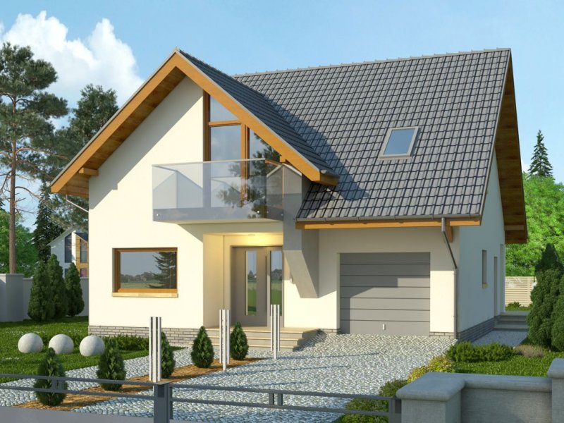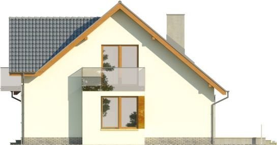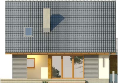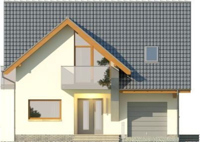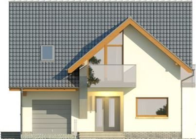 - Nowoczesny dom z dachem dwuspadowym z garażem w bryle budynku. Elewację frontową zdobią zaprojektowane w ciekawych formatach okna, rozmieszczone w asymetryczny sposób. Charakterystycznym elementem jest wejście ulokowane we wnęce, a także atrakcyjny balkon dostępny z sypialni na poddaszu. Od strony ogrodu do budynku przylega taras, który dzięki częściowemu nadwieszeniu zyskał zadaszenie.