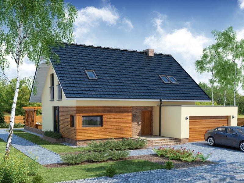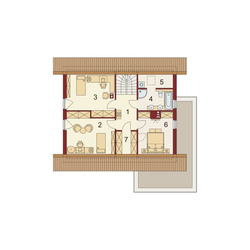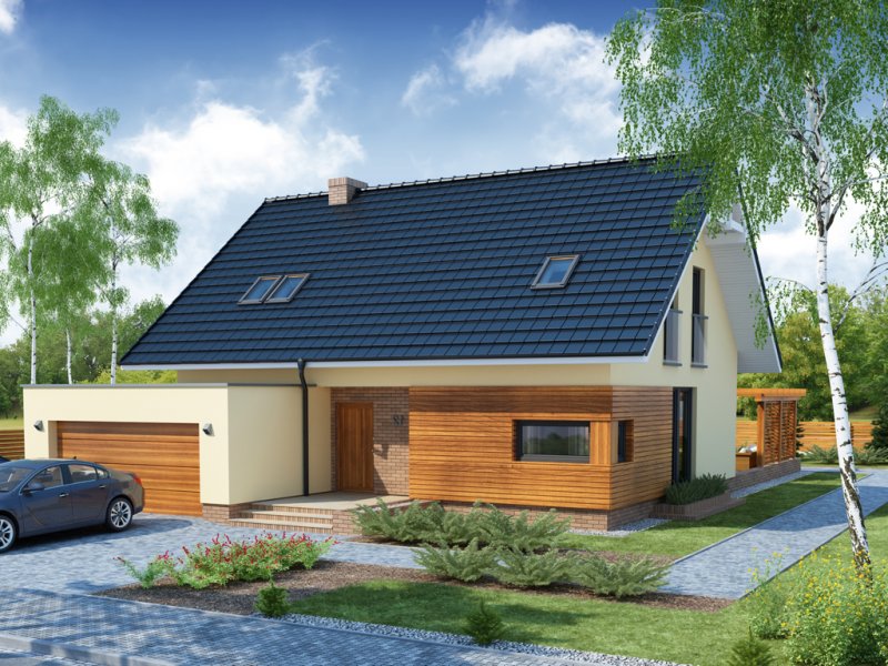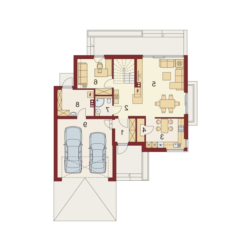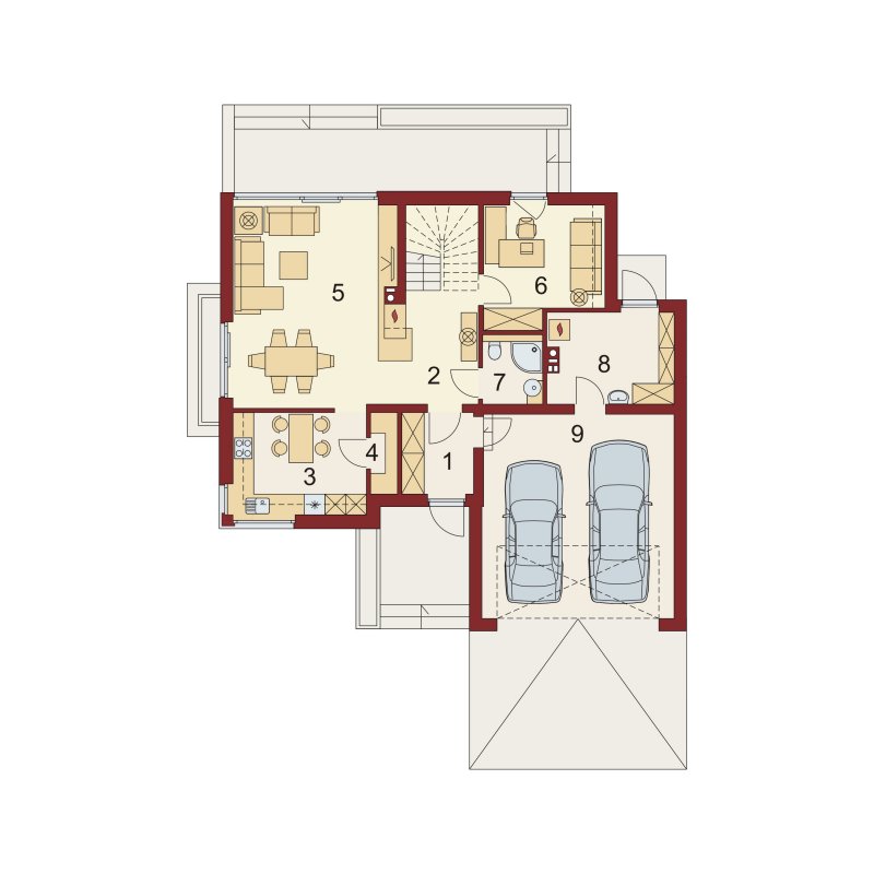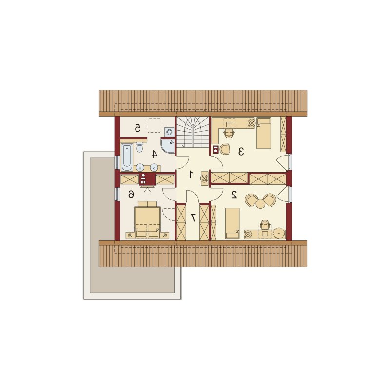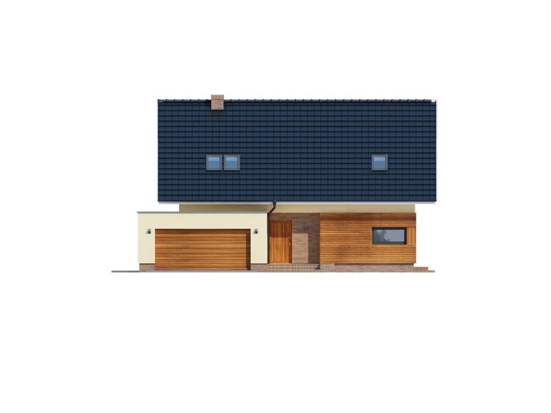 BRUNO 2 PS to dom parterowy z poddaszem użytkowym, zaprojektowany dla 4-5-osobowej rodziny. Za wyposażonym w praktyczną garderobę wiatrołap, po jednej stronie ukazuje się obszerny salon z jadalnią i wejście do kuchni. Oddzieloną kuchnię można z łatwością połączyć z salonem. Dopełnieniem dla kuchni jest użyteczna spiżarnia. Na parterze znajduje się także pokój, który może pełnić rolę gabinetu, pokoju gościnnego lub kolejnej sypialni oraz łazienka. Z przedsionka dostępna jest również dwustanowiskowy garaż z funkcjonalnym przejściem do dużej kotłowni, z której z kolei możemy dostać się bezpośrednio na zewnątrz budynku. Na poddaszu znajduje się strefa nocna domu, która składa się z trzech sypialni, ogólnodostępnej łazienki połączonej z praktyczną pralnią oraz dostępnej z korytarza garderoby.