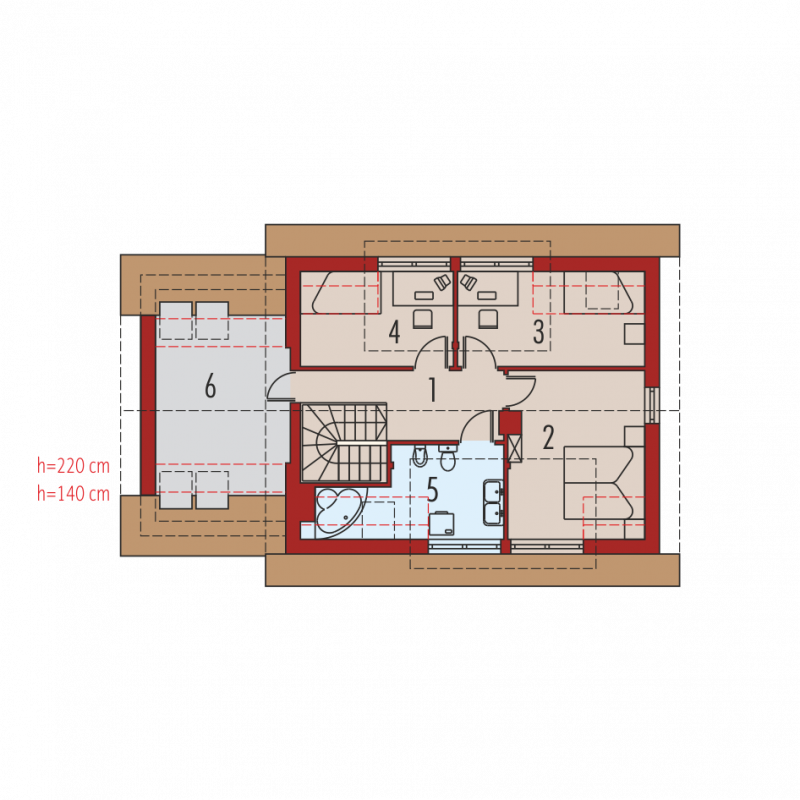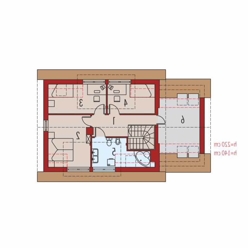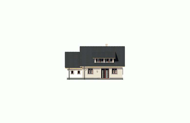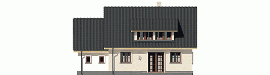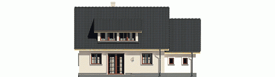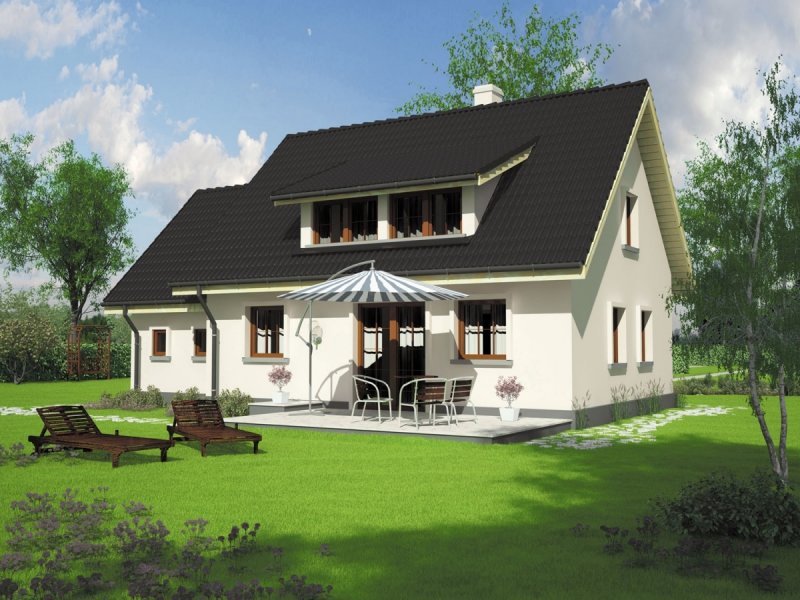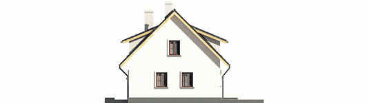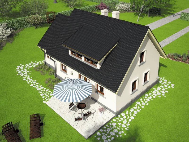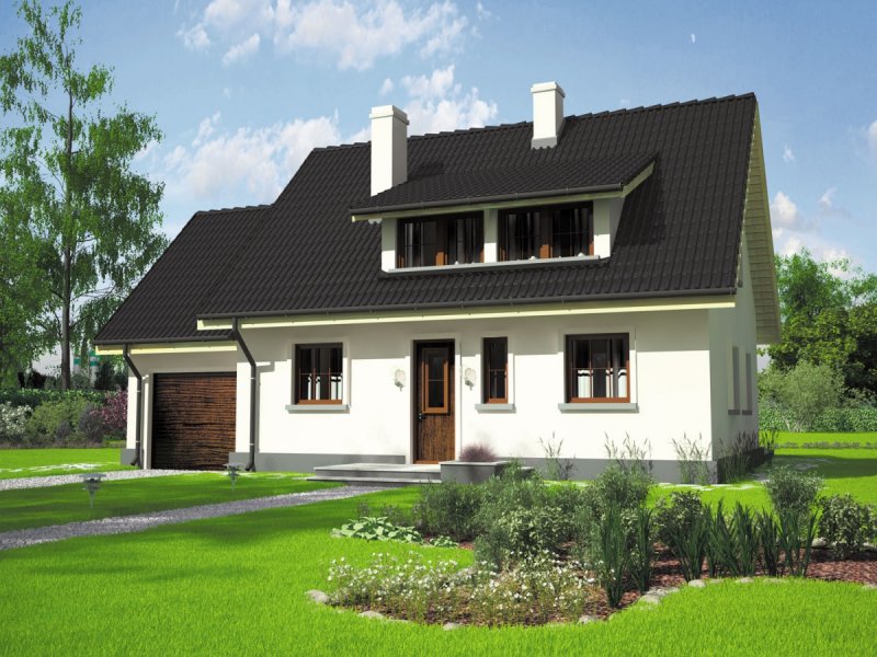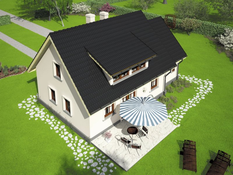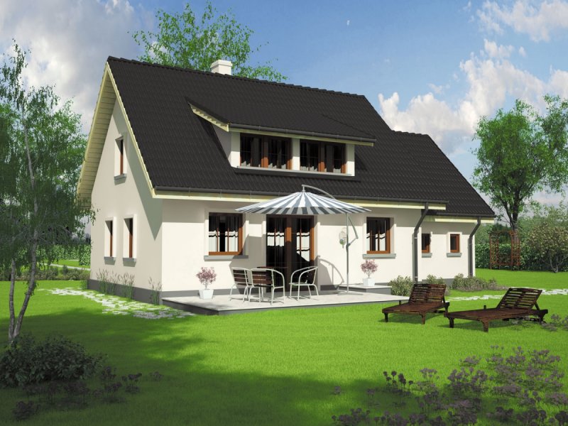 Dom parterowy z poddaszem użytkowym, niepodpiwniczony, z garażem, przeznaczony dla 3-4-osobowej rodziny. Odznacza się prostą konstrukcją i przejrzystym układem funkcjonalnym. Strefa dzienna na parterze to salon połączony z kuchnią, gabinet i pomieszczenie gospodarcze, na poddaszu znajdują się trzy sypialnie i duża łazienka. Dostępna jest również wersja domu bez garażu – Calineczka.