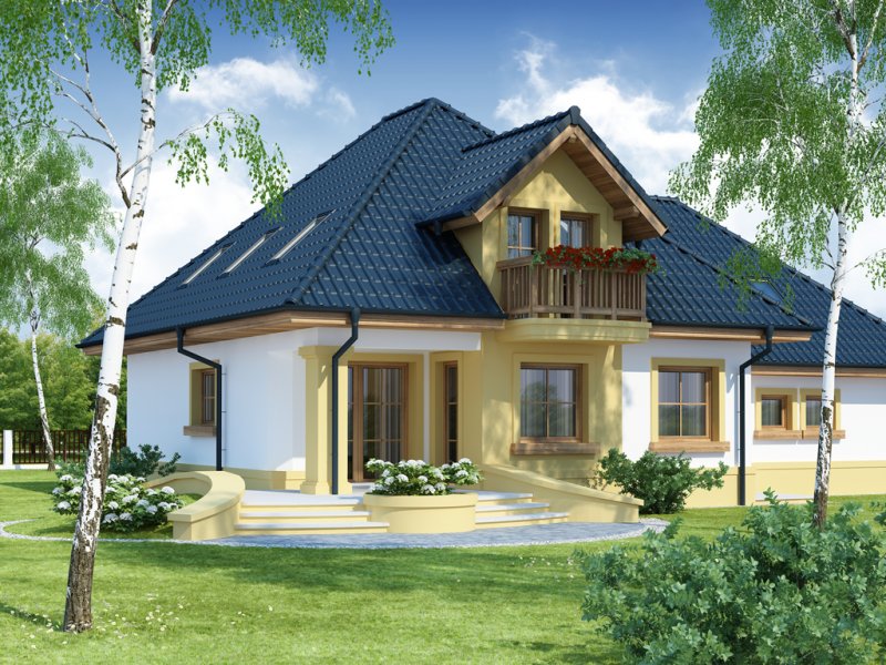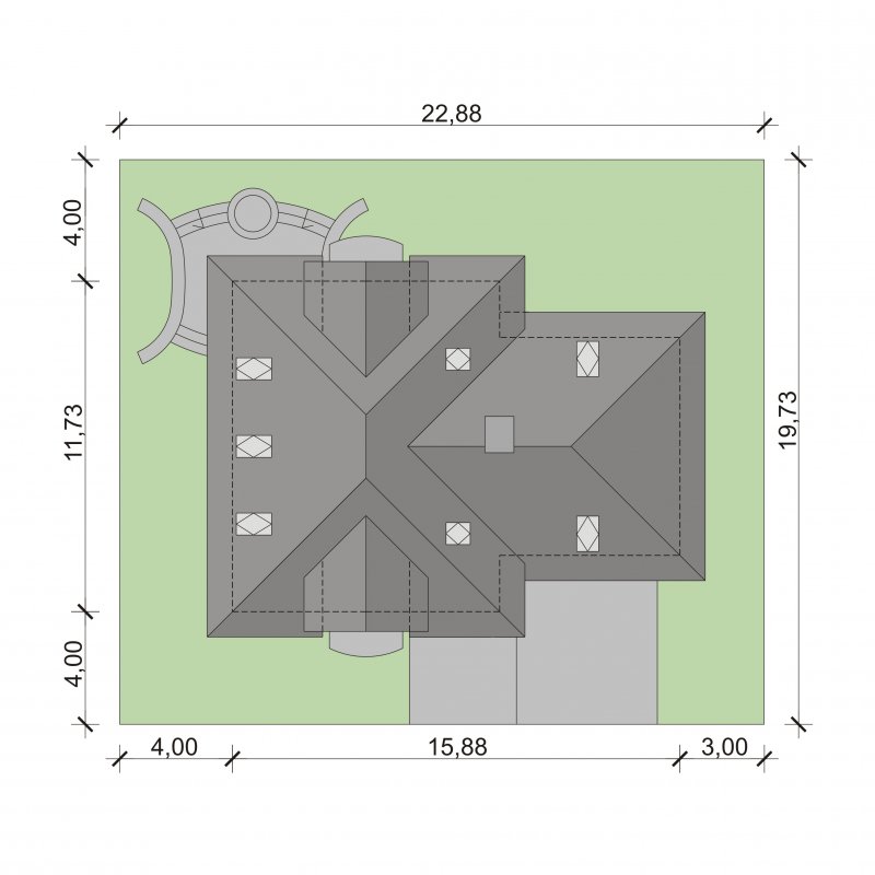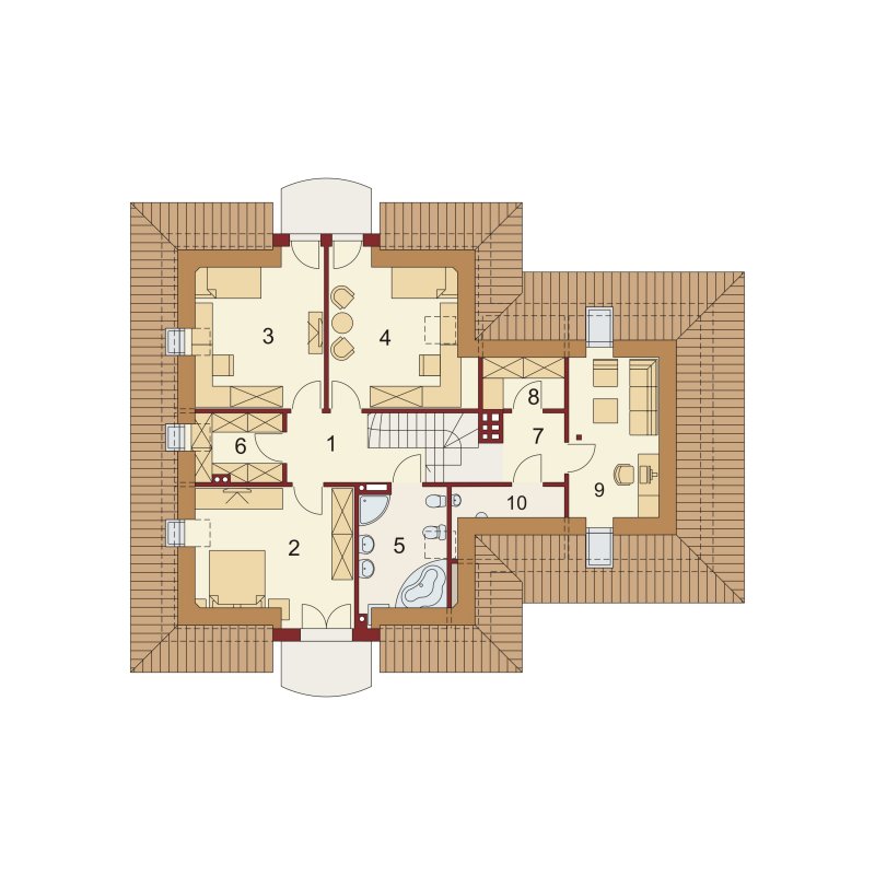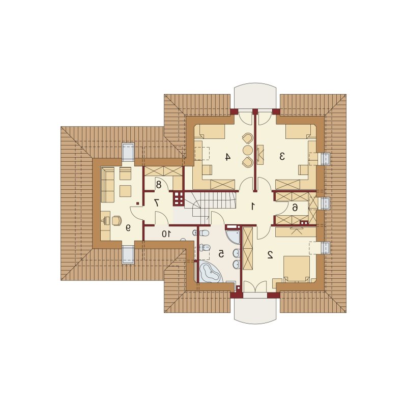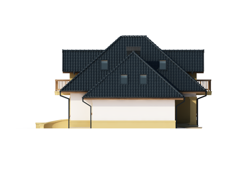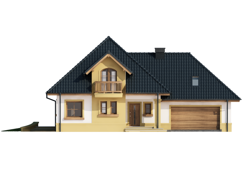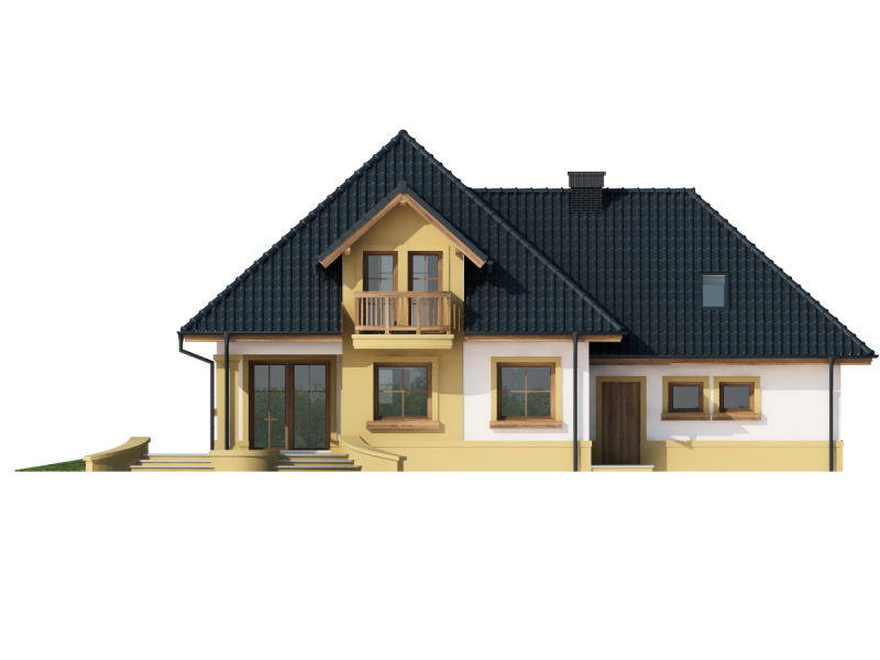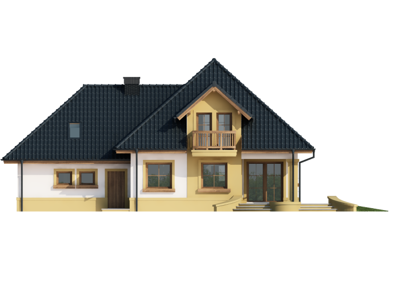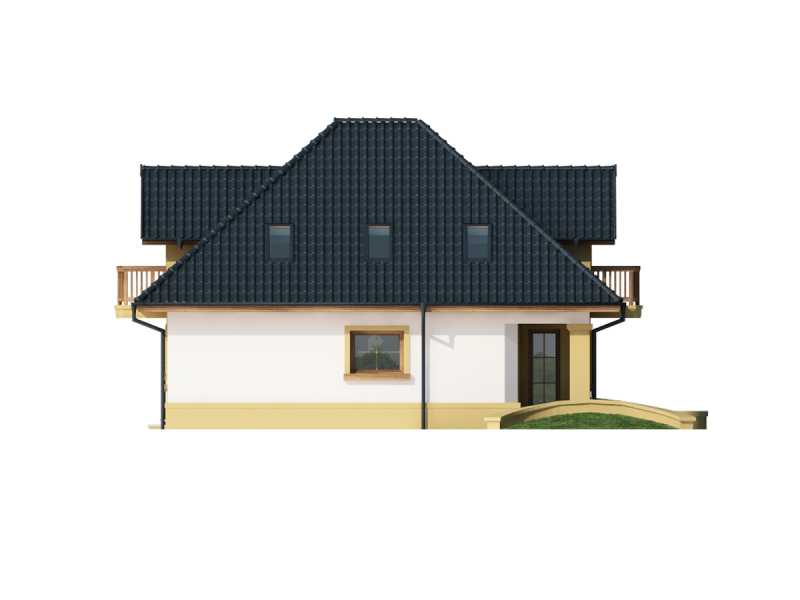 Dom z poddaszem użytkowym, przeznaczony dla 4-5-osobowej rodziny. Na parterze znajduje się przestronny pokój dzienny otwarty na jadalnię oddzieloną barkiem od kuchni. Rozwiązanie funkcjonalne pozwala na wydzielenie ww. pomieszczeń. Wyjście na taras z podcieniem jest możliwe zarówno z jadalni jak i z pokoju dziennego. Na parterze znajduje się spiżarnia, łazienka oraz dodatkowy pokój, a także pomieszczenie gospodarcze, przez które można się dostać do garażu. Na poddaszu znajdują się trzy sypialnie, łazienka, garderoba oraz wc. . Nad garażem można zaadaptować strych nieużytkowy dostępny bezpośrednio z klatki schodowej na dodatkowe pomieszczenie gospodarcze lub pokój o powierzchni ponad 9m2, natomiast wc można przeznaczyć na suszarnię. W ramach adaptacji istnieje możliwość powiększenia kuchni z jadalnią i tarasu w podcieniu kosztem dodatkowego pokoju na parterze. Dzięki prostym rozwiązaniom konstrukcyjnym i nieskomplikowanej bryle jest on niedrogi w budowie i eksploatacji.