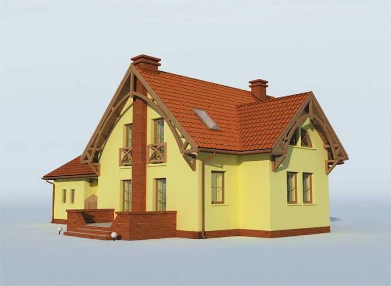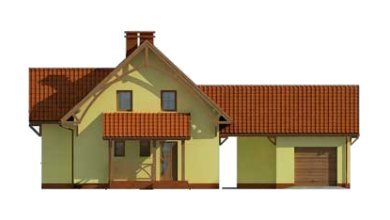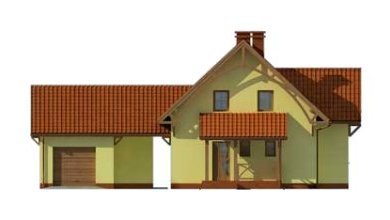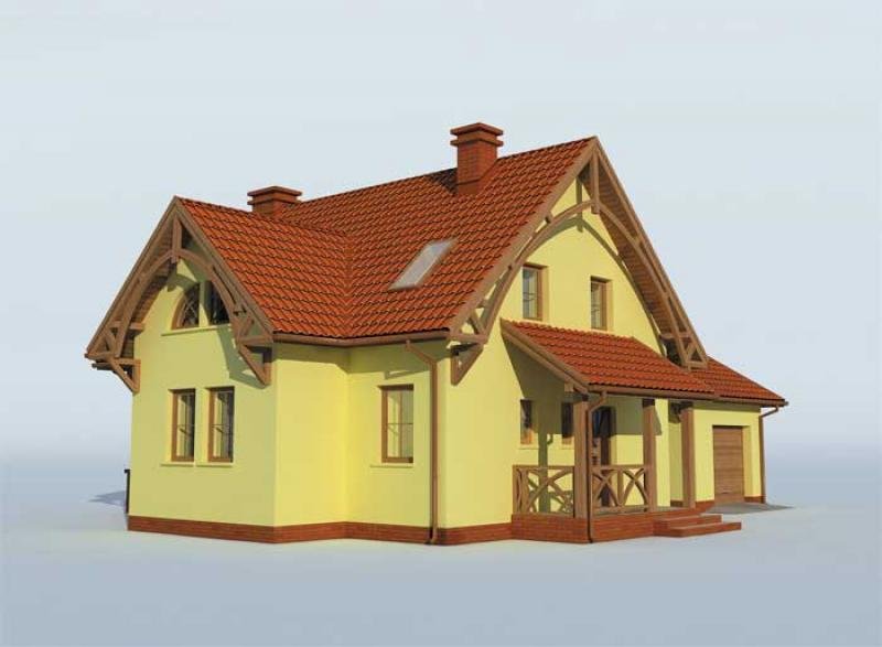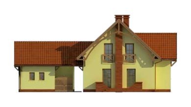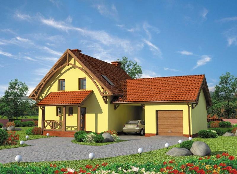 "Dolores" Elewacja frontowa projektu Dolores od razu przyciąga uwagę innowacyjnym rozwiązaniem, ponieważ między garażem zamkniętym a domem przewidziano wiatę na drugi samochód, gdzie znajduje się także pomieszczenie gospodarcze oraz skład drewna. Ponadto drzwi do domu zostały zadaszone, dzięki czemu powstał niewielki ganeczek. W elewacji bocznej lewej wyróżnia się ryzalit, którego linię dachu, podobnie, jak w przypadku elewacji frontowej, wykończono wygiętym drewnem. Uroczo prezentuje się tył domu z symetrycznie rozmieszczonymi oknami, przedzielony niejako na pół kominem wykończonym, podobnie, jak murek u podstawy, czerwoną cegłą. Budynek nie jest podpiwniczony, posiada możliwość adaptacji kotłowni na węgiel. Do części mieszkalnej domu wchodzimy przez wiatrołap, z którego możemy się udać bezpośrednio do kotłowni (na lewo) lub garderoby (na prawo). Takie rozwiązane pomoże nam utrzymać ład, porządek i czystość w domu. Następnie możemy przejść do niewielkiego WC, umieszczonego naprzeciwko schodów. Jednakże do najciekawszych pomieszczeń parteru należy pokój dzienny z dwoma wyjściami na taras. Należy zwrócić uwagę na fakt, iż jedna ze ścian pokoju dziennego, została poprowadzona skośnie w stosunku do ścian zewnętrznych budynku. Taki układ jest bardzo korzystnym rozwiązaniem, ponieważ mamy więcej miejsca w kuchni połączonej z aneksem jadalnym. Poddasze natomiast, oddzielone od reszty domu, staje się miejscem zarezerwowanym głównie dla mieszkańców domu. Możemy bowiem urządzić tutaj bardzo wygodną łazienkę z wanną i trzy sypialnie. Dwie z nich mają dość nietypowy układ, ponieważ stanowią one część ryzalitu. Tylko od naszej fantazji zależy jak urządzimy te szczególne pokoje. Ponadto sypialnie przylegające do ściany północnej budynku, mają wyjścia na niewielkie balkony. Projekt Dolores okazuje się zatem niezwykle funkcjonalnym, ciekawym rozwiązaniem. Czteroosobowa rodzina znajdzie w nim wiele wygód i będzie miała satysfakcję z mieszkania w tak ciekawym domu. Projekt składa się z części architektonicznej, konstrukcyjnej, wewnętrznych instalacji wod.-kan, c. o. i elektrycznej. W projekcie załączone są podstawowe zestawienie stali, drewna i stolarki okienno-drzwiowej. Do projektu dołączamy bezpłatną zgodę na wprowadzenie zmian, oświadczenie projektantów o wykonaniu projektu zgodnie z obowiązującymi normami i przepisami oraz kserokopie uprawnień projektantów wraz z aktualnym wpisem do izby. W przypadku zamówienia projektu w technologii lekkiej, drewnianej konstrukcji szkieletowej, powierzchnia użytkowa budynku jest o około 7% większa.