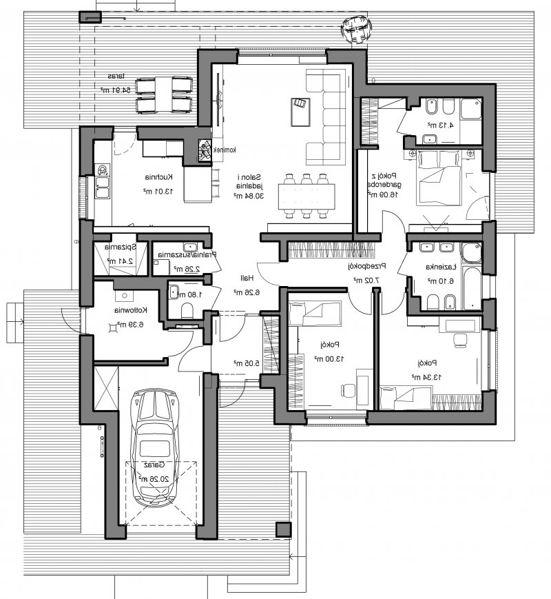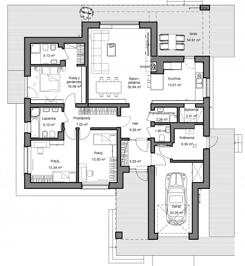 Bardzo przemyślane rozplanowanie pomieszczeń zapewnia elastyczność w dostosowaniu ich do swoich potrzeb. Wyraźne wydzielenie stref funkcjonalnych domu pozwala na komfortowe i niezależne korzystanie z nich, a także zapewnia możliwość zamknięcia drzwiami części prywatnej. Także salon i kuchnia mogą zostać wydzielone ścianami z osobnymi wejściami do obu pomieszczeń.