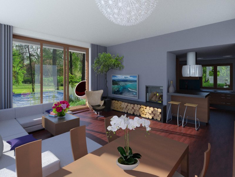 Wysoki salon z pięknym dużym przeszkleniem otwartym na ogród jest niewątpliwą atrakcją tego domu. Może on zostać wzbogacony o antresolę otwartą na salon. Miejsce na schody przewidziano w hallu.
