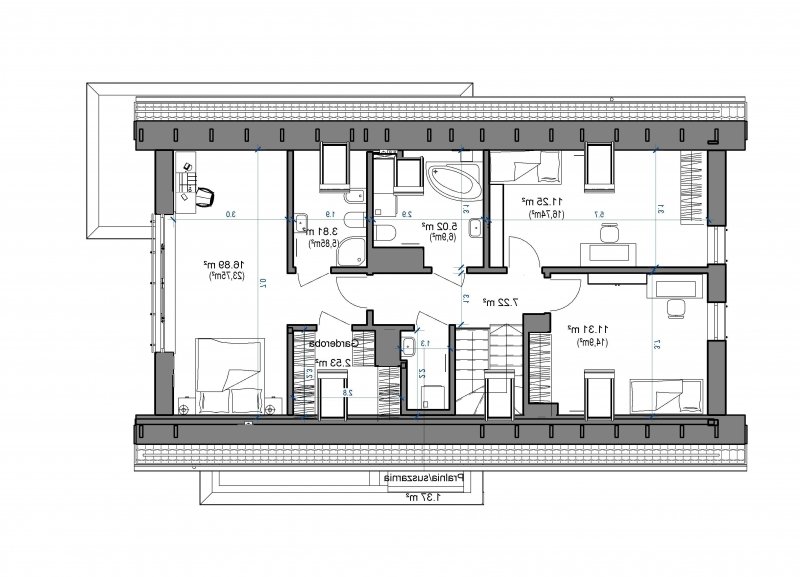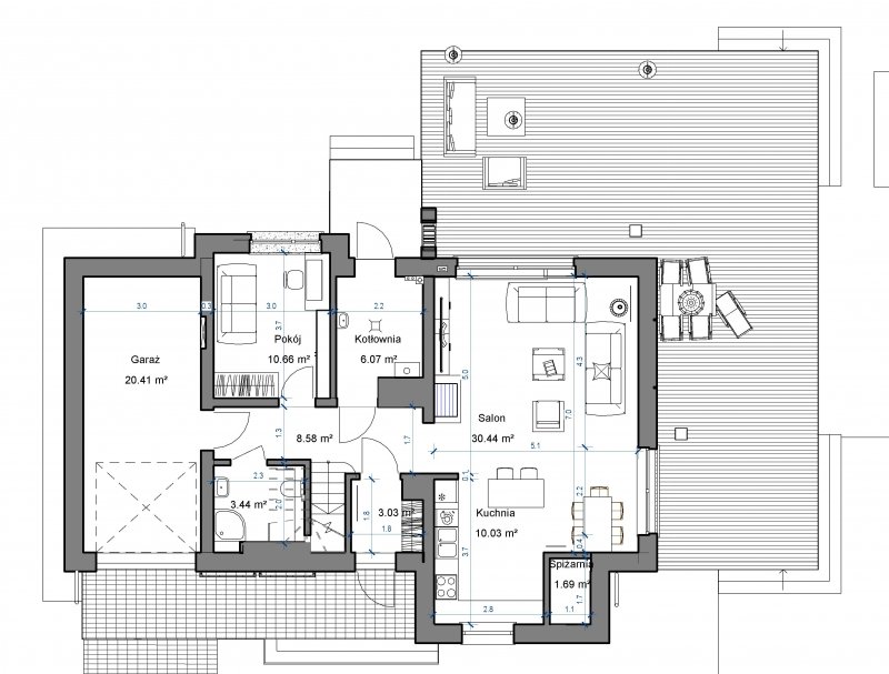 Domidea 57 to komfortowy, dom z poddaszem użytkowym o nie wielkich gabarytach. Bardzo przemyślane rozplanowanie pomieszczeń zapewnia elastyczność w dostosowaniu ich do swoich potrzeb. Wyraźne wydzielenie stref funkcjonalnych domu pozwala na komfortowe i niezależne korzystanie z nich, a także zapewnia możliwość zamknięcia drzwiami części prywatnej. Do dyspozycji mieszkańców jest duży salon połączony z jadalną z widokiem na przestronny taras.