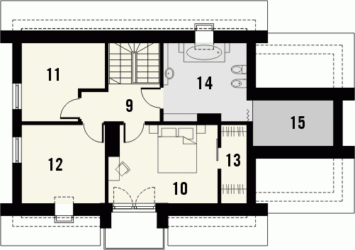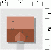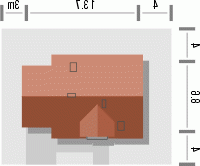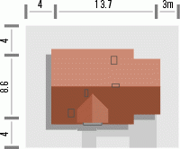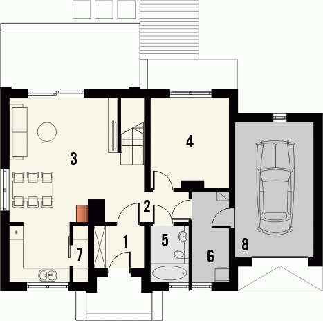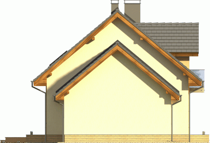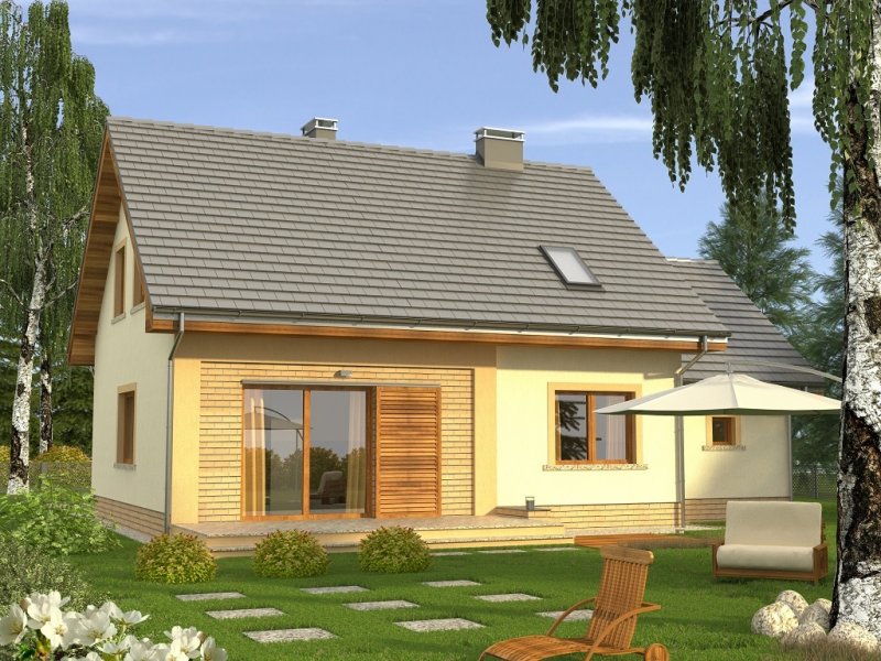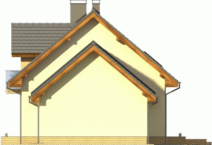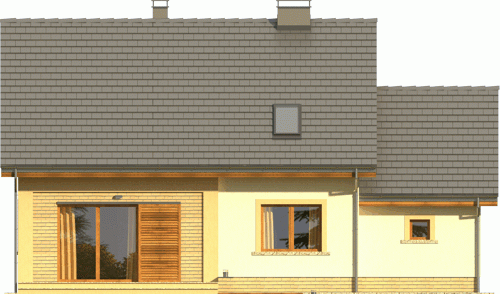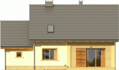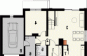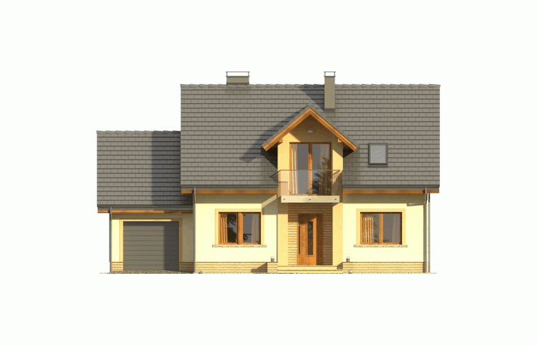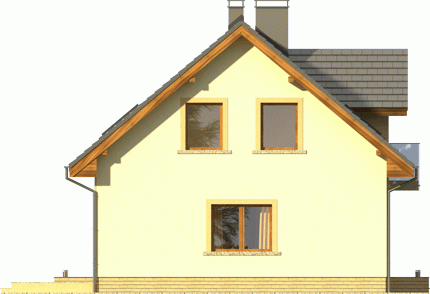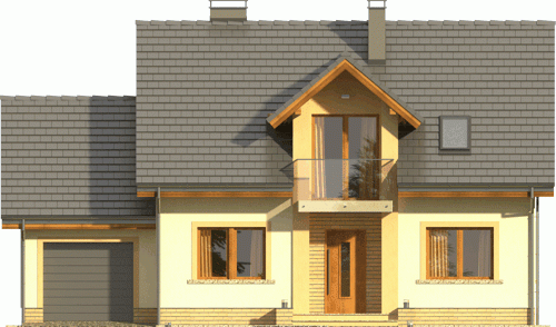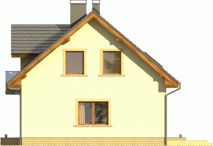 Budynek niepodpiwniczony, piętrowy z garażem dostawionym z boku. Na parterze obok salonu połączonego z kuchnią zlokalizowano też dodatkowy pokój, łazienkę i pomieszczenie gospodarcze. Od strony kuchni dostępna jest spiżarnia. Na poddaszu pod dachem stromym mieszczą się 3 sypialnie, wygodna łazienka i garderoba. Dokumentacja dostępna również w odbiciu lustrzanym.
