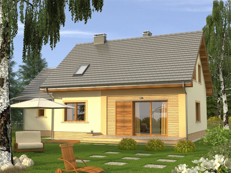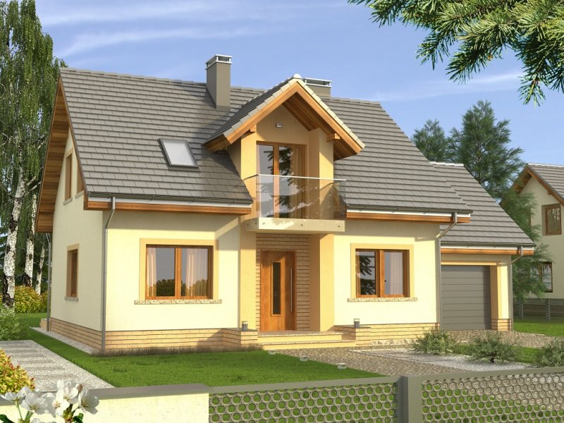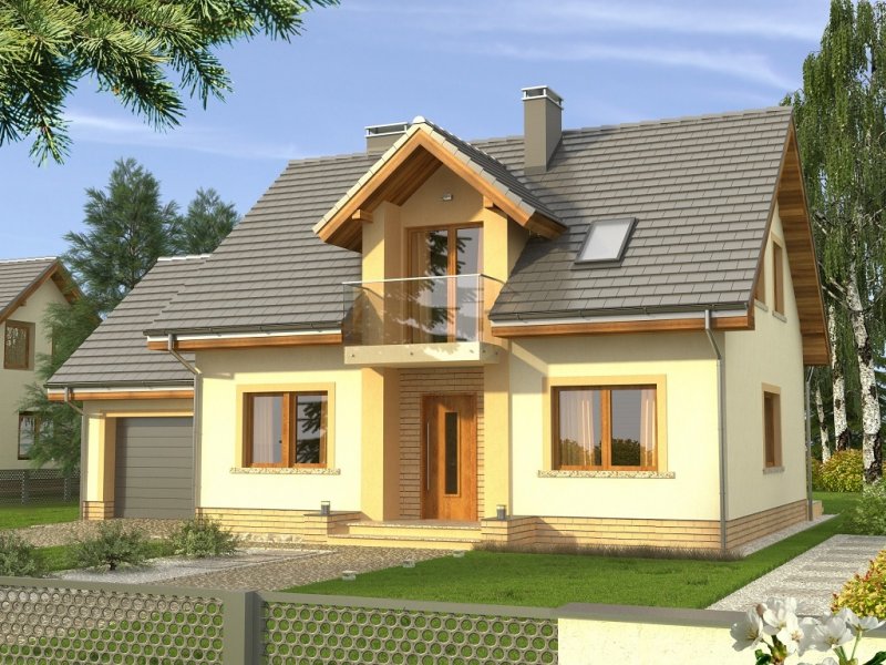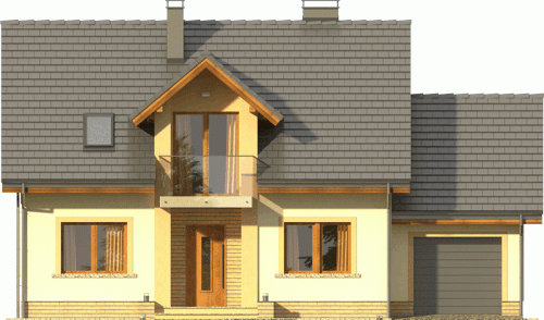 Funkcjonalny dom z dachem dwuspadowym z garażem jednostanowiskowym lub wariantowo bez garażu. Posiada klasyczne fasady z oknami ujętymi w opaski i wyróżnionym płytką klinkierową cokołem. Wejście główne oraz wyjście na taras podkreślone innym kolorem tynku oraz okładziną klinkierową fragmentów ścian.