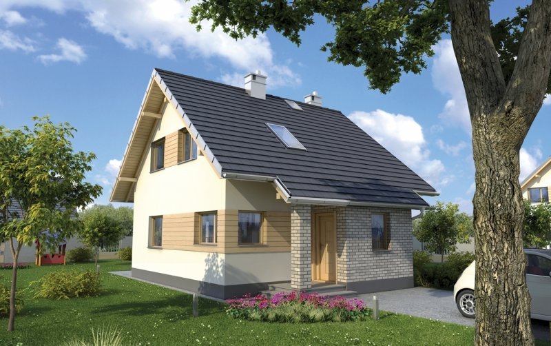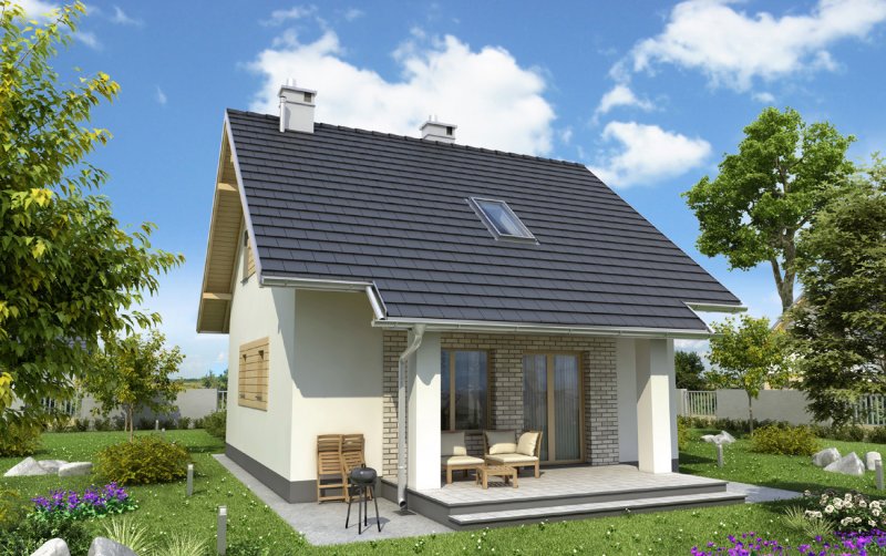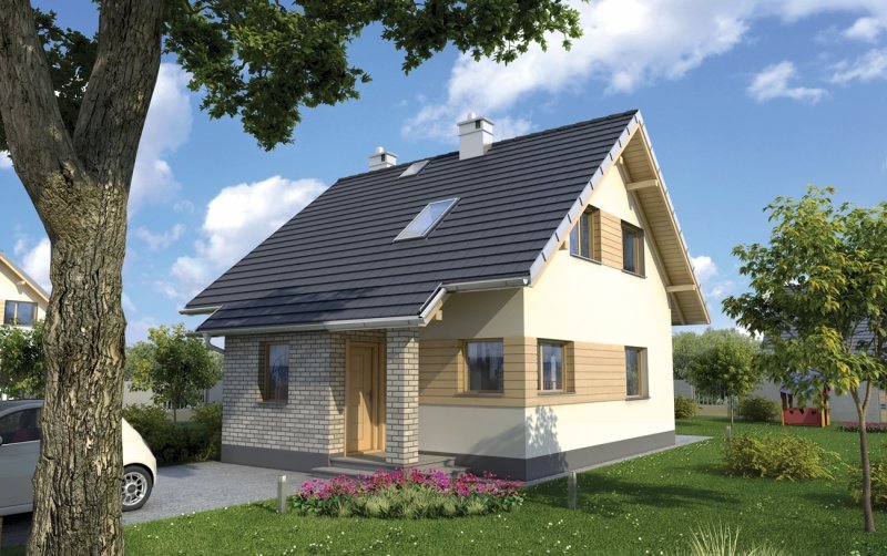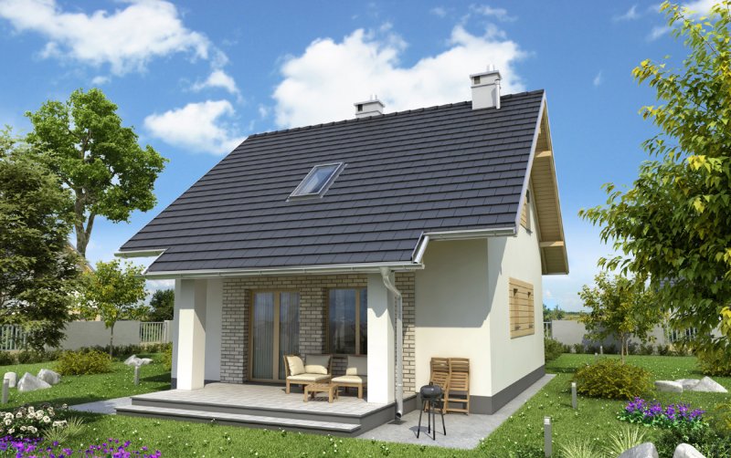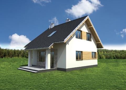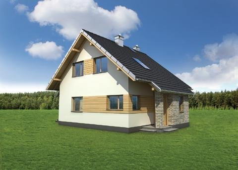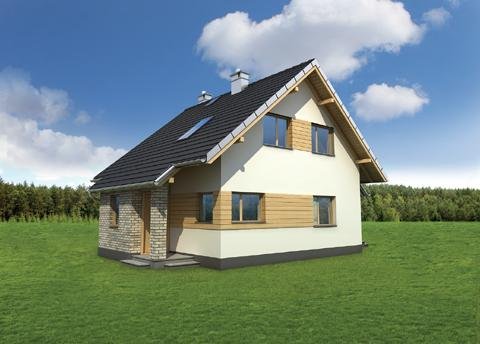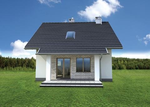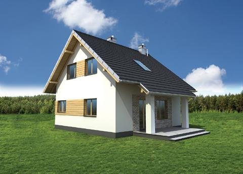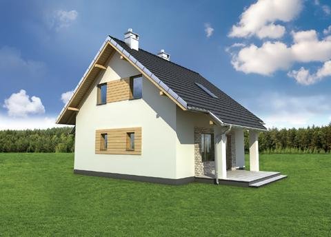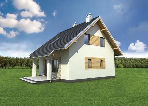 Nieco ponad 75 m2 to, jedna z najmniejszych powierzchni, na której Archeton zaproponował projekt domu parterowego z użytkowym poddaszem, beż garażu. Kwadratowy rzut Groszka wypełnia na parterze otwarta strefa dzienna z kominkiem, wygodna sień z głęboką szafą oraz, pod schodami, łazienka z kotłem gazowym. Jest to rozwiązanie zbliżone do, jeszcze nieco mniejszej, Lizy. Projekt domu Groszek stawia jednak na bardziej komfortową przestrzeń we wszystkich pomieszczeniach poddasza. Dlatego wydzielono tu dwie większe sypialnie, zamiast trzech, jak w Lizie, oraz wygodną łazienkę. Bryła jest niedroga w budowie i w utrzymaniu, zwarta i bez balkonów. Zastosowano minimalną ilość okien dachowych, opierając doświetlenie poddasza głównie na oknach w ścianach szczytowych. Projekt domu Groszek proponuje tradycyjny charakter architektury. Podkreślają to: ganek i podcień tarasu ogrodowego, przekryte częściowo przedłużonymi połaciami dwuspadowego dachu.