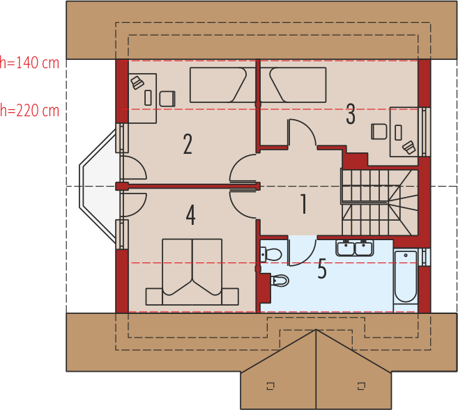 Dom zaprojektowany w technologii murowanej ze stropem gęstożebrowym. Dach o konstrukcji drewnianej pokryty dachówką cementową lub ceramiczną. Schody wewnętrzne drewniane. Elewacja wykończona tynkiem malowaną cegłą oraz drewnem.