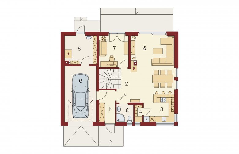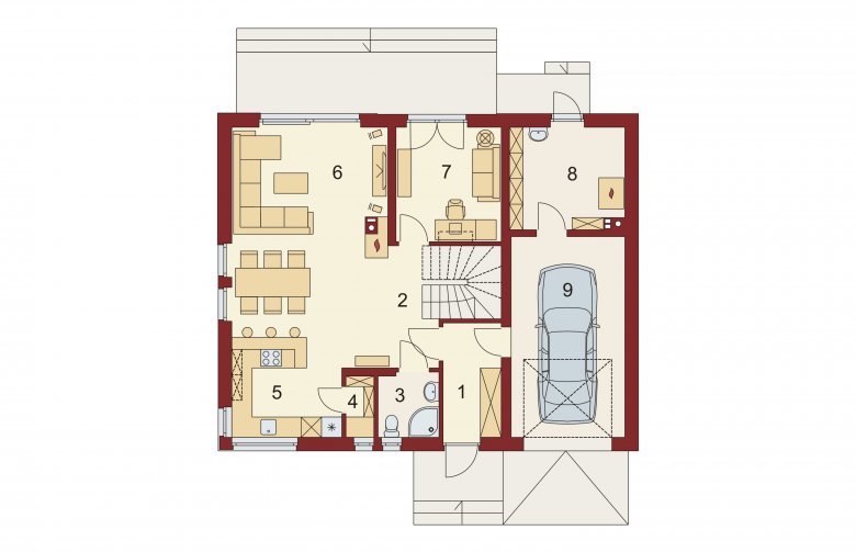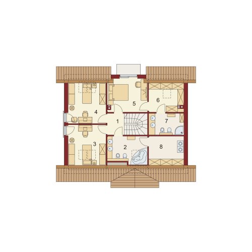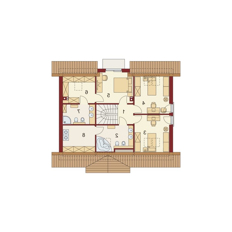 Heweliusz to dom idealny dla 4-5 osobowej rodziny, o tradycyjnej bryle i wyważonych proporcjach. Głównym punktem parteru jest salon z bezpośrednim wyjściem na taras, stopniowo przechodzący w część jadalnianą, usytuowaną w przy atrakcyjnych przeszkleniach. Praktyczny barek oddziela tę przestrzeń od kuchni. Kuchnię można również zmodyfikować: powiększyć, przez likwidację spiżarki, bądź też przekształcić w zamkniętą, dzięki dostawieniu ścianki działowej. Na uwagę zasługuje wygodnie umiejscowiona kotłownia dostosowana do wymogów obowiązujących przy ogrzewaniu paliwem stałym. Poddasze to strefa nocna. Spośród trzech sypialni, jedna z nich maja bezpośrednie wyjście na balkon, indywidualną garderobę oraz łazienkę. W budynku wyodrebniono też pomieszczenie z przeznaczeniem na pralnię.