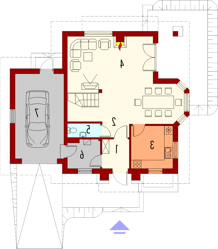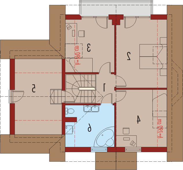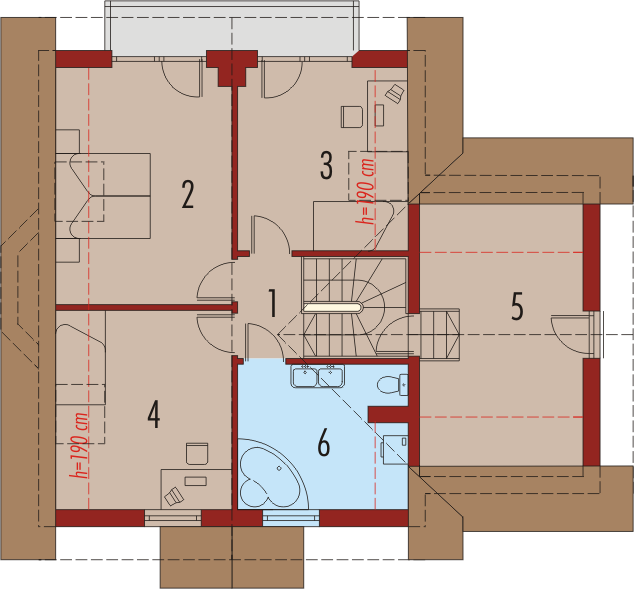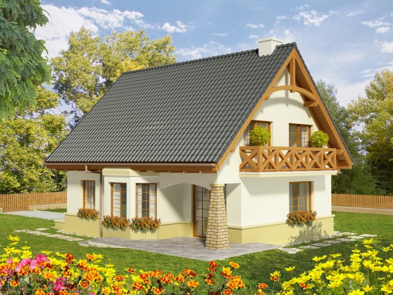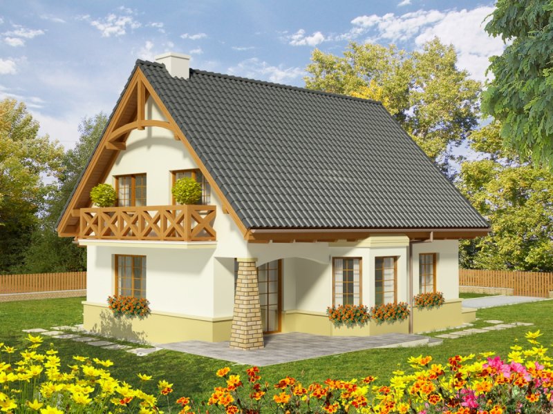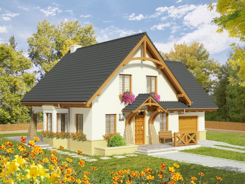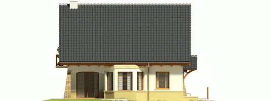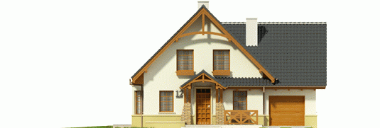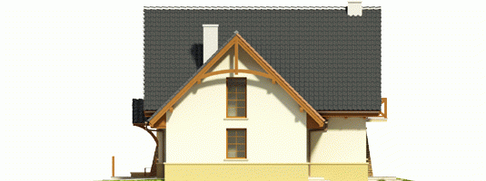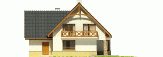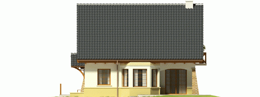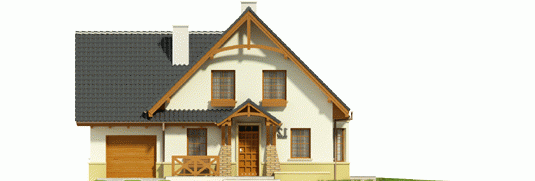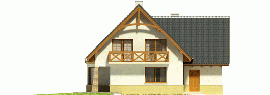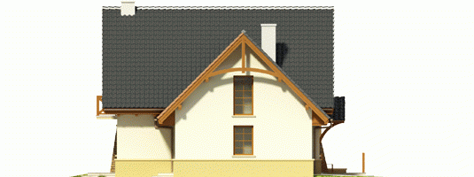 Dom parterowy z użytkowym poddaszem, niepodpiwniczony, z wbudowanym garażem jednostanowiskowym, przeznaczony dla 4-5-osobowej rodziny. Parter to strefa dzienna, na którą składa się obszerny salon z kominkiem, jadalnia w efektownym wykuszu, wygodna kuchnia, toaleta i pomieszczenie gospodarcze dostępne również z garażu. Strefa nocna znajduje się na poddaszu. Są tu trzy pokoje oraz duża łazienka, a także strych. Dom charakteryzuje się prostą konstrukcją i przemyślanym pod względem kosztów realizacji doborem materiałów.