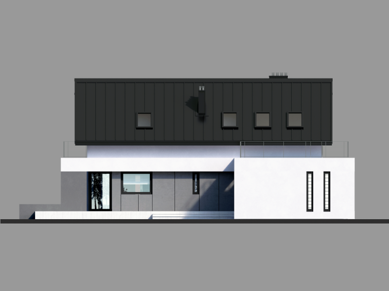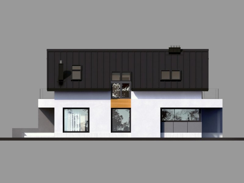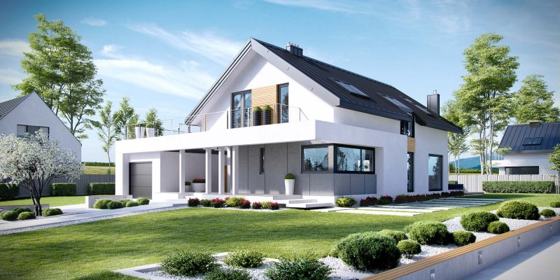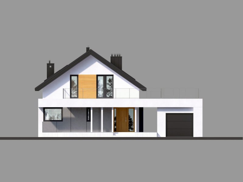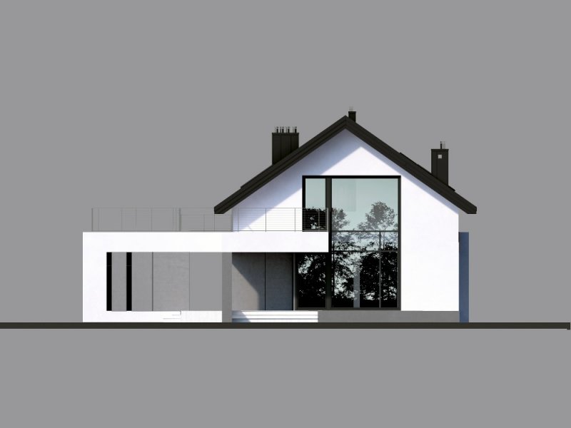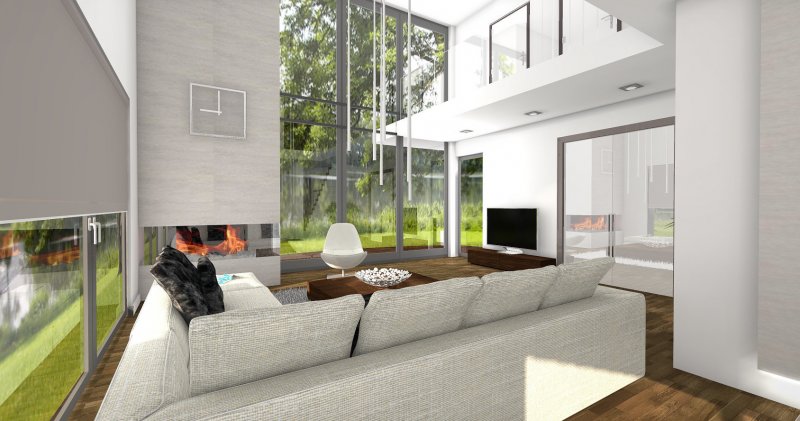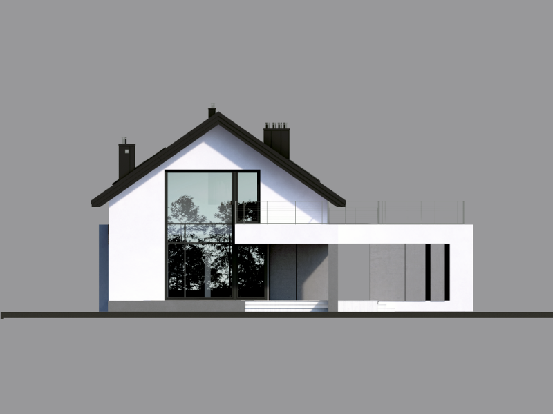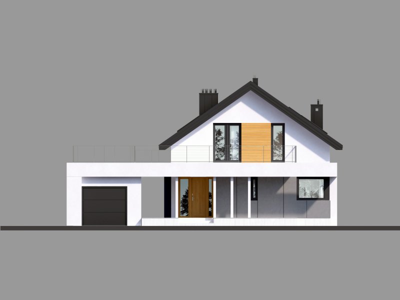 Atrakcyjna bryła zainteresuje miłośników antresoli i niebanalnych rozwiązań. Jednostanowiskowy garaż połączony jest z domem dość nietypowo, gdyż jedyną spoiną jest balkon, a przestrzeń między nimi pozostała otwarta. Spora antresola i wysokie przeszklenie optycznie powiększają przestrzeń salonu, który w ten sposób łączy się z ogrodem.