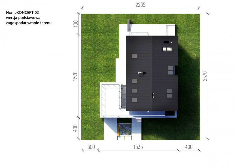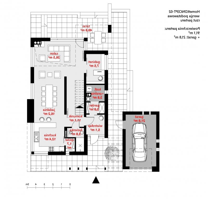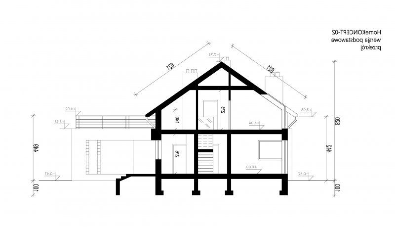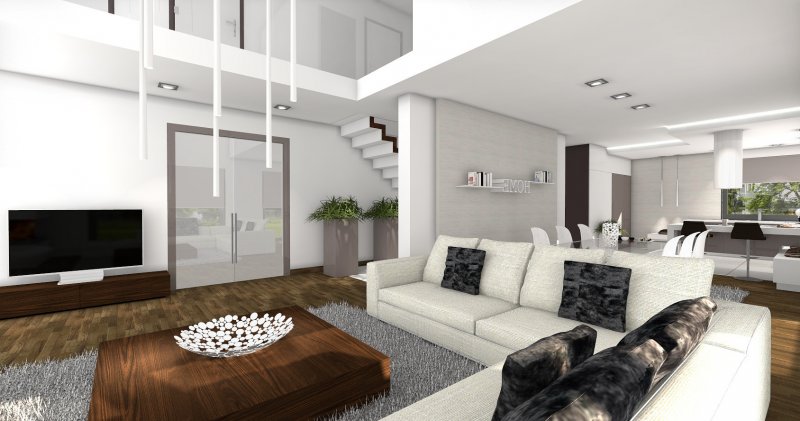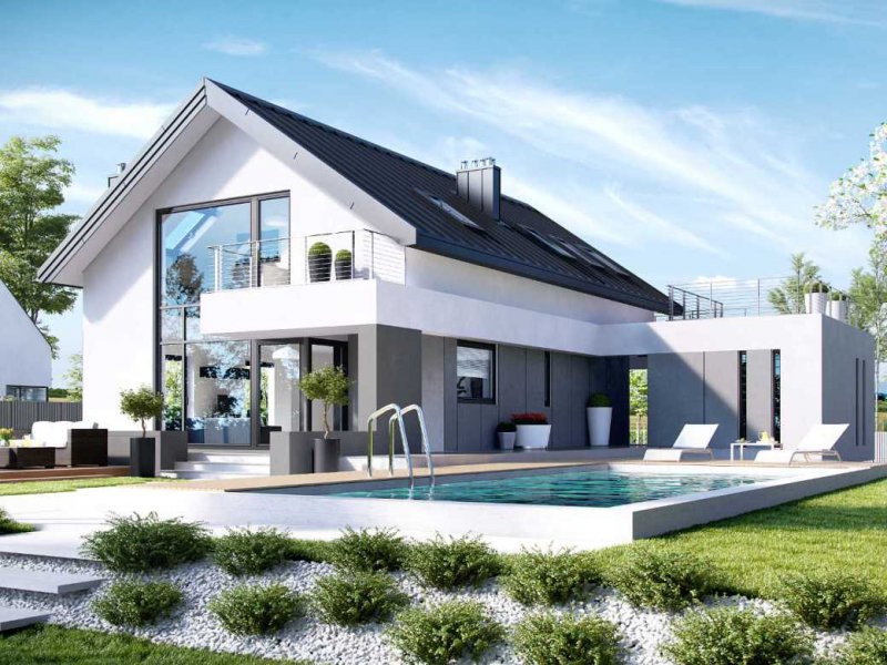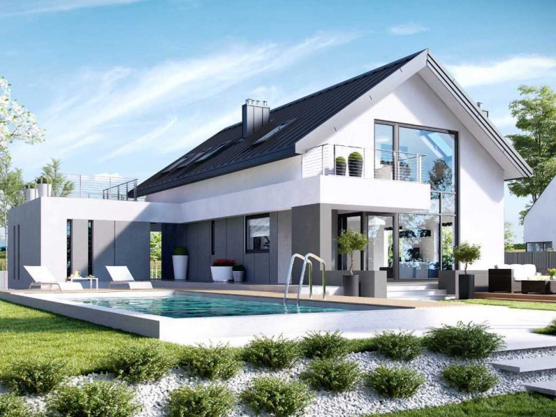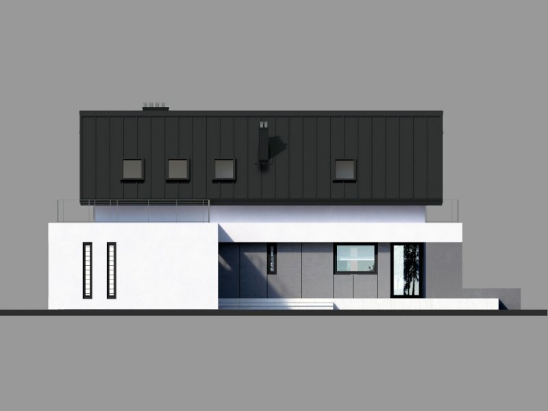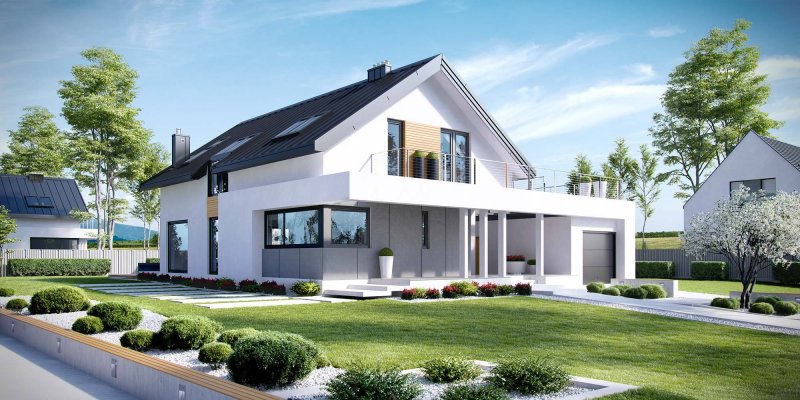 Atrakcyjna bryła zainteresuje miłośników antresoli i niebanalnych rozwiązań. Jednostanowiskowy garaż połączony jest z domem dość nietypowo, gdyż jedyną spoiną jest balkon, a przestrzeń między nimi pozostała otwarta. Spora antresola i wysokie przeszklenie optycznie powiększają przestrzeń salonu, który w ten sposób łączy się z ogrodem.