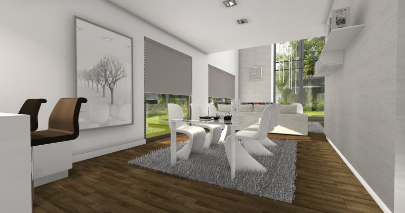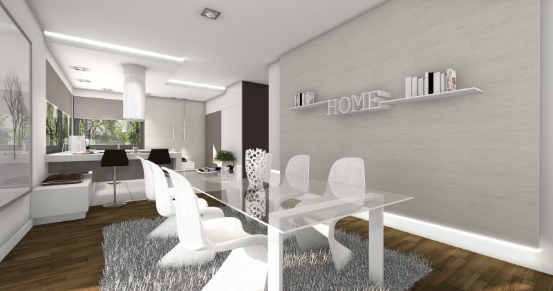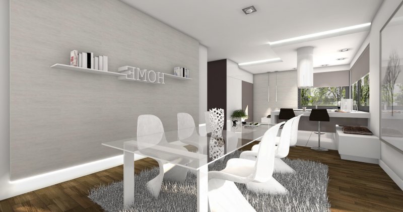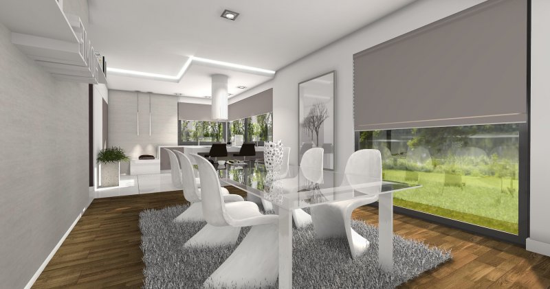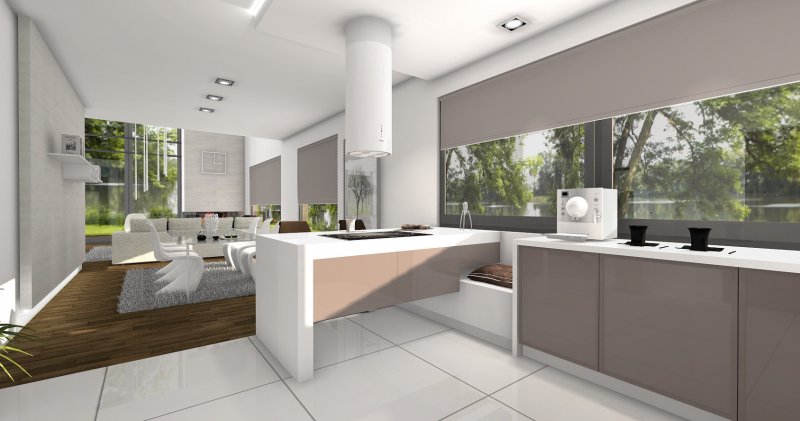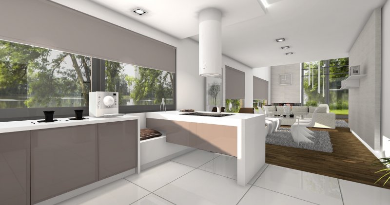 Otwarta kuchnia z jadalnią potęguje efekt przestronności. Gabinet jest zaprojektowany w tylnej części domu,