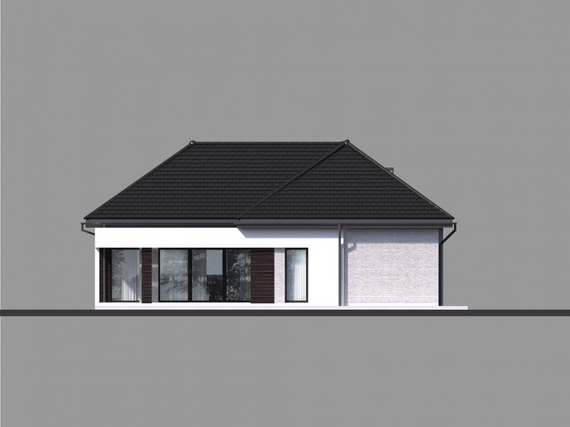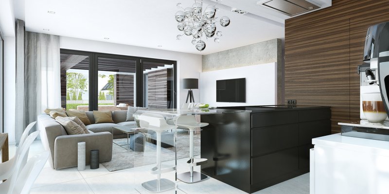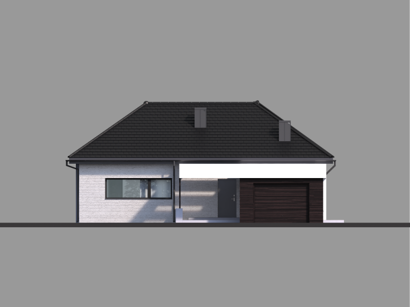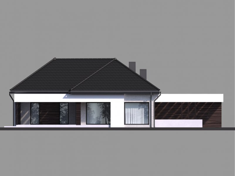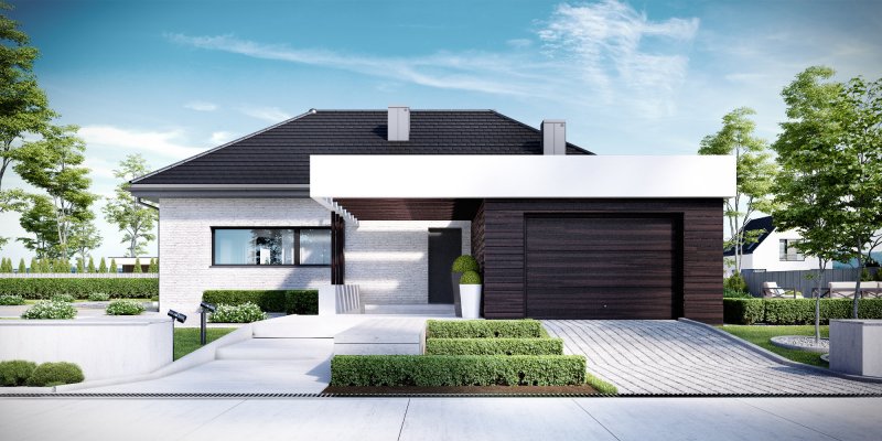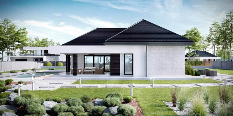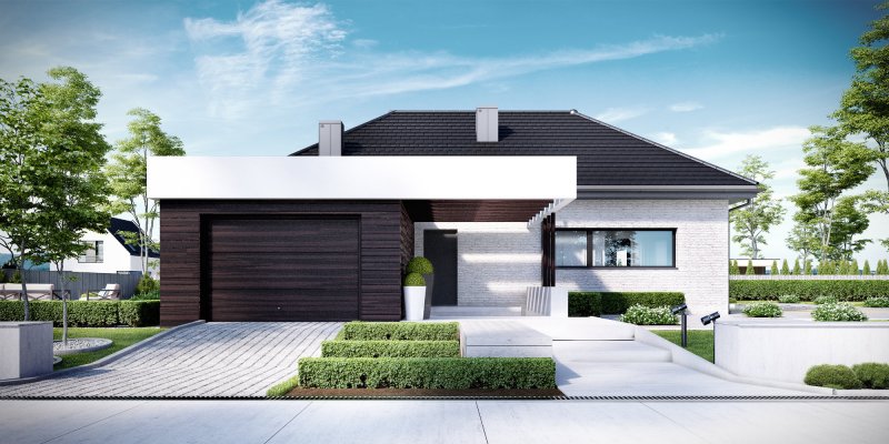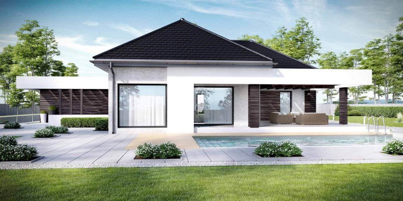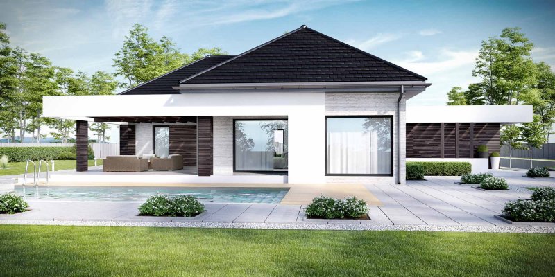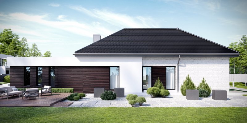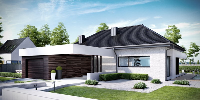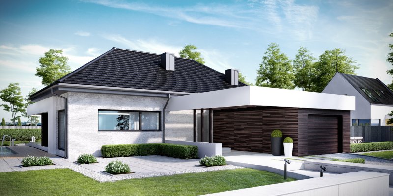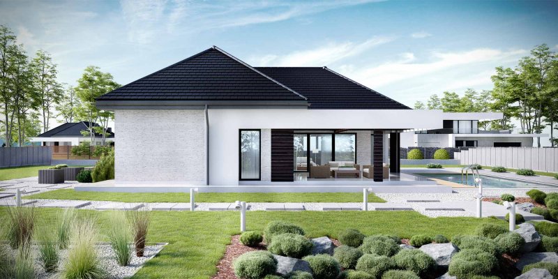 Projekt zachowuje to, co najcenniejsze z pierwowzoru – duże przeszklenia, dzięki którym wnętrze pełne jest naturalnego światła, oraz zachwycające rozwiązanie elewacji. W projekcie HomeKoncept 32 jednostanowiskowy garaż zdobi z zewnątrz ciemna deska elewacyjna, którą skomponowano z jasnym kamieniem. Całości dopełnia geometryczny biały detal oraz unikatowe rozwiązanie belkowania nad wejściem i przyjemnym, dużym tarasem.