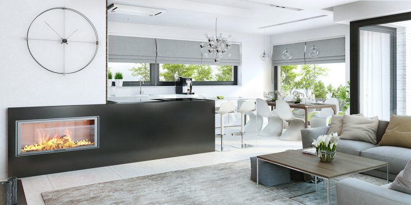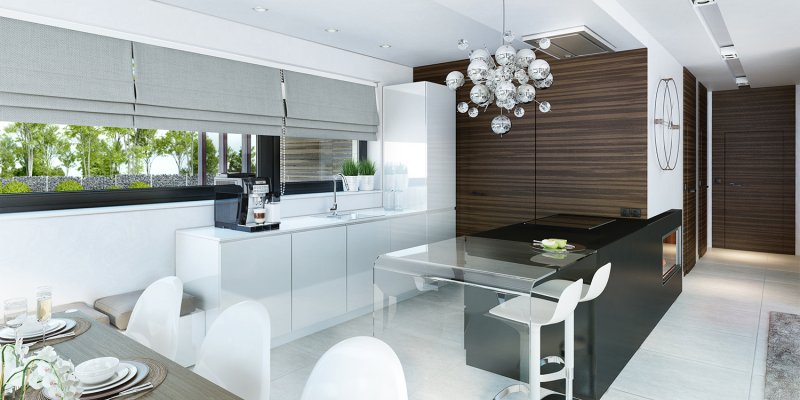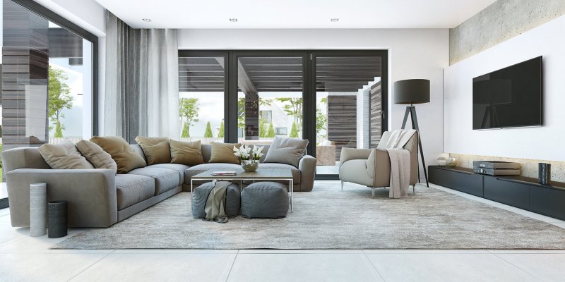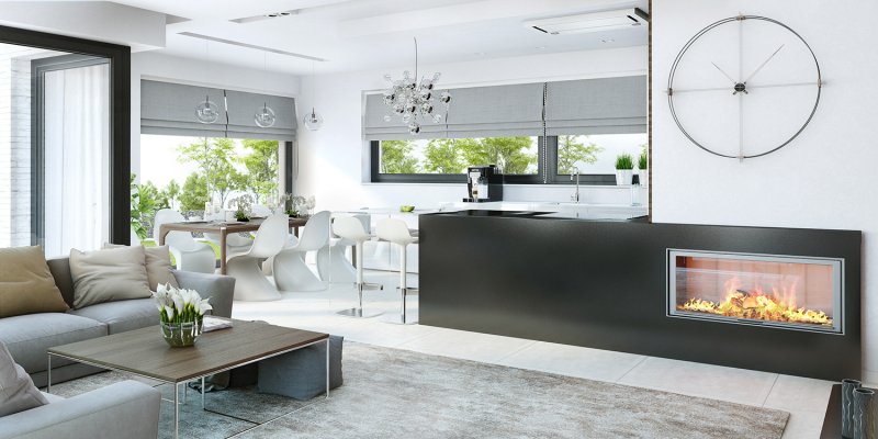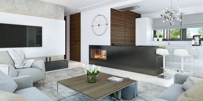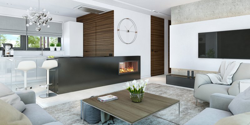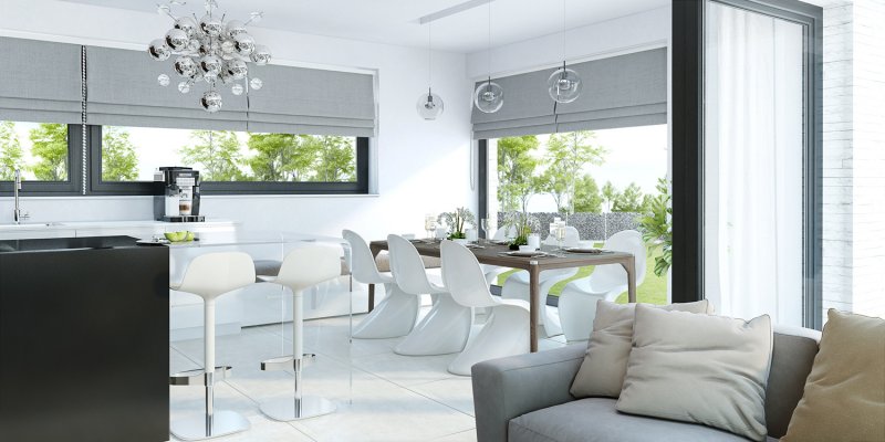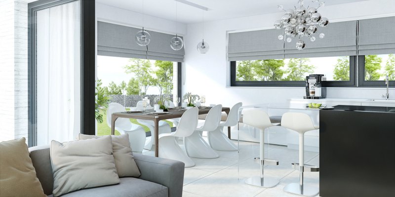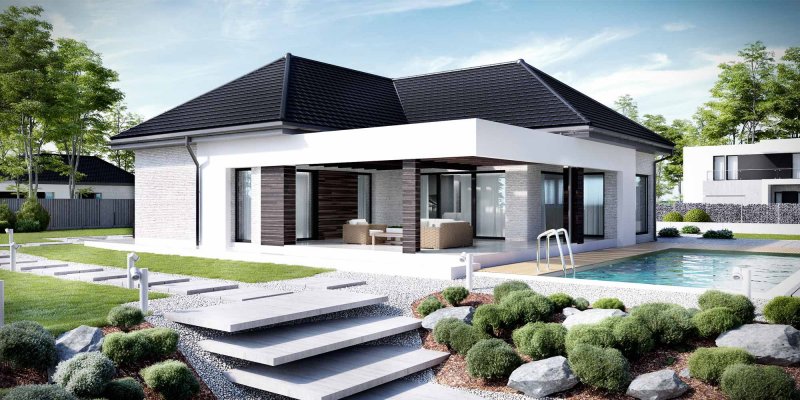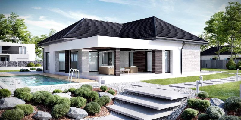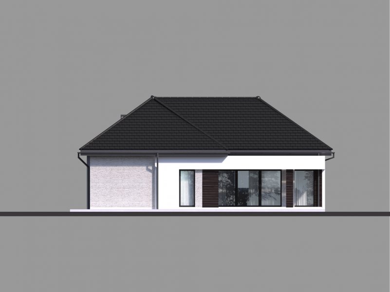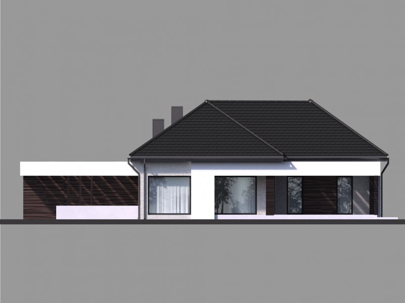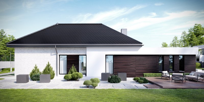 Projekt zachowuje to, co najcenniejsze z pierwowzoru – duże przeszklenia, dzięki którym wnętrze pełne jest naturalnego światła, oraz zachwycające rozwiązanie elewacji. W projekcie HomeKoncept 32 jednostanowiskowy garaż zdobi z zewnątrz ciemna deska elewacyjna, którą skomponowano z jasnym kamieniem. Całości dopełnia geometryczny biały detal oraz unikatowe rozwiązanie belkowania nad wejściem i przyjemnym, dużym tarasem.