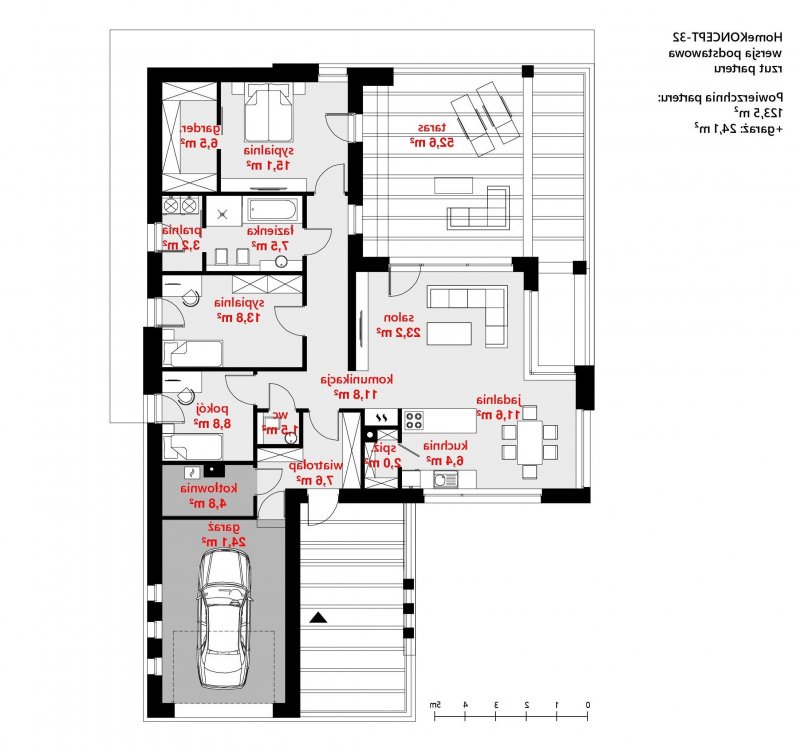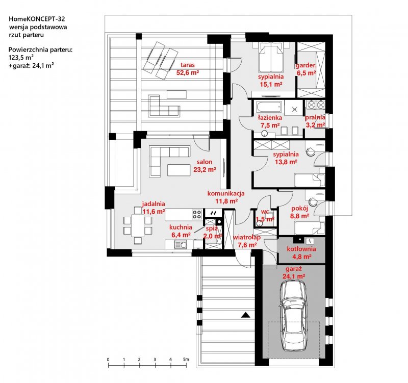 HomeKoncept 32 to najmniejszy wariant wyjątkowego domu HomeKoncept 26, idealny dla nielicznej rodziny. Na niewielkiej powierzchni użytkowej zaprojektowano naprawdę funkcjonalne wnętrze z wyraźnym podziałem na dzienną oraz intymną strefę domowników. Do dyspozycji mieszkańców są dwie sypialnie oraz gabinet. Zadbano również o pomieszczenia dodatkowe, takie jak spiżarnia, pralnia czy garderoba przy dużej sypialni.