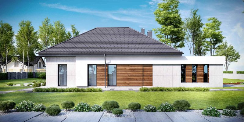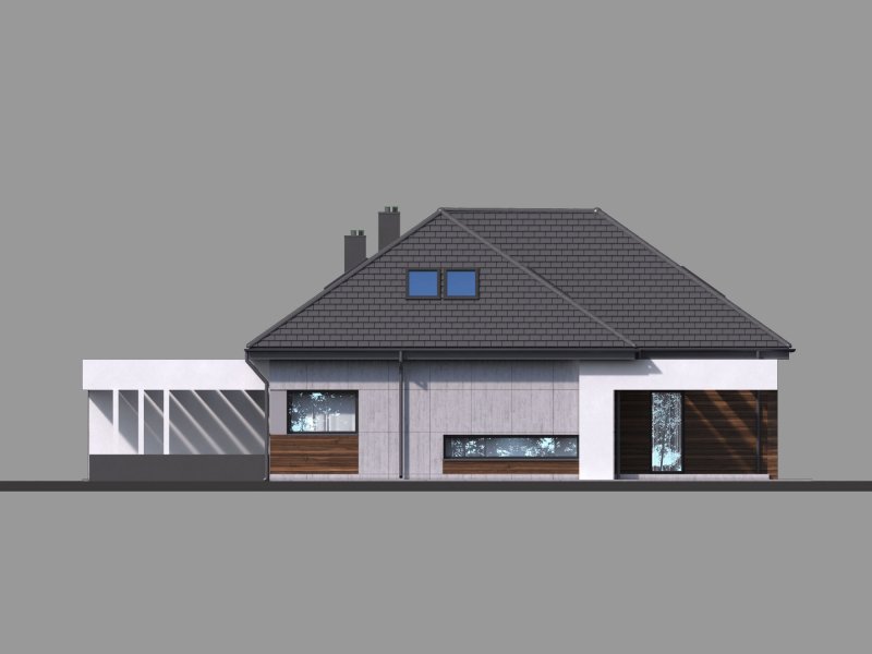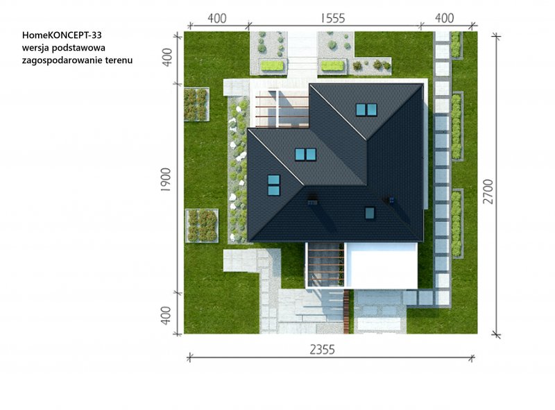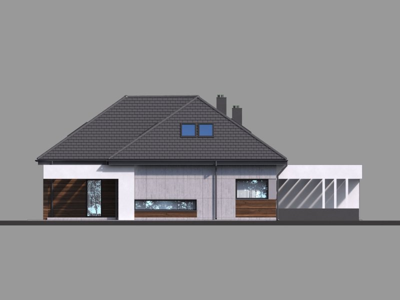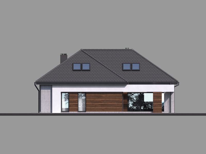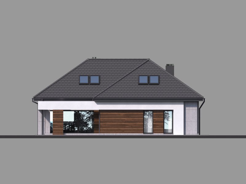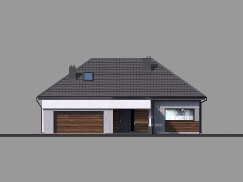 HomeKoncept-33 to wariant domu HomeKoncept-31 w którym zaadoptowane zostało poddasze, zachowując wszystko to, co czyni ten dom tak wyjątkowym. Od strony elewacji ogrodowej zachwyca taras skryty pod charakterystycznym belkowaniem, a od frontu – subtelnie wydzielone wejście osłonięte pergolą. Zestawienie betonowych płyt elewacyjnych z drewnem tworzy piękną oprawę domu. Duże przeszklenia w salonie oraz podłużne okno w jadalni gwarantują odpowiednie doświetlenie całej części dziennej. Kuchnia, jadalnia i salon tworzą jedno, przestronne pomieszczenie. Przy kuchni zaprojektowana została praktyczna spiżarnia. Ponadto, parter ma do zaoferowania domownikom dwie sypialnie, dużą łazienkę oraz gabinet.