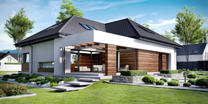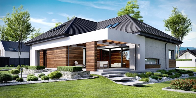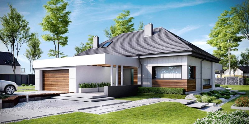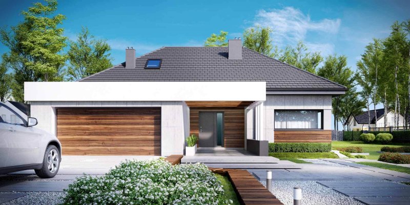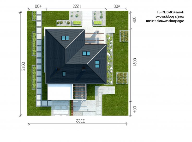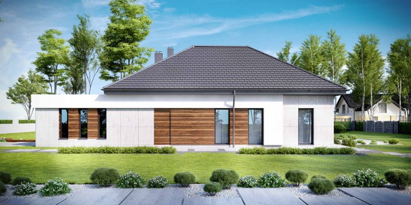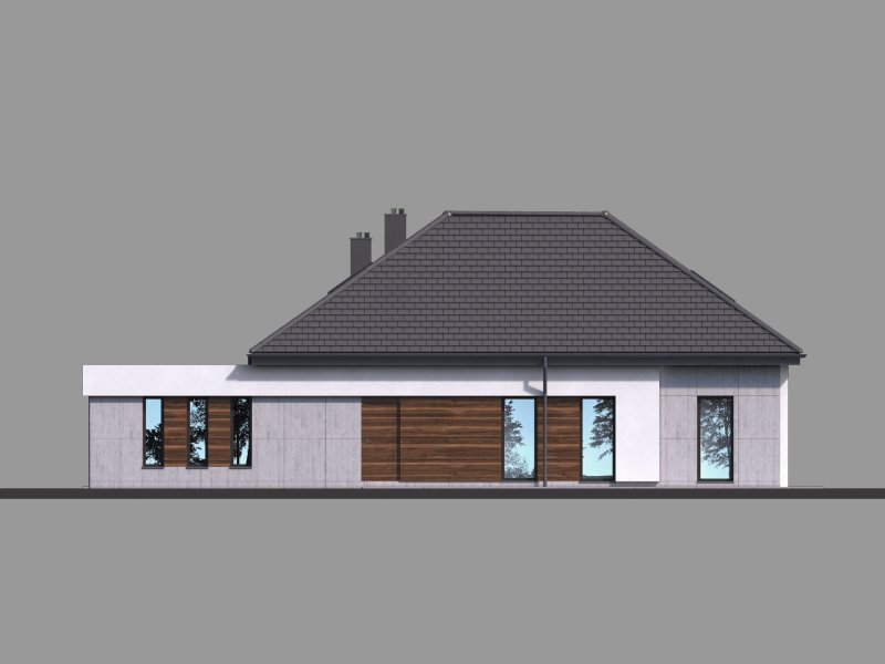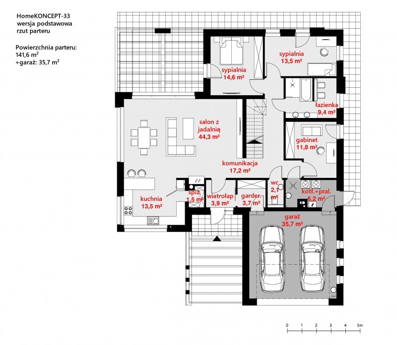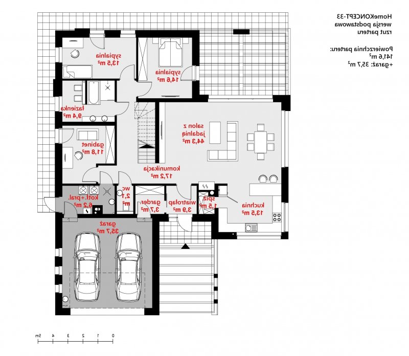HomeKoncept-33 to wariant domu HomeKoncept-31 w którym zaadoptowane zostało poddasze, zachowując wszystko to, co czyni ten dom tak wyjątkowym. Od strony elewacji ogrodowej zachwyca taras skryty pod charakterystycznym belkowaniem, a od frontu – subtelnie wydzielone wejście osłonięte pergolą. Zestawienie betonowych płyt elewacyjnych z drewnem tworzy piękną oprawę domu. Duże przeszklenia w salonie oraz podłużne okno w jadalni gwarantują odpowiednie doświetlenie całej części dziennej. Kuchnia, jadalnia i salon tworzą jedno, przestronne pomieszczenie. Przy kuchni zaprojektowana została praktyczna spiżarnia. Ponadto, parter ma do zaoferowania domownikom dwie sypialnie, dużą łazienkę oraz gabinet.