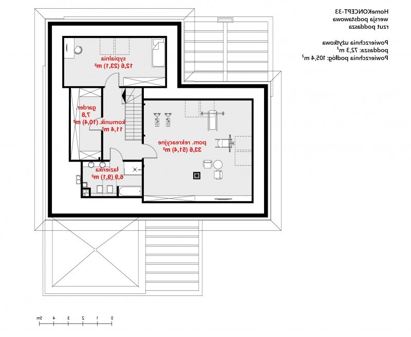 Poddasze doskonale sprawdzi się jako intymna strefa rodziców lub miejsce dla gości. Znajdziemy tu przestronną sypialnię, dużą garderobę i łazienkę. Zaletą tego projektu jest duże pomieszczenie rekreacyjne, które można dowolnie zaaranżować.