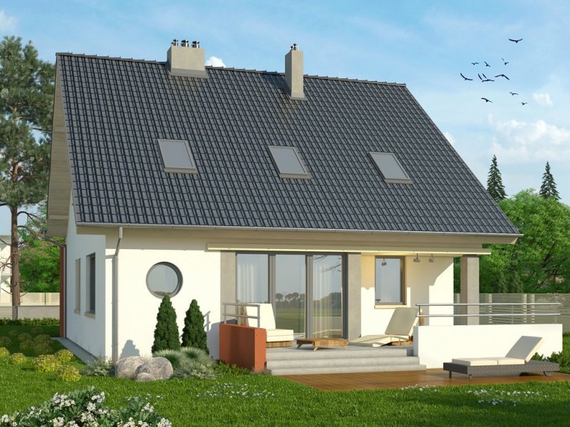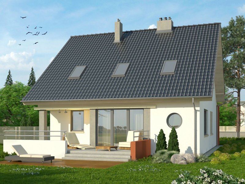 Ściany budynku zaprojektowano z betonu komórkowego zdociepleniem lub w innej technologii w ramach adaptacji. Stropgęstożebrowy, więźba drewniana, pokrycie dachówką ceramicznąlub cementową. Inne pokrycia w ramach adaptacji. Elewacjetynkowane, cokoły tynkowane, balustrady stalowe.