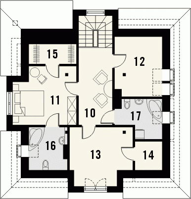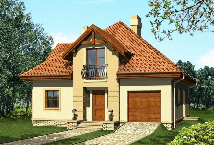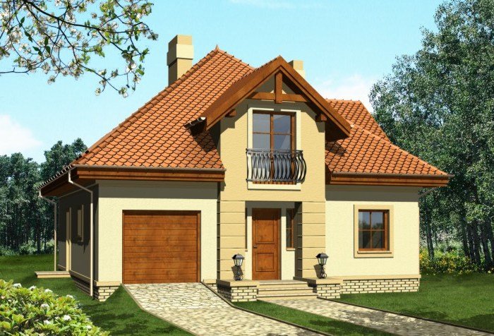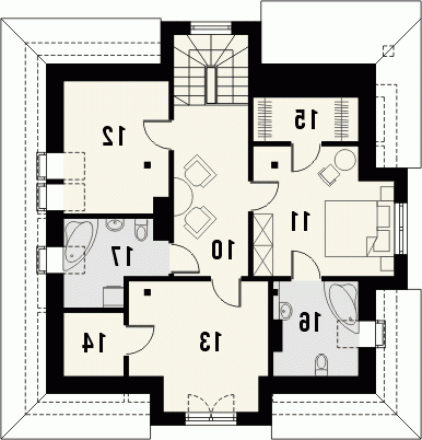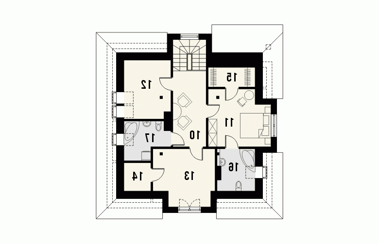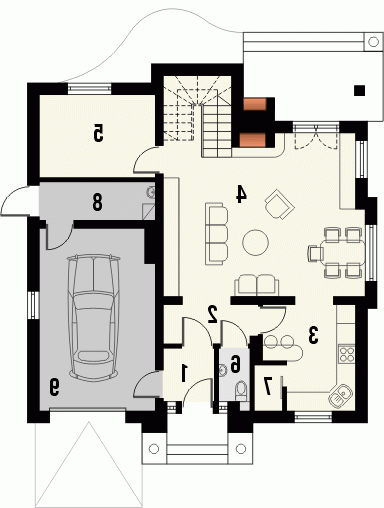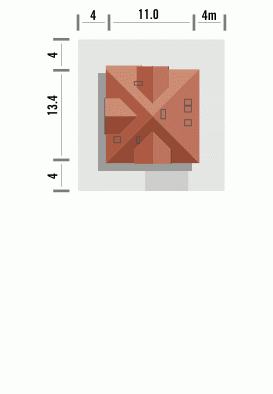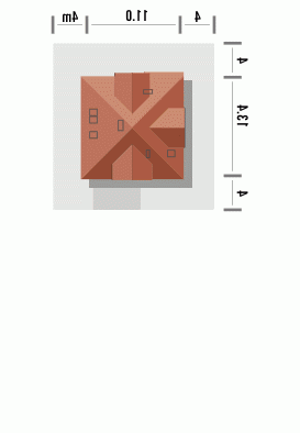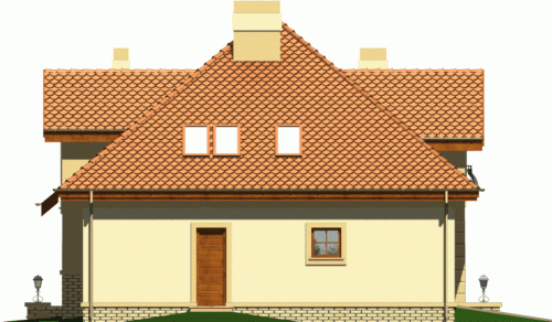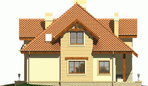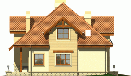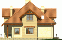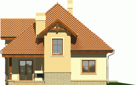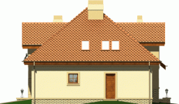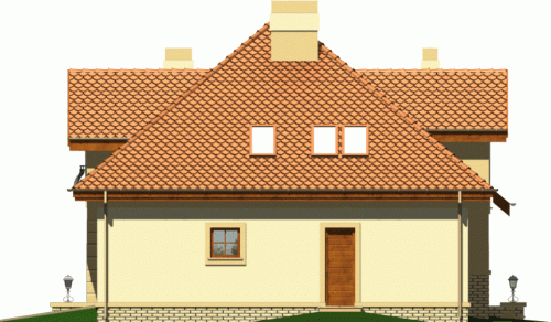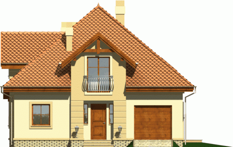 Budynek niepodpiwniczony piętrowy z wbudowanym garażem jednostanowiskowym. Na parterze znajduje się salon z kominkiem i kuchnia z oknem wychodzącym na strefę przedwejściową domu. Przy schodach prowadzących na górna kondygnację znajduje się dodatkowy pokój mogący pełnić także rolę gabinetu. Poprzez garaż dostępne jest pomieszczenie gospodarcze z bezpośrednim wyjściem na zewnątrz. Na piętrze pod dachem kopertowym umieszczono 3 sypialnie z garderobami oraz 2 łazienki. Dokumentacja dostępna również w odbiciu lustrzanym.