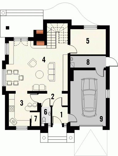Dom zwraca uwagę eleganckimi symetrycznymi fasadami i reprezentacyjnym wejściem. Wyjście na ogród prowadzi poprzez częściowo wsunięty pod podcień taras, który pozwala na kontakt z otaczającą zielenią bez względu na pogodę.