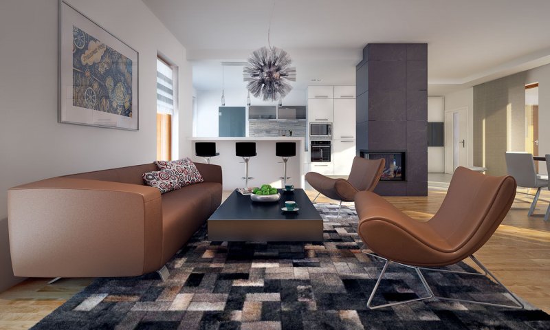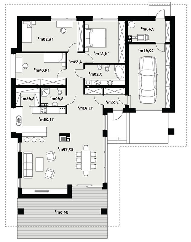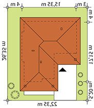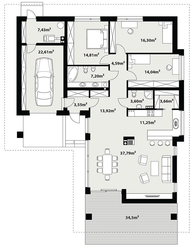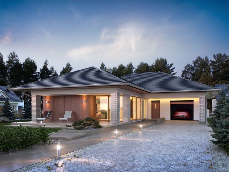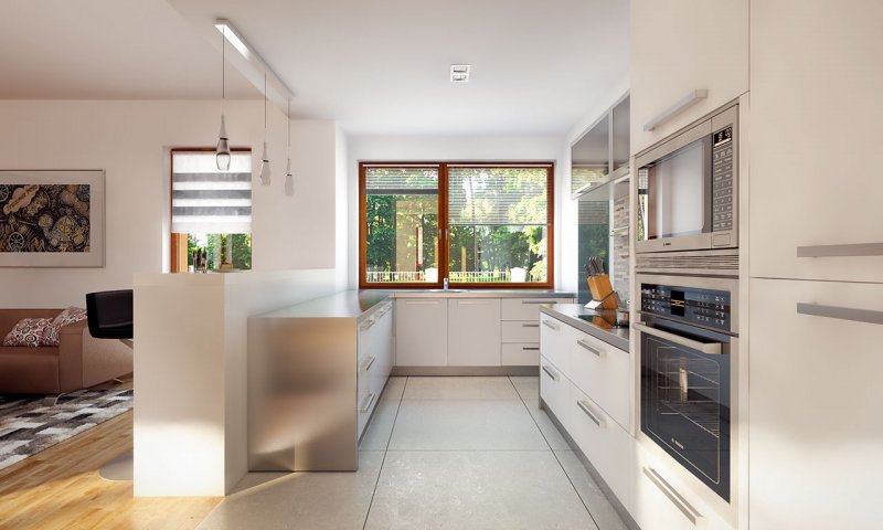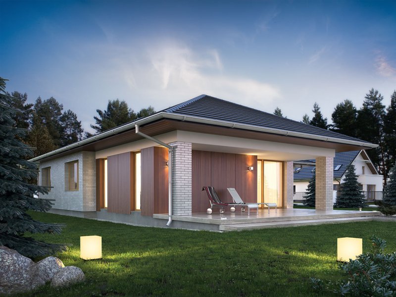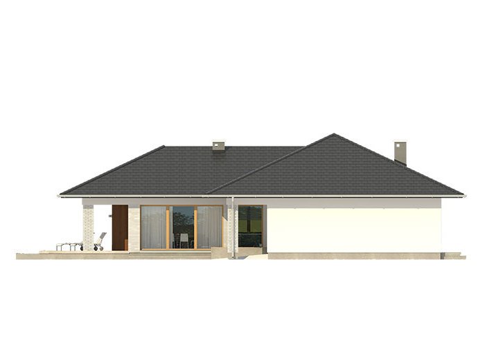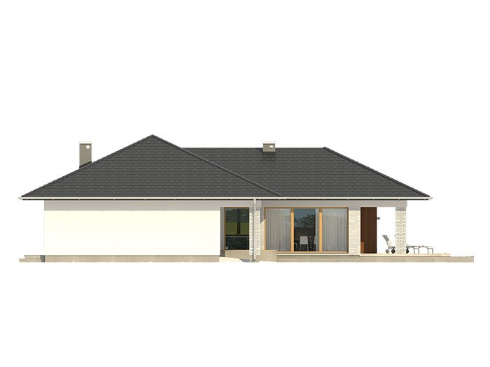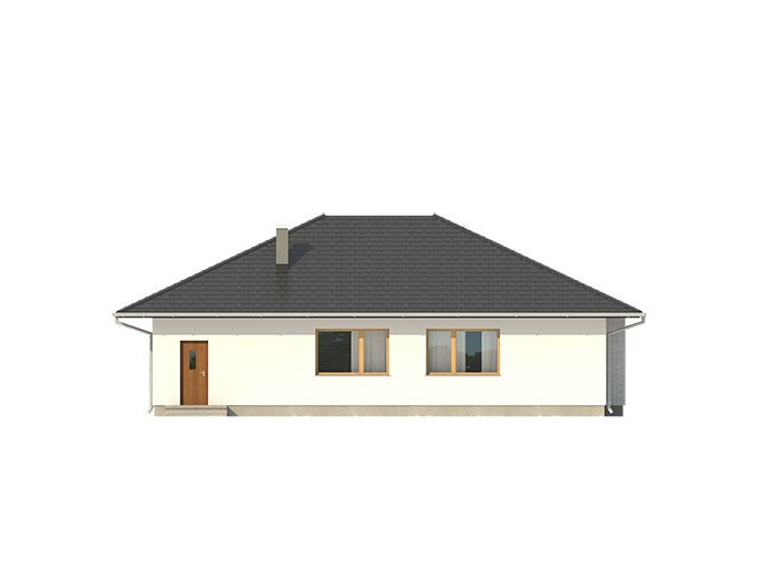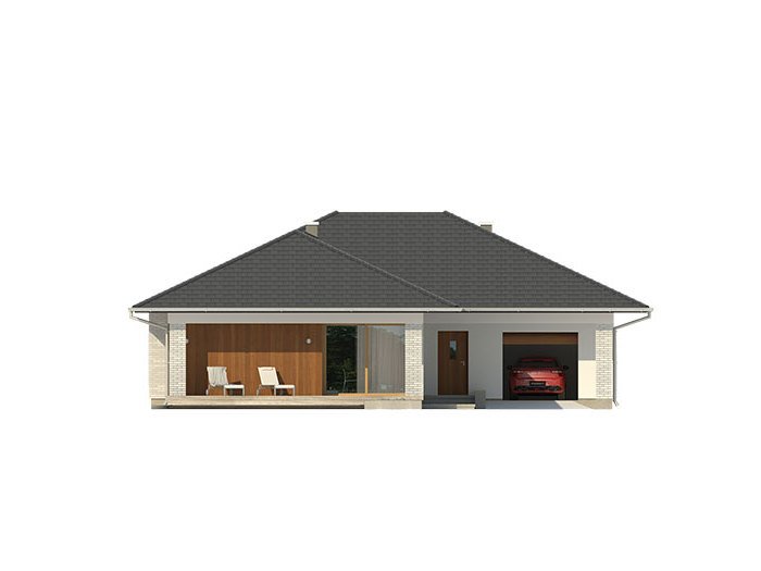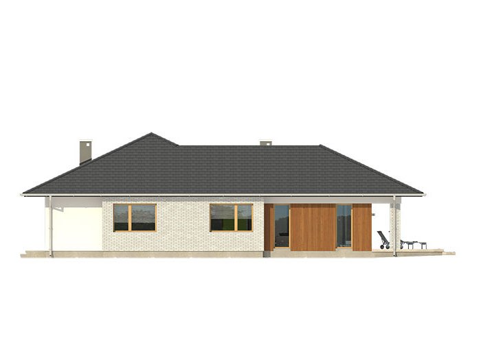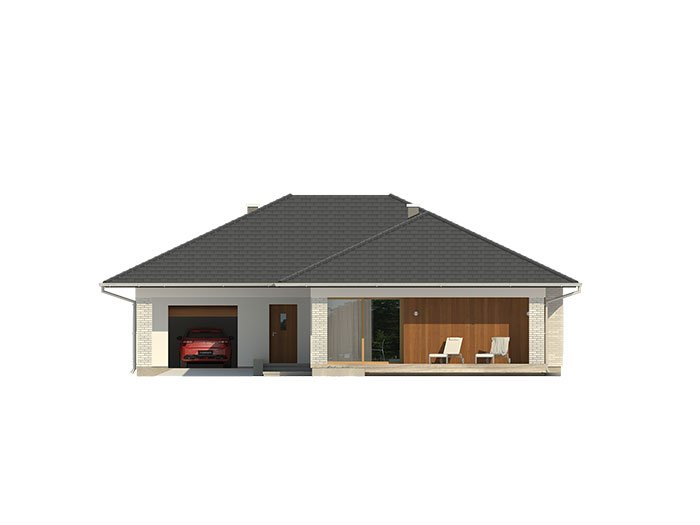 Parterowy dom jednorodzinny, niepodpiwniczony z jednostanowiskowym garażem. Jest to wygodny , funkcjonalny dom, który swoim pełnym programem zapewnia optymalny komfort 4-osobowej rodzinie. Przestronna część dzienna to salon połączony z jadalnią, otwierający się na ogród poprzez ogromne przeszklenie oraz otwarta kuchnia wraz z półwyspem i ze spiżarnią. Tak zaproponowany, ciekawy i przestronny układ pomieszczeń umożliwia szereg aranżacji. Część nocna to 3 wygodne sypialnie oraz przestronna łazienka. W domu zaprojektowano dużą kotłownię dostępną z garażu, której parametry pozwalają na montaż kotła na każdy rodzaj paliwa, w tym na paliwo stałe. Sam garaż, którego wielkość przekracza parametry standardowego garażu jednostanowiskowego, umożliwia umieszczenie tam np. kosiarki. Ten optymalny i ciekawy program funkcjonalny został ujęty w prostej bryle na rzucie litery L, przykrytej wielospadowym dachem. Atutem projektu jest jego prostota zarówno w układzie pomieszczeń jak i w rozwiązaniach elewacji, gdzie elegancki, nowoczesny styl osiągnięto poprzez klasyczne, proste ale szlachetne materiały oraz delikatny, subtelny detal.