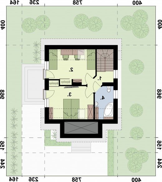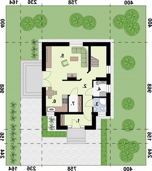 "La Pampa" Projekt bardzo zgrabnego domu jednorodzinnego, niepodpiwniczonego, ale posiadającego możliwość adaptacji kotłowni na węgiel. Wejście główne do domu zostało umieszczone w ryzalicie, przełamującym monotonię elewacji frontowej. Ten niewielki domek został tak stworzony, by stanowić wygodne i ekonomiczne rozwiązanie. Na powierzchni użytkowej 86,15 m2 przewidziano bowiem aż jedenaście pomieszczeń. Gdy wejdziemy do domu, okaże się, że w całym wykuszu urządzono ogromny przedsionek, gdzie znajdzie się wiele miejsca na wierzchnie okrycia, czy buty. Z przedsionka przechodzimy do komunikacji, gdzie od razu po lewej stronie mamy dwoje drzwi – pierwsze prowadzą do łazienki z kabiną prysznicową, drugie – do kotłowni. Na parterze mamy także kuchnię połączoną z uroczą jadalnią, znajdującą się tuż obok wyjścia na taras. Bezpośrednie sąsiedztwo kuchni ze spiżarnią, ułatwi przygotowywanie posiłków, ponieważ pozwala na natychmiastowy dostęp do przechowywanych tam domowych zapasów. Najważniejszym pomieszczeniem tej części domu będzie natomiast pokój dzienny, gdzie rodzina może się spotkać w chłodne dni przy rozpalonym kominku. Wspomniany taras znajduje się od strony północnej domu, jego lokalizacja daje duże możliwości organizacji przyjęć na wolnym powietrzu. W projekcie La Pampa klatka schodowa w wyraźny sposób oddziela część dzienną domu (na parterze) od części nocnej, usytuowanej na poddaszu. Piętro domu charakteryzuje się bardzo małą komunikacją, co pozwoliło stworzyć dodatkową przestrzeń dla pozostałych pomieszczeń – mamy tutaj ogromną łazienkę z wanną oraz dwa ogromne pokoje, z których każdy posiada osobne wyjście na niewielkie balkony wychodzące na północ domu, a więc umieszczone nad tarasem. Jeżeli szukasz domu ekonomicznego, taniego w budowie i eksploatacji, a zarazem ładnego, to projekt La Pampa spełni Twoje oczekiwania.