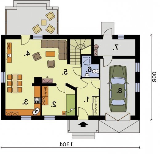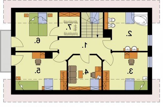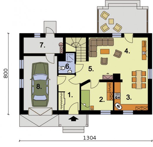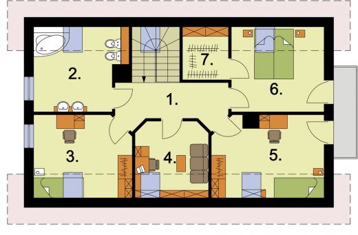 "Lamia" Projekt domku jednorodzinnego Lamia zachwyca swą prostotą i elegancją. Został zaprojektowany tak, by stanowić komfortowe rozwiązanie nawet dla pięcioosobowej rodziny. Wejście do domku zostało umieszczone pod niepozornym daszkiem, który stanowi przedłużenie dachu. Dwa okna wychodzące na południe, dodają elewacji frontowej wiele uroku. Z lewej strony przodu domu przewidziano jednostanowiskowy garaż. Na uwagę zasługuje fakt, iż w całym projekcie nacisk został położony na funkcjonalność całej konstrukcji opartej na prostej bryle. Wiatrołap, do którego wchodzimy po przekroczeniu progu domu, możemy zaopatrzyć w praktyczną garderobę. Stąd, kierując się na lewo, możemy przejść do jednostanowiskowego garażu, gdzie przewidziano miejsce na kotłownię, posiadającą odrębne wyjście na podwórze. Z wiatrołapu można także przejść do komunikacji spajającej pozostałe pomieszczenia parteru. Od razu po lewej stronie, tuż obok klatki schodowej przewidziano miejsce na niewielką łazienkę. Do ściany południowej domu przylega niewielki pokoik, który możemy urządzić zgodnie z potrzebami domowników (np. jako pokój telewizyjny, gabinet, czy sypialnię). Pozostałe trzy pomieszczenia parteru, mimo swej odrębności, stanowią wspaniały zespół, w którym znalazło się miejsce na kuchnię z aneksem jadalnym oraz na obszerny pokój dzienny. Możemy stąd udać się na przestronny, cichy taras, umieszczony z tyłu domu. Poddasze domu natomiast zajmuje ogromna łazienka z miejscem na wannę oraz cztery pokoje. Pierwszy z nich, sąsiadujący z łazienką, jest oświetlany przez dwa okna – tradycyjne i połaciowe. Drugi – niewielki – posiada tylko okno połaciowe. Pozostałe dwa pokoje, oprócz okien połaciowych, mają także wyjście na balkon umieszczony od strony wschodniej domu. Sypialnia, przylegająca do ścian północnej i wschodniej, została dodatkowo wyposażona w garderobę. W projekcie Lamia wykorzystano zatem wiele ciekawych rozwiązań. Jest komfortowym, jednorodzinnym domem. Czyż ten projekt nie jest wart uwagi?