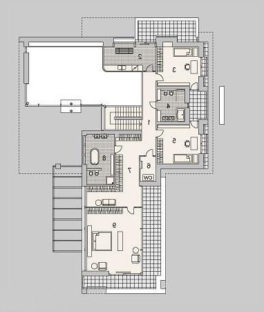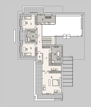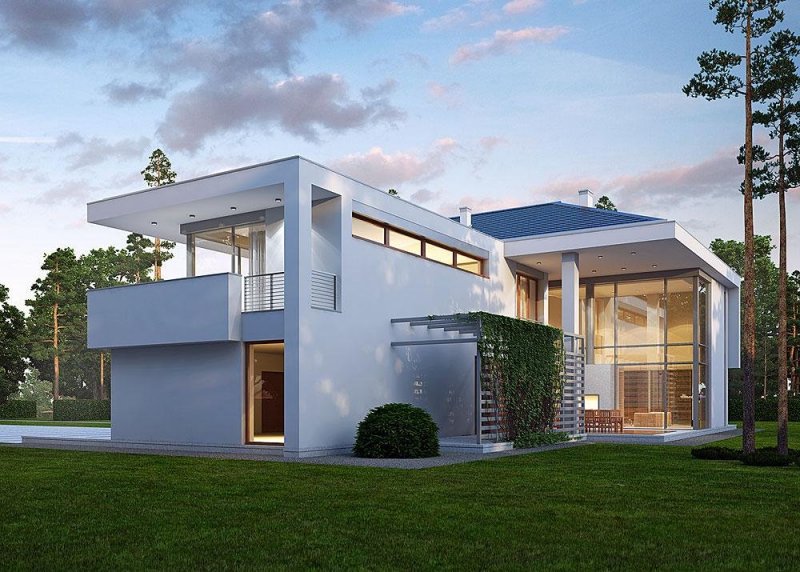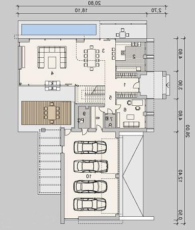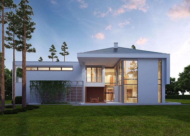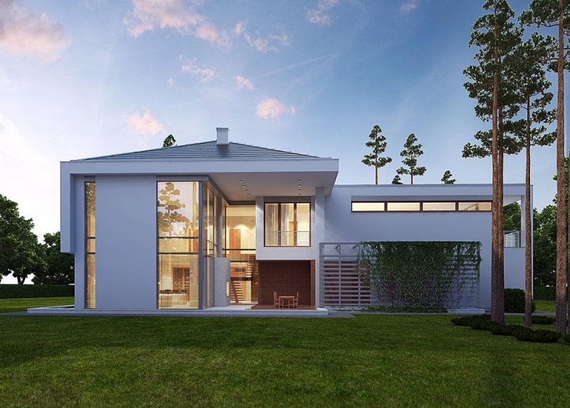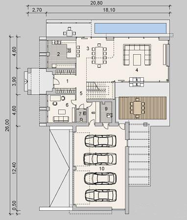 Plusem projektu jest oddzielenie strefy dziennej z salonem, kuchnią, jadalnią i gabinetem, od strefy nocnej z trzema sypialniami i dwoma łazienkami. Dodatkowym atutem jest również spory garaż mieszczący aż 4 stanowiska.