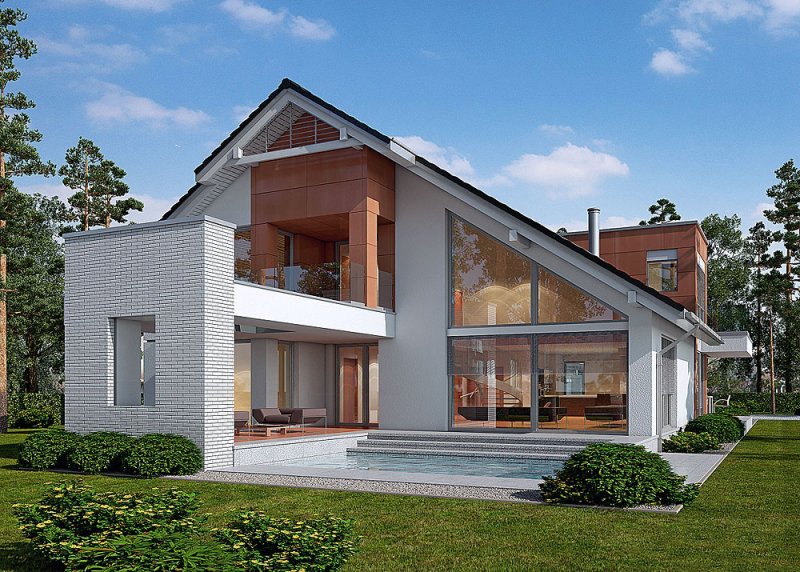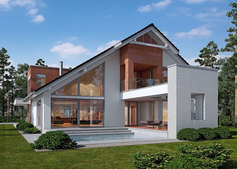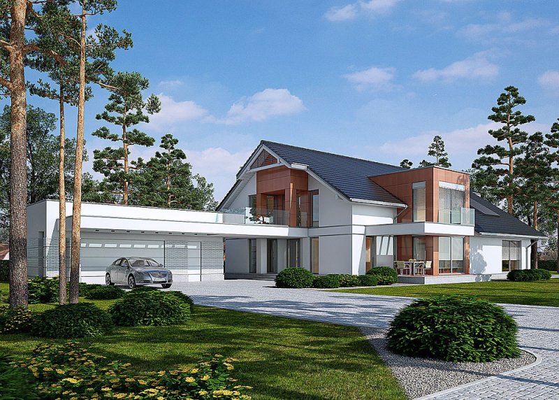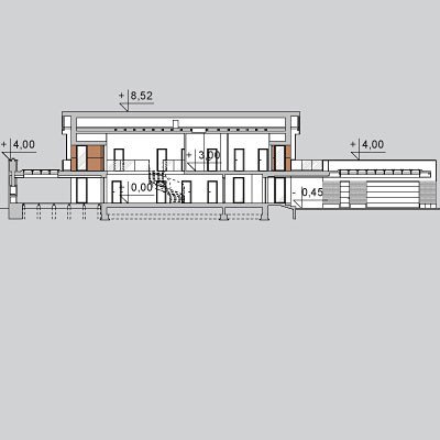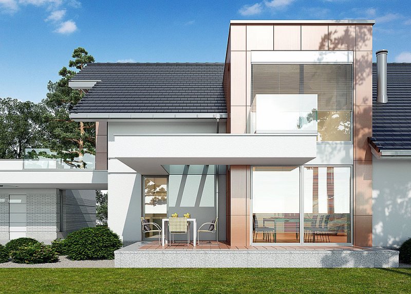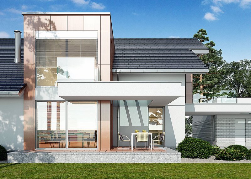 - Elewacje: wykończone tynkiem silikonowym, płytami fasadowymi Prodema - HPL, cokół tarasów wykończony kamieniem, klinkierem ceramicznym OSLO firmy ROBEN