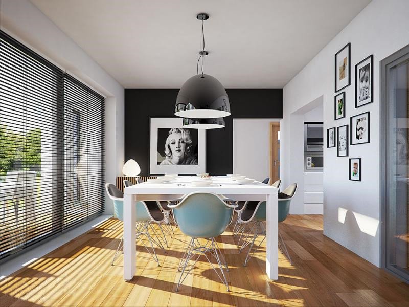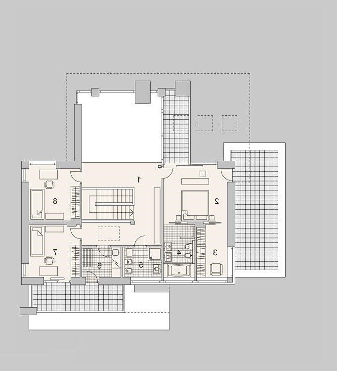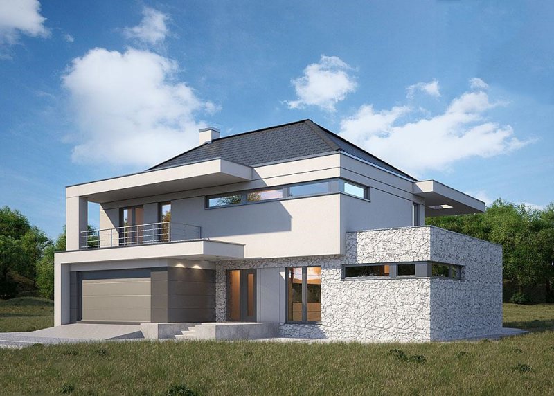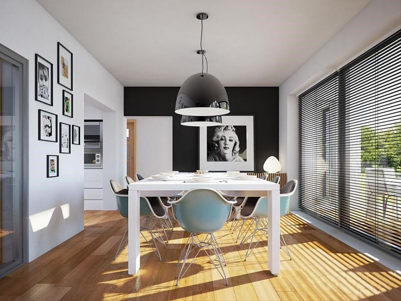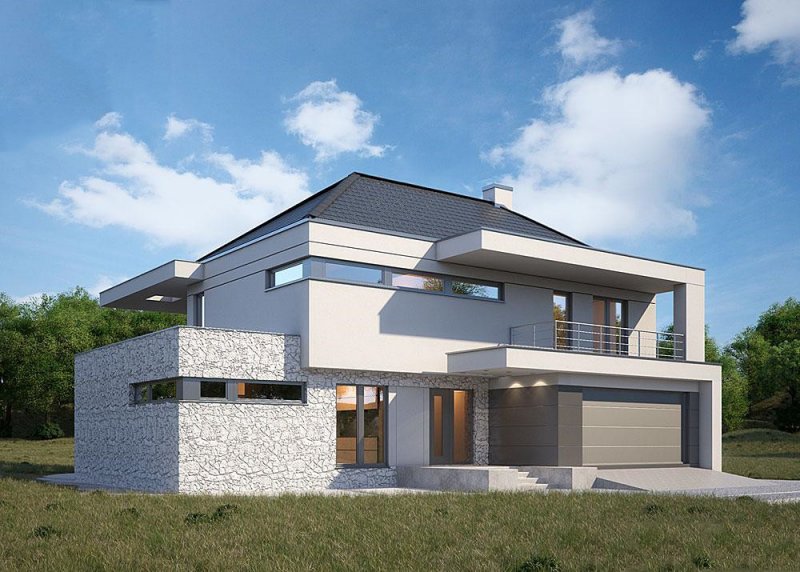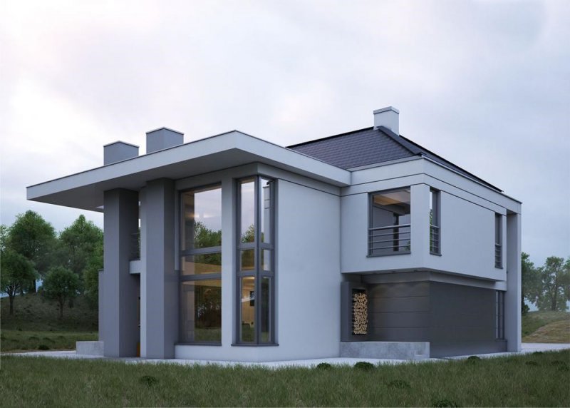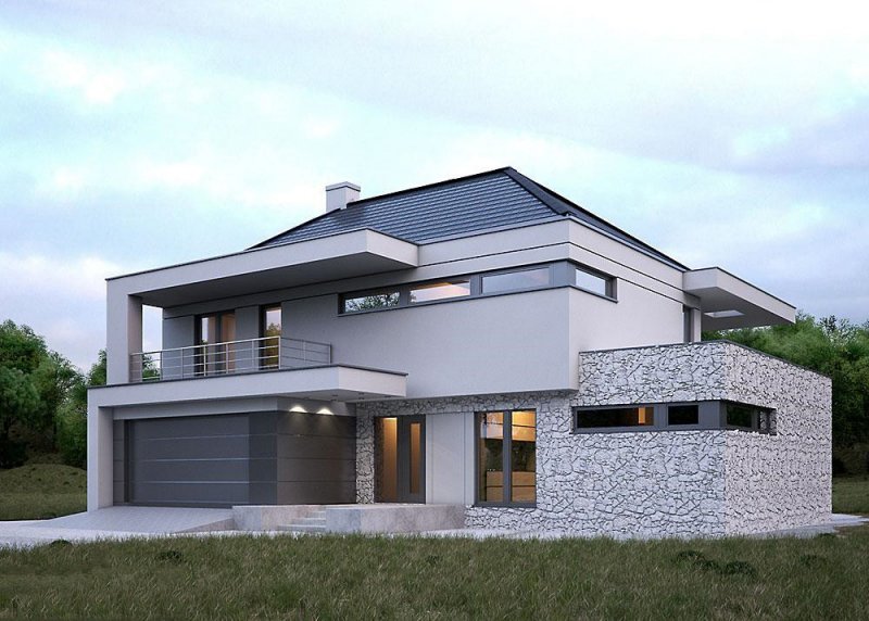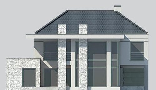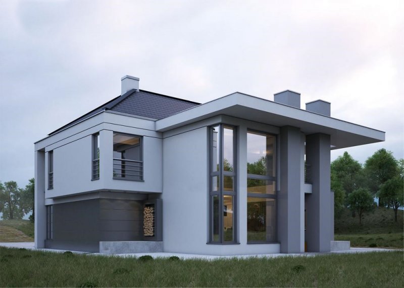LK&1131 to duży, nowoczesny dom, którego efektowna bryła skrywa w sobie bardzo funkcjonalne wnętrze. Na parterze znajduje się przestronna strefa dzienna, czyli kuchnia, jadalnia i przestronny salon. Nieco na uboczu znajduje się ustawny gabinet, który może również pełnić funkcję pokoju gościnnego. Niewątpliwie zaletą tego projektu jest wygodna spiżarnia przylegająca do kuchni. Na piętrze znajdziemy trzy sypialnie(w tym jedną z garderobą i łazienką) oraz łazienkę,a także pralnię.