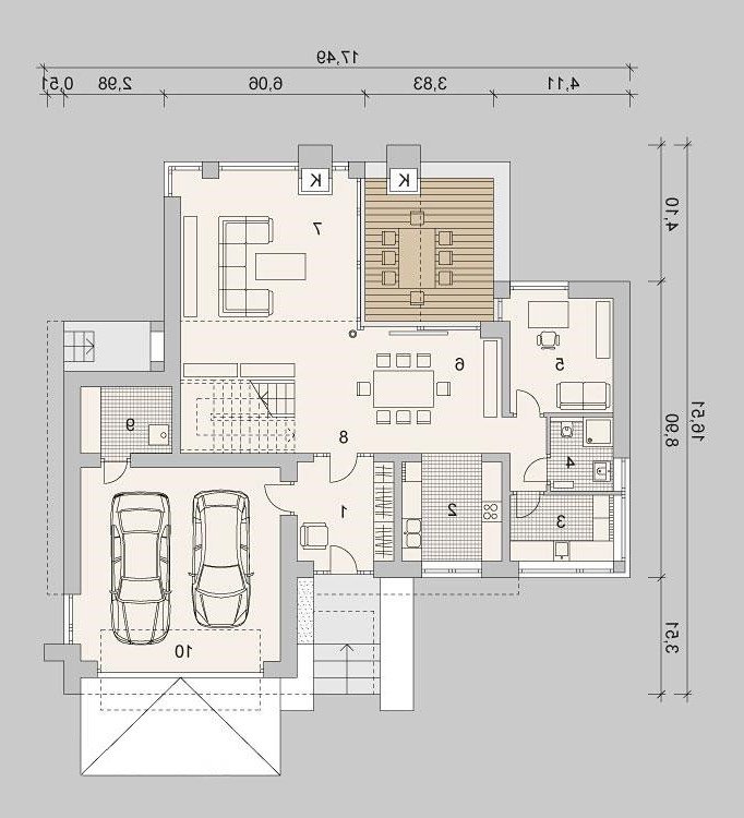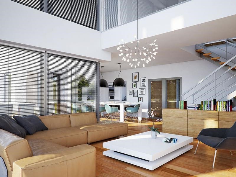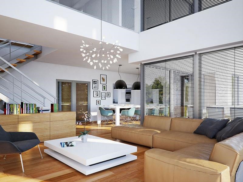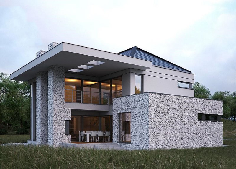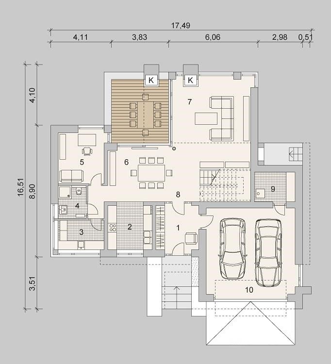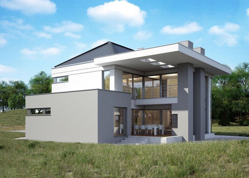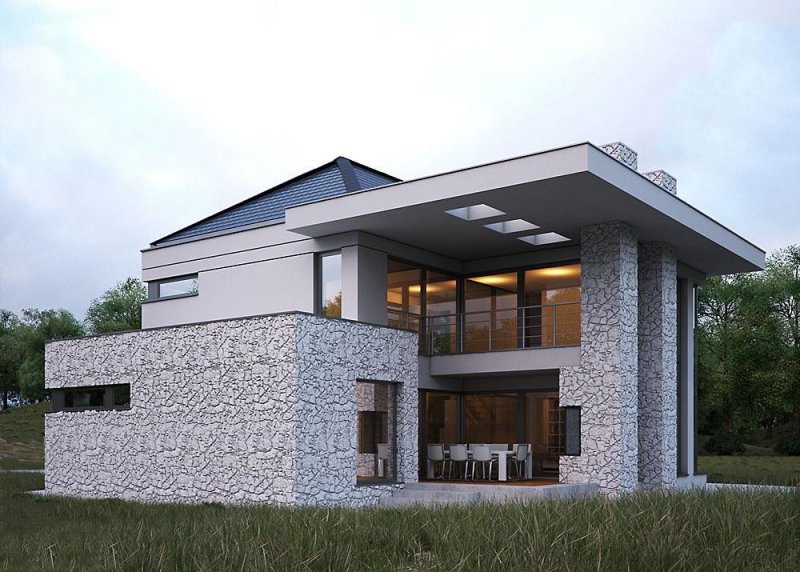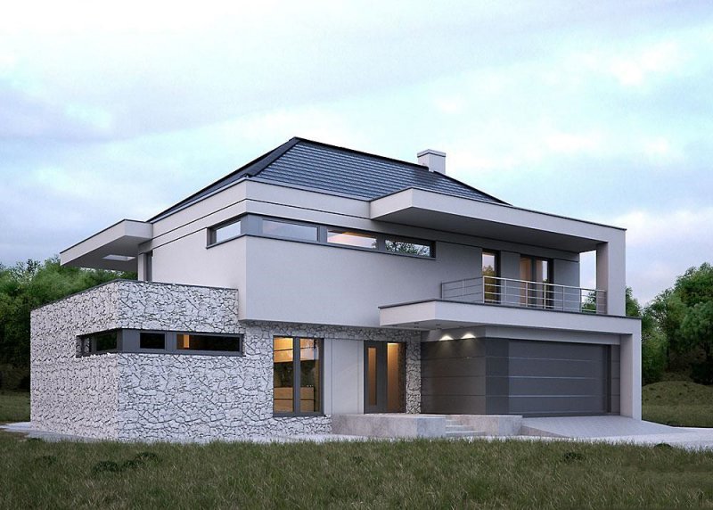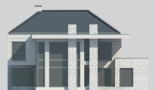 LK&1131 to duży, nowoczesny dom, którego efektowna bryła skrywa w sobie bardzo funkcjonalne wnętrze. Na parterze znajduje się przestronna strefa dzienna, czyli kuchnia, jadalnia i przestronny salon. Nieco na uboczu znajduje się ustawny gabinet, który może również pełnić funkcję pokoju gościnnego. Niewątpliwie zaletą tego projektu jest wygodna spiżarnia przylegająca do kuchni. Na piętrze znajdziemy trzy sypialnie(w tym jedną z garderobą i łazienką) oraz łazienkę,a także pralnię.