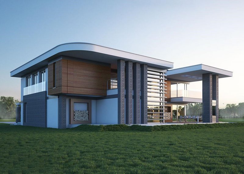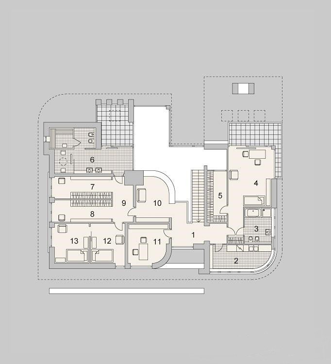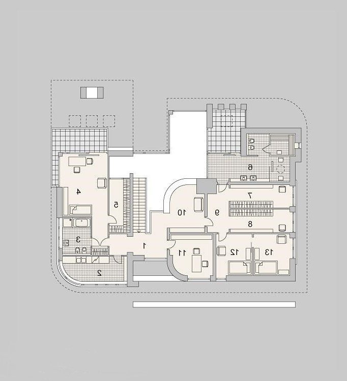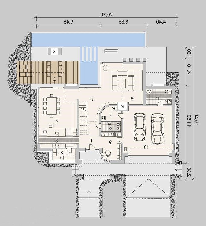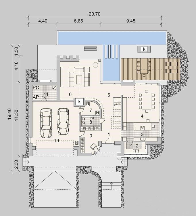 Projekt nowoczesnego domu z trzema sypialniami oraz aż trzema garderobami. Posiada miejsce przeznaczone na basen na zewnątrz budynku oraz małe patio.