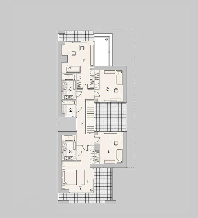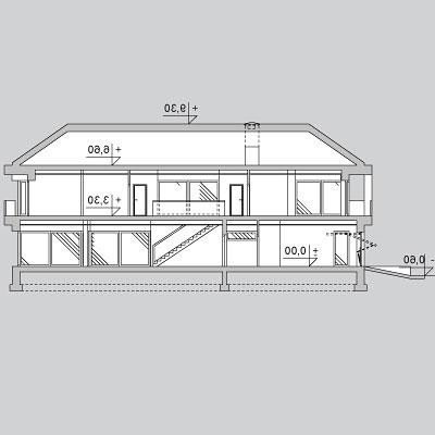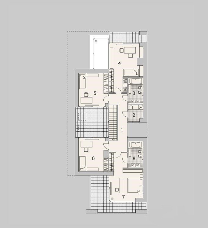 Nowoczesny dom parterowy. Posiada aż cztery sypialnie, dwie łazienki, WC, kotłownie, garderobę oraz pralnie. Przeznaczony dla rodziny 5-7 osobowej.